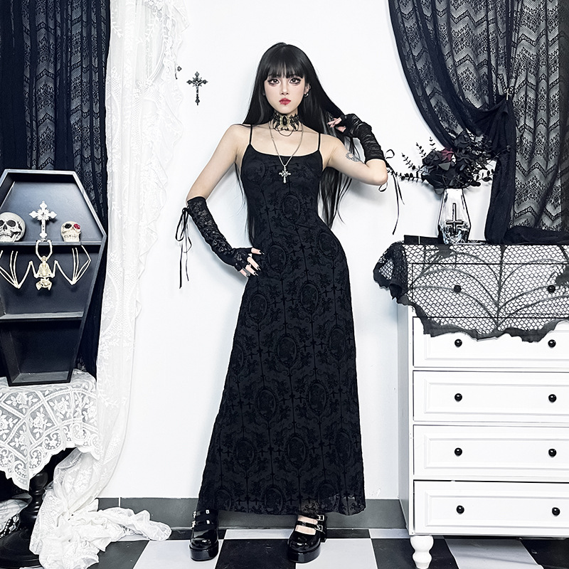 Yipinpay Dark Wind Sexual Personality Cross Flocking Suspenders Dress 2024 New Slim Bag Hip Skirt