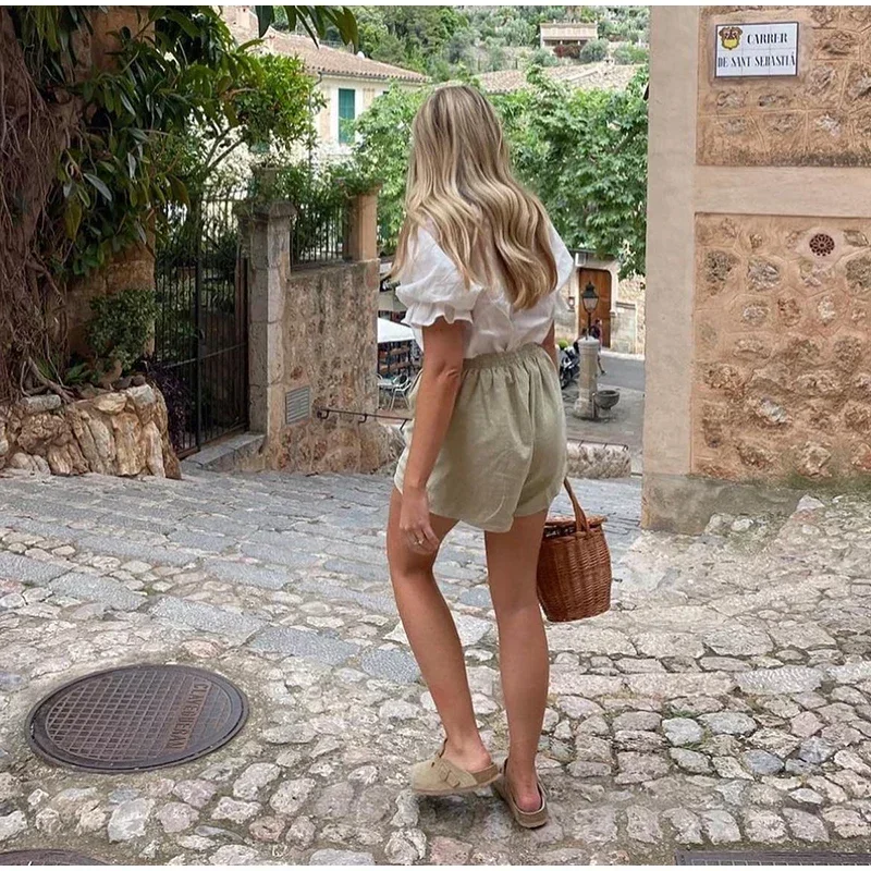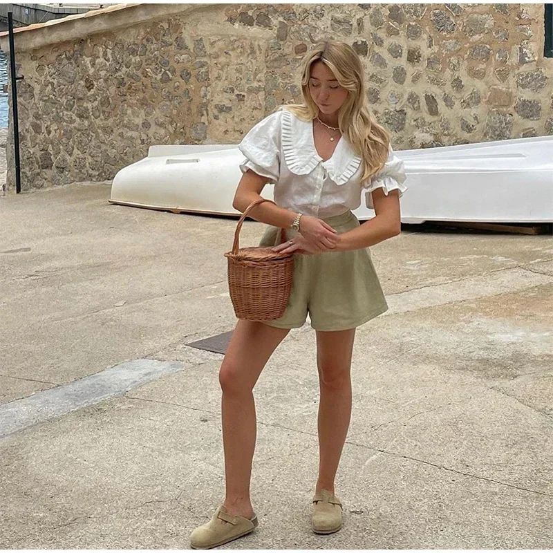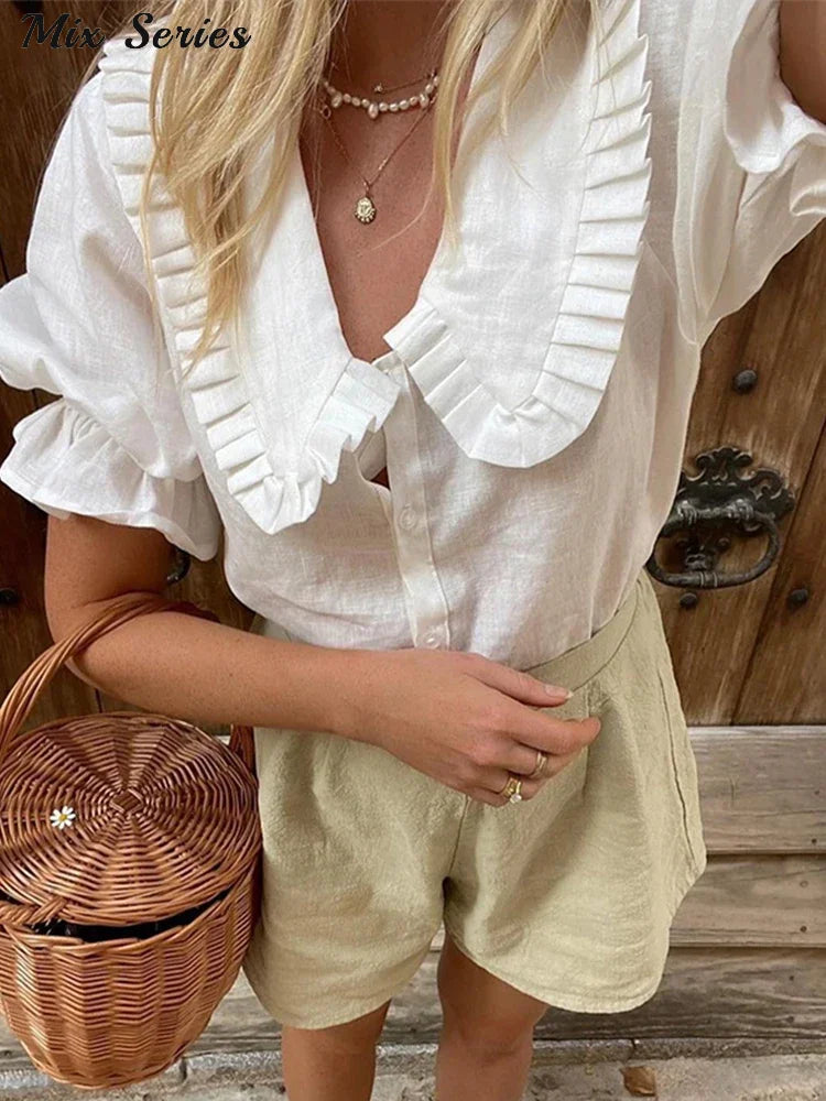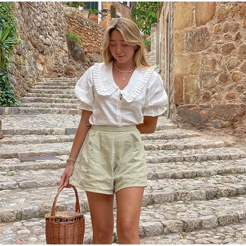 Yipinpay Doll Collar Shirts Shorts Suit Women Puff Short Sleeve Single Breasted Blouses Loose Short Pants 2024 Summer Casual Set