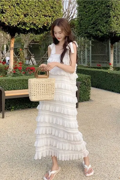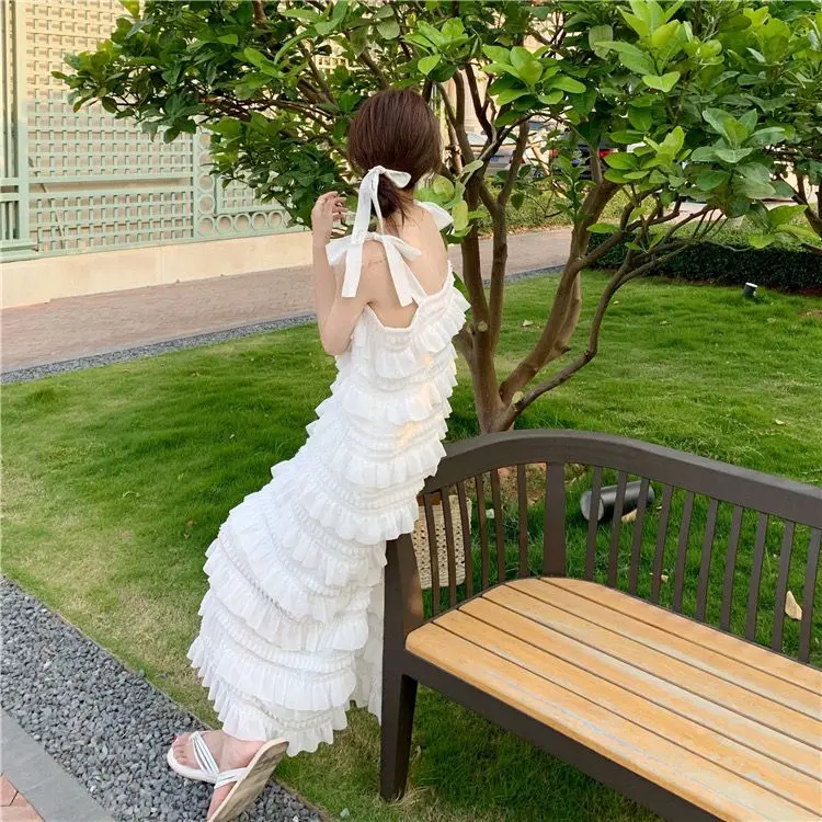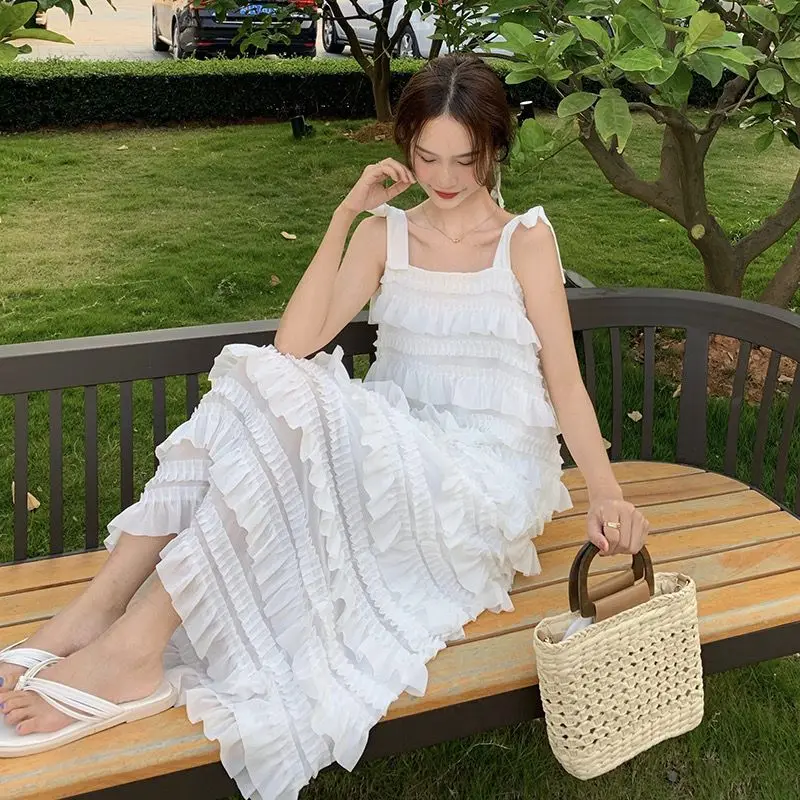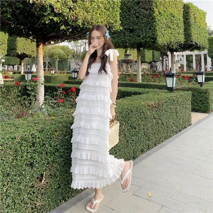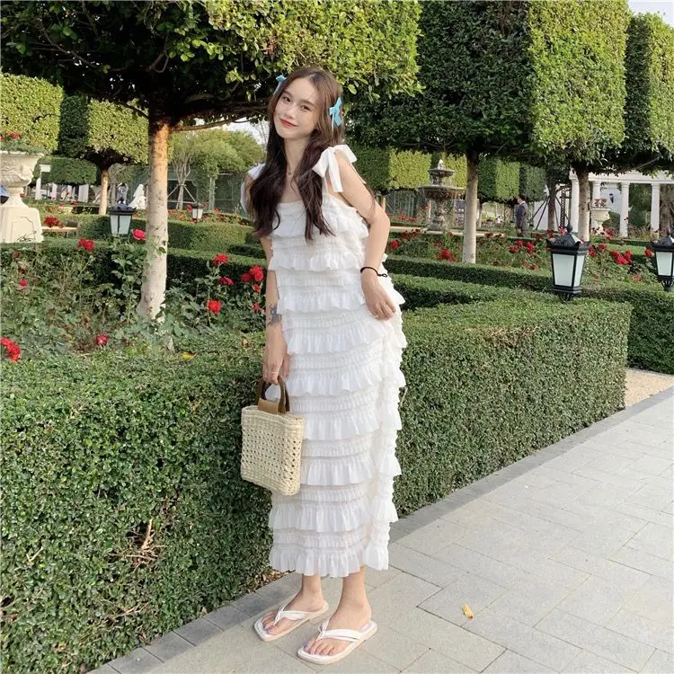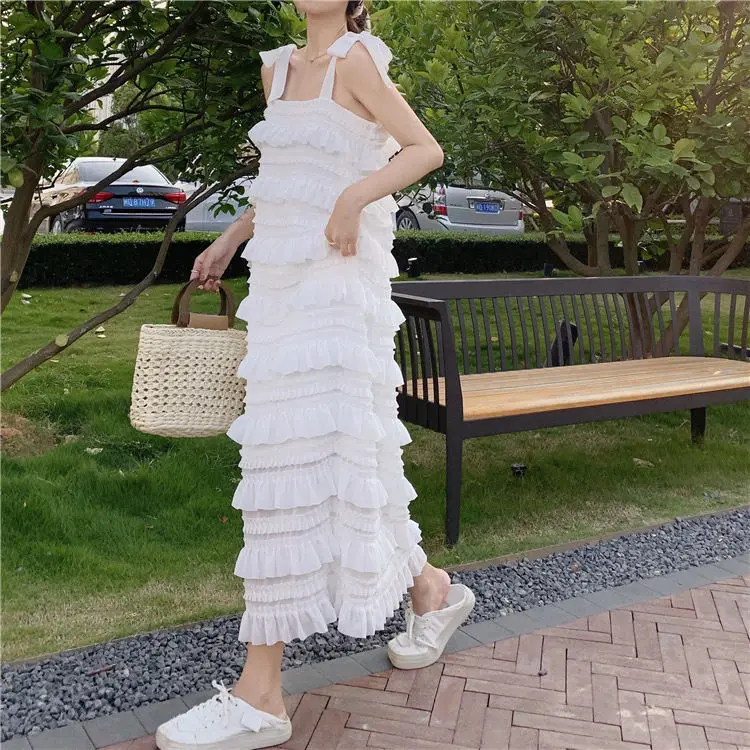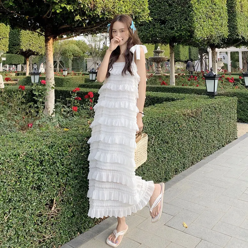 Yipinpay Dress 2023 Summer Fashion New Loose High Waist Strap Sleeveless Black Strapless Maxi Dresses Fairy Trendy White Cake Dress