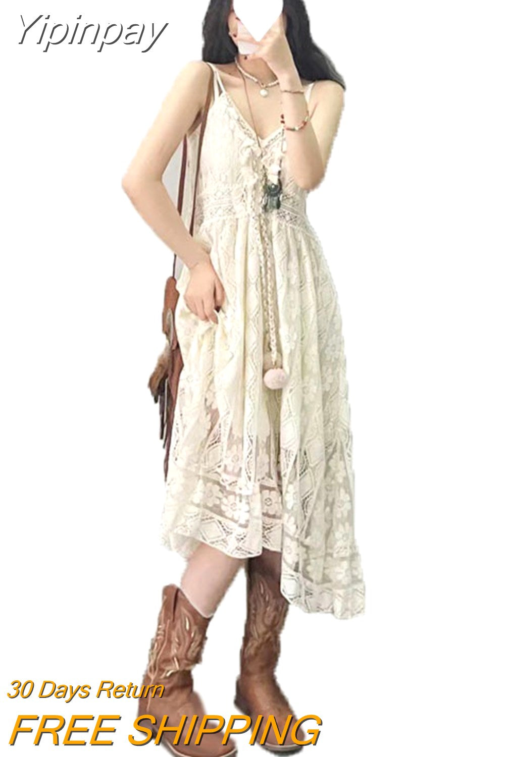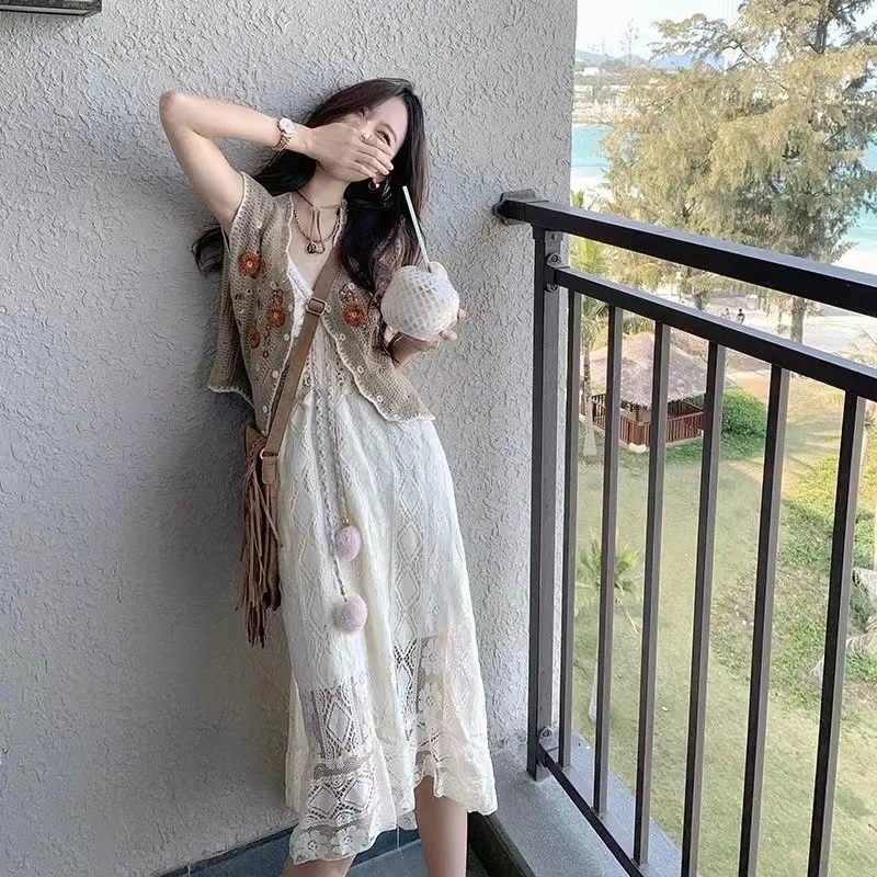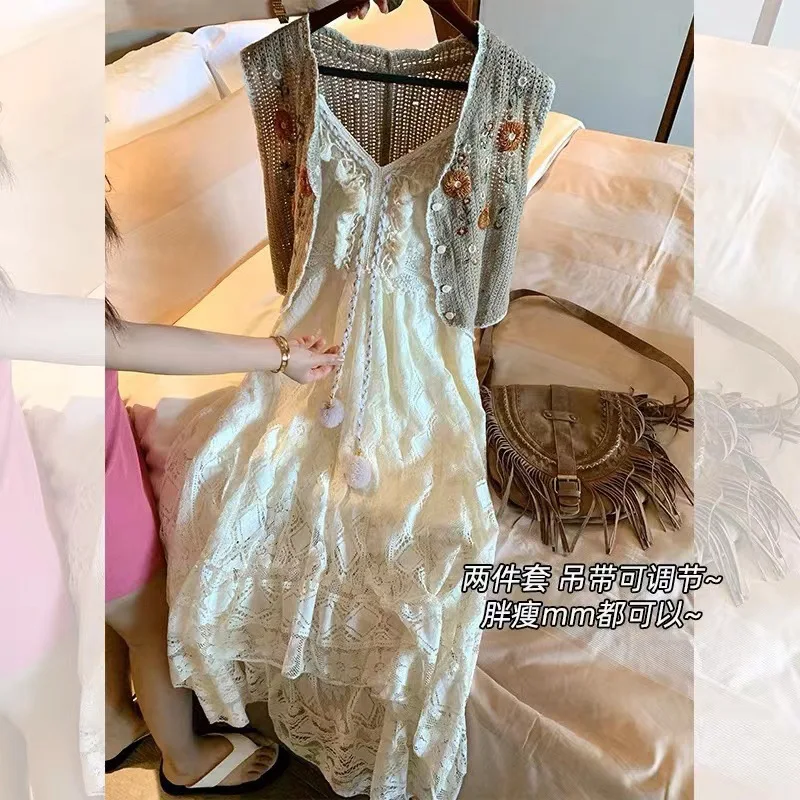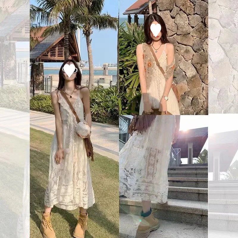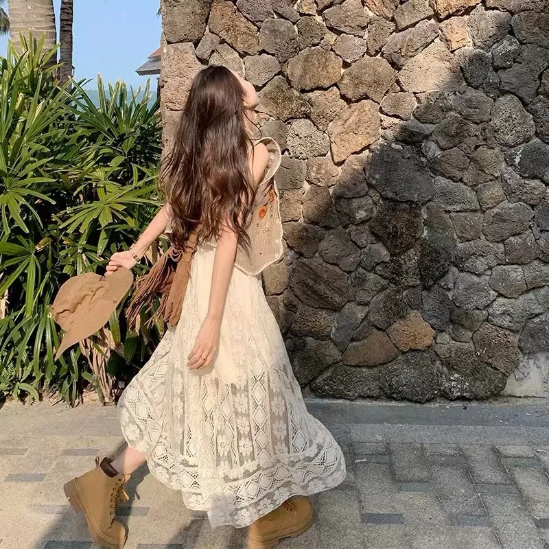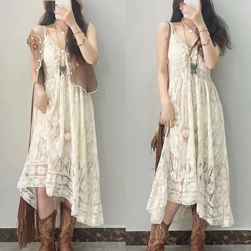 Yipinpay Dress Female 2024 New Lazy Retro Hollow Tassel Irregular V-neck Waist Slimming Suspender Seaside Vacation Beach Dress