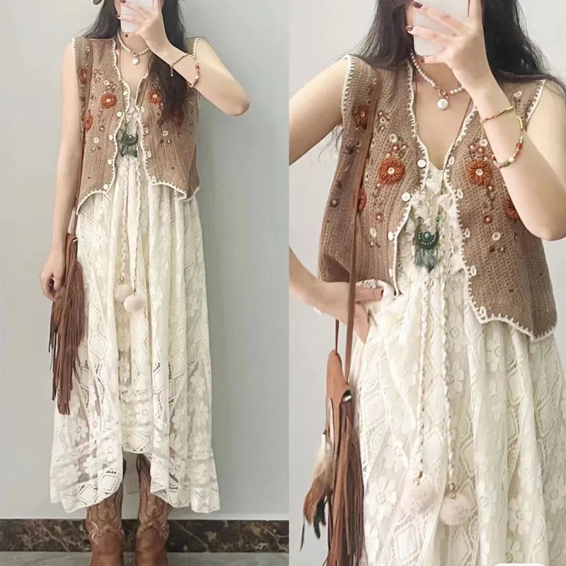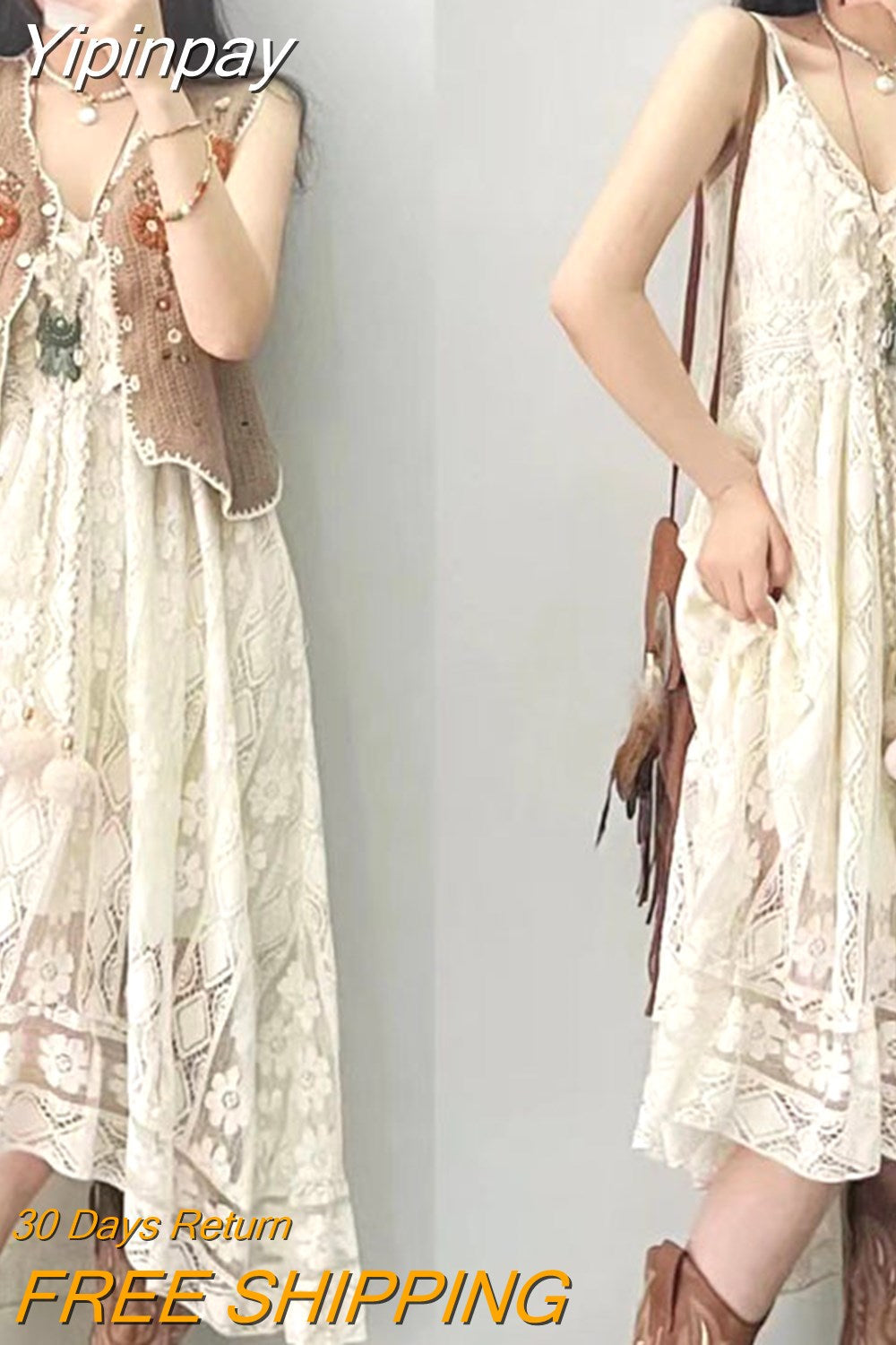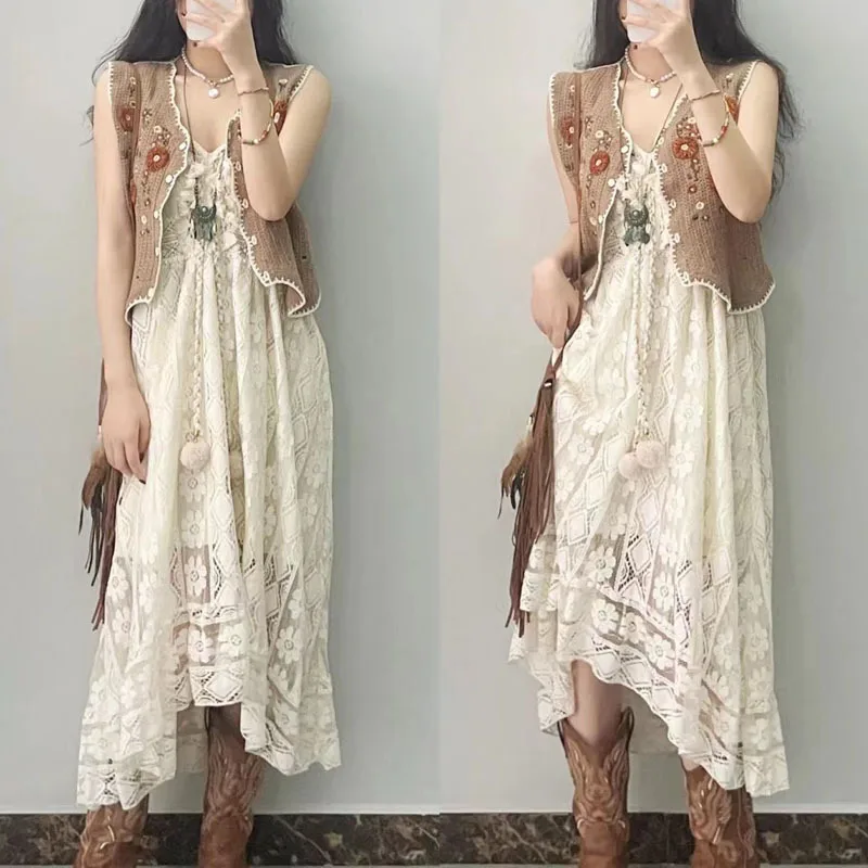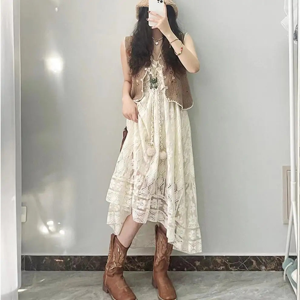 Yipinpay Dress Female 2024 New Lazy Retro Hollow Tassel Irregular V-neck Waist Slimming Suspender Seaside Vacation Beach Dress