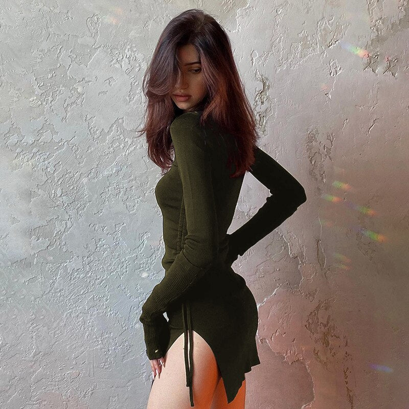 yipinpay Dress Long Sleeve Mini Dress Women Side Slit Drawstring Female Dress Autumn Winter Clothes Streetwear Bodycon Y2K Dress