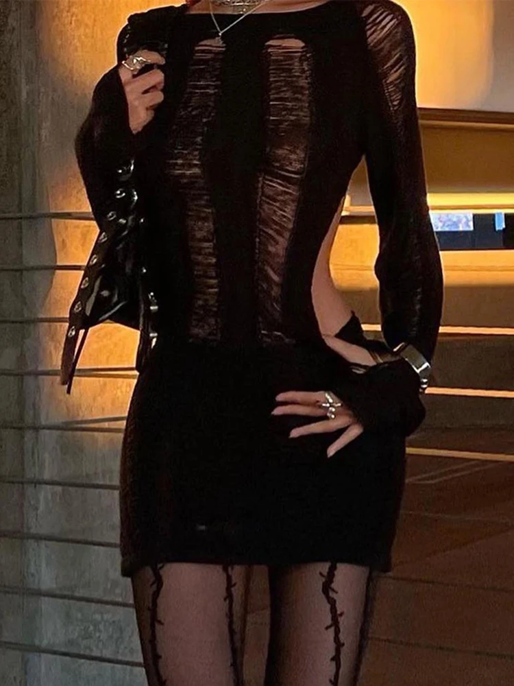 yipinpay Dress Women Backless Party Dress Black Long Sleeve Bodycon Dress Summer Club Outfits Streetwear Solid Cut Out Beach Dress