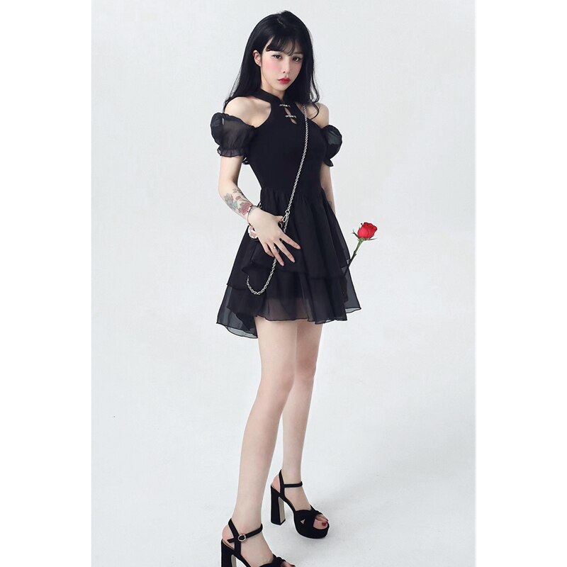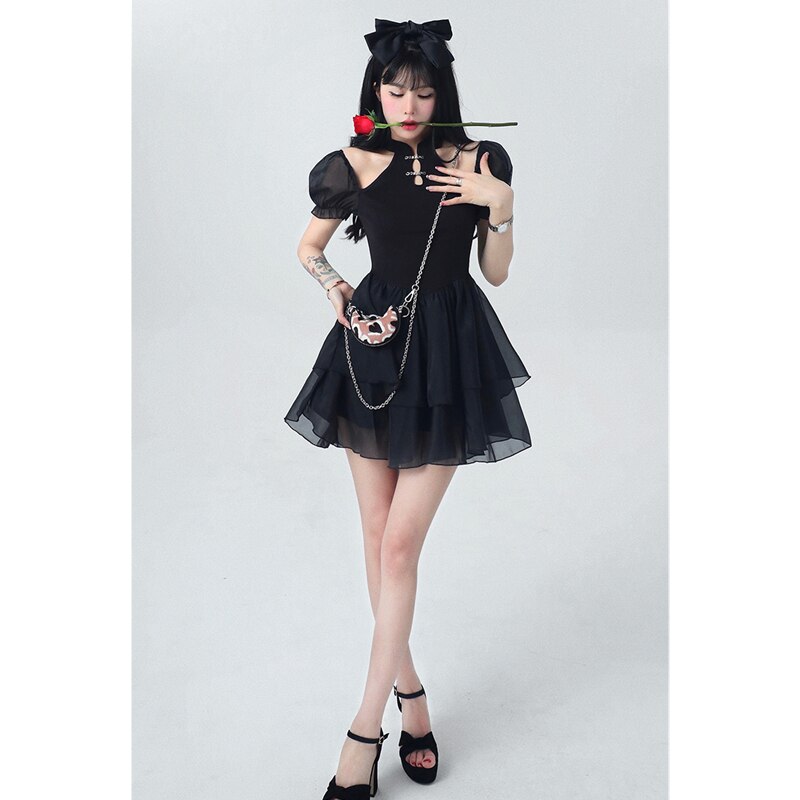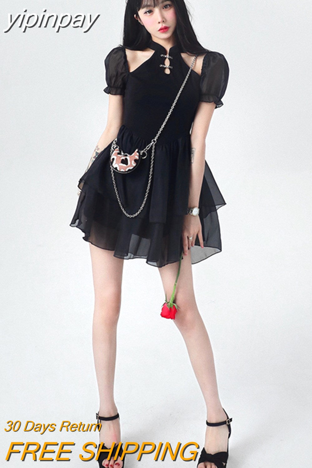 yipinpay Dress Women Summer New Sexy Puff Short Sleeves Short Skirt Black Fashion Gothic Streetwear Design Fishbone Skirt Dress