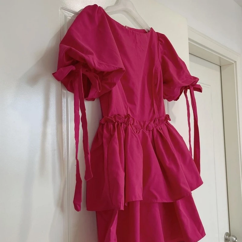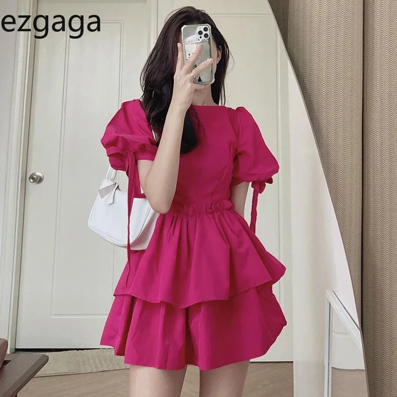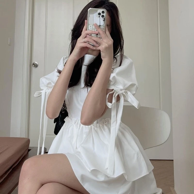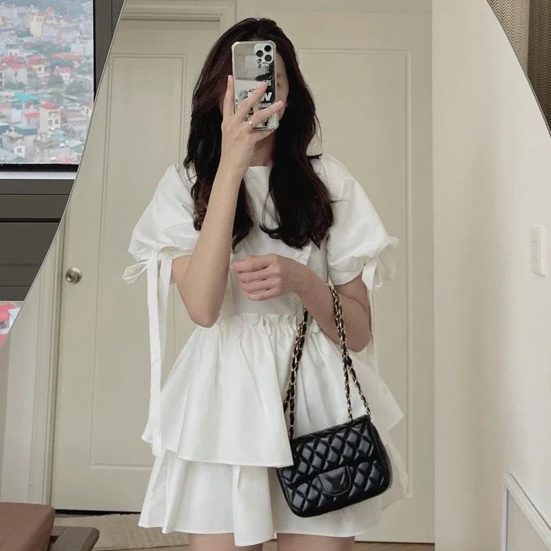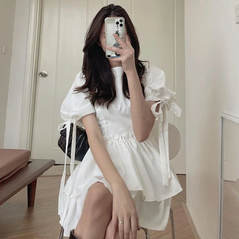 Yipinpay Dresses Woemn Lace Up Ruffles Patchwork Puff Short Sleeve Solid Korean Fashion Spring Summer Ladies Dress Casual