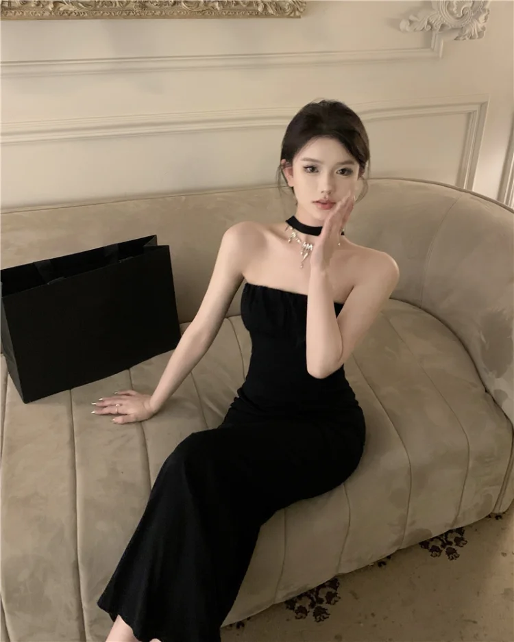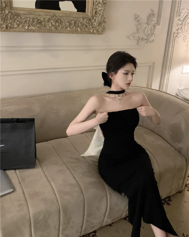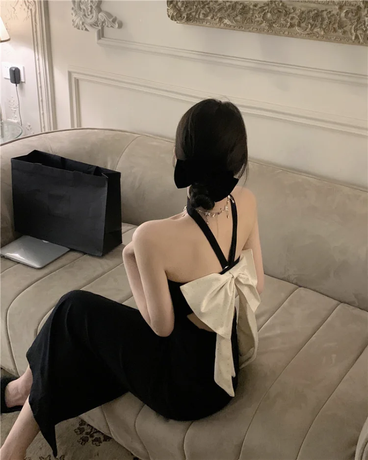 Yipinpay Dresses Women Backless Bow French Style Sleeveless Slim Stretch Halter Slash Neck Hollow Out Vintage Sexy Elegant Dress