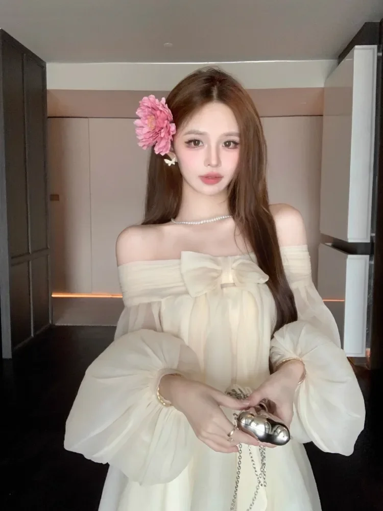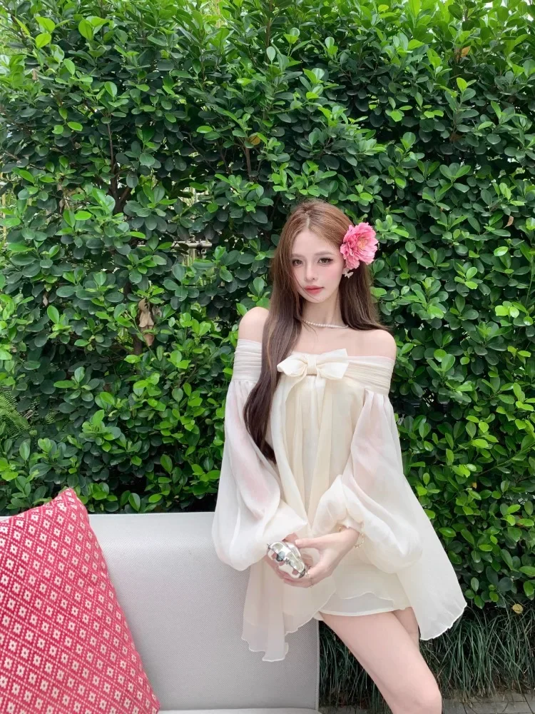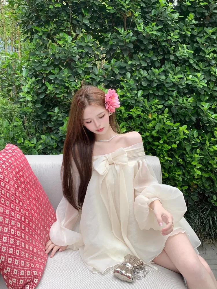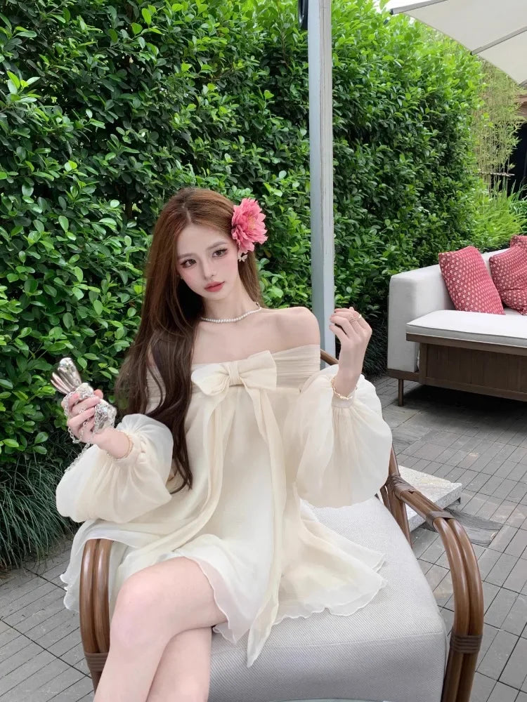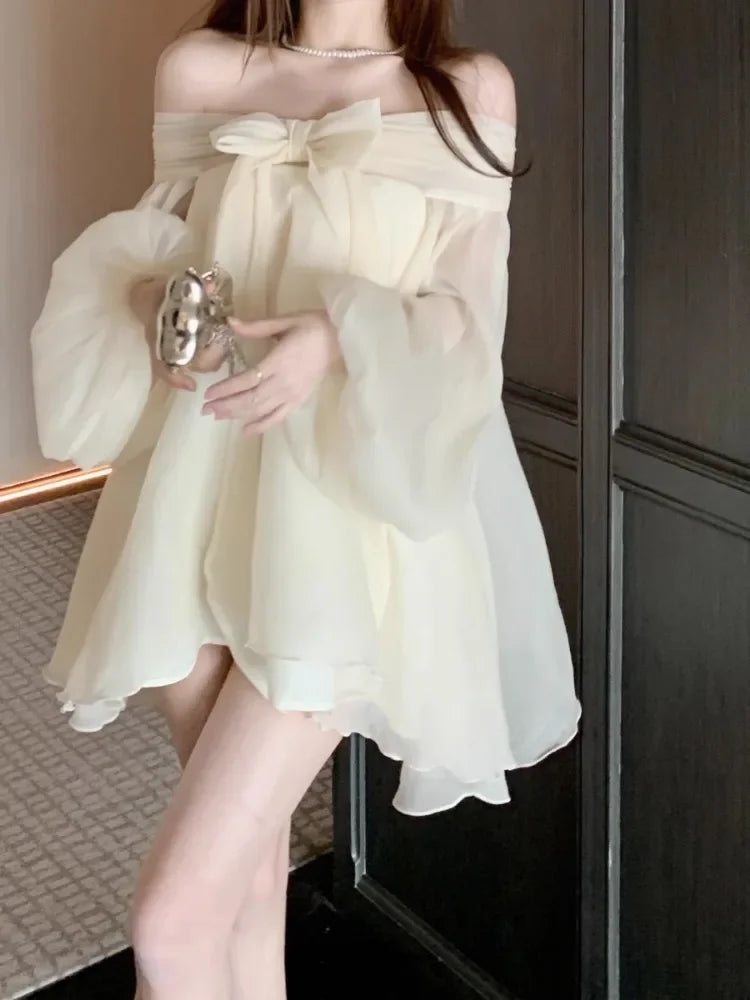 Yipinpay Dresses Women Bowknot Slash Neck Off Shoulder Lantern Sleeve Ruffles Mesh Loose Backless Sweet Elegant Mini Dress Fairy