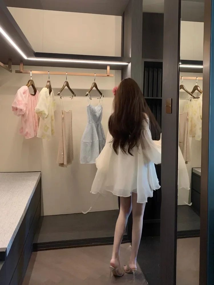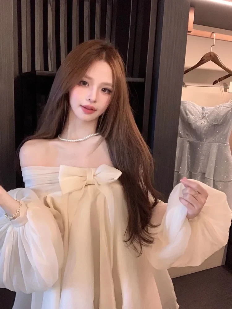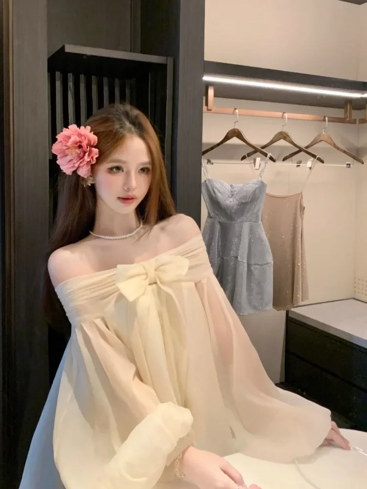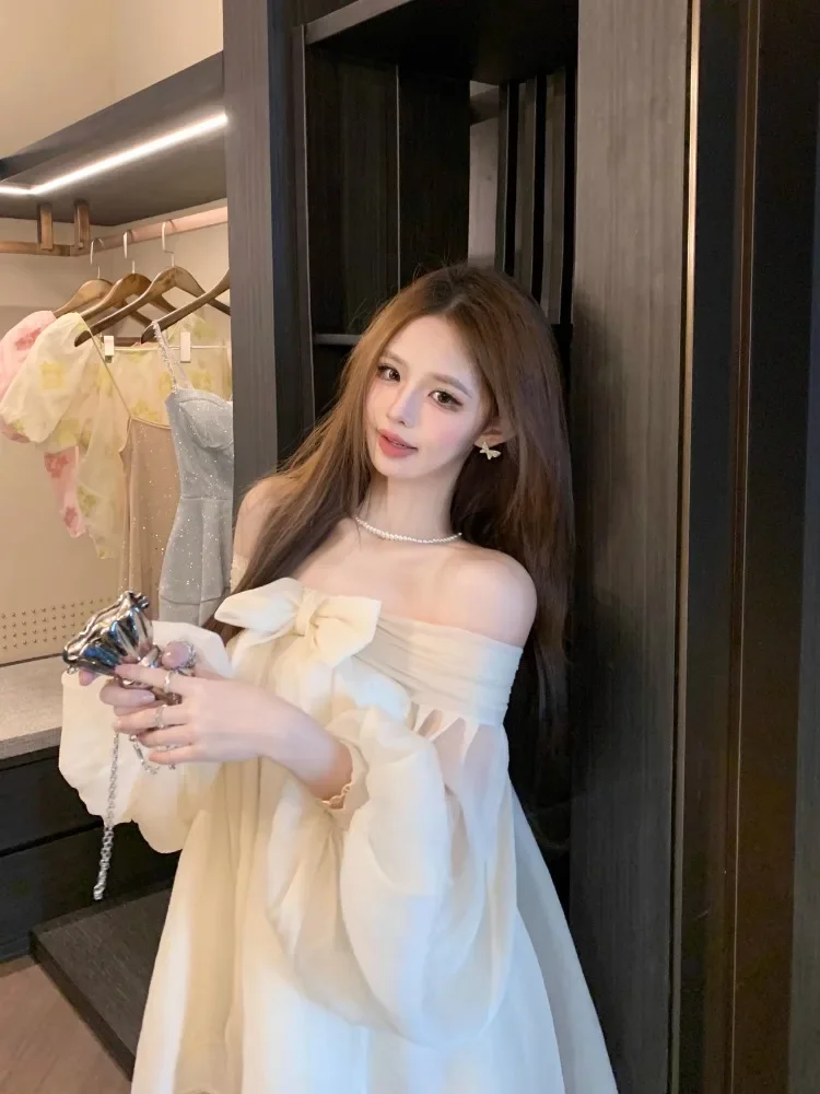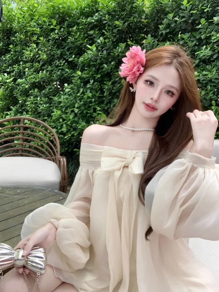 Yipinpay Dresses Women Bowknot Slash Neck Off Shoulder Lantern Sleeve Ruffles Mesh Loose Backless Sweet Elegant Mini Dress Fairy