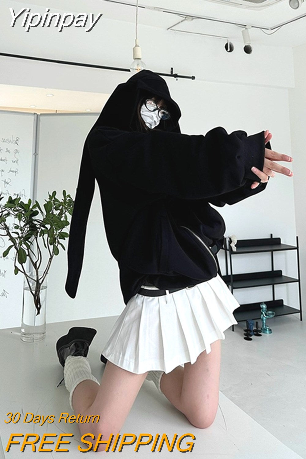 Yipinpay Ear Hooded Sweatshirt Women High Street Fashion Y2K Clothes Zip Up Hoodies Vintage Long Sleeve Oversized Jackets Coats