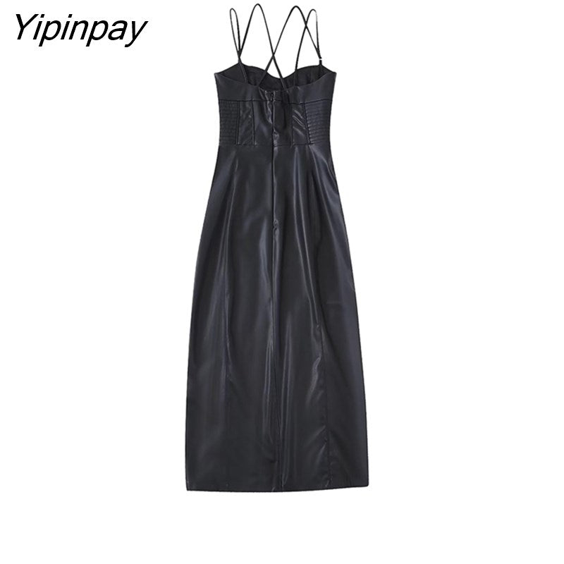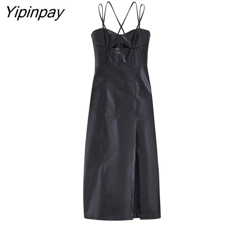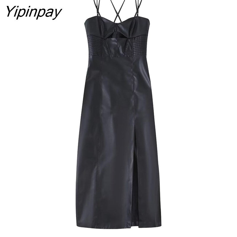 Yipinpay Elegant Autumn Women Faux-leather Dresses 2023 Fashion PU Solid Vestidos With Stitching Sleeveless Backless Pullover Dress