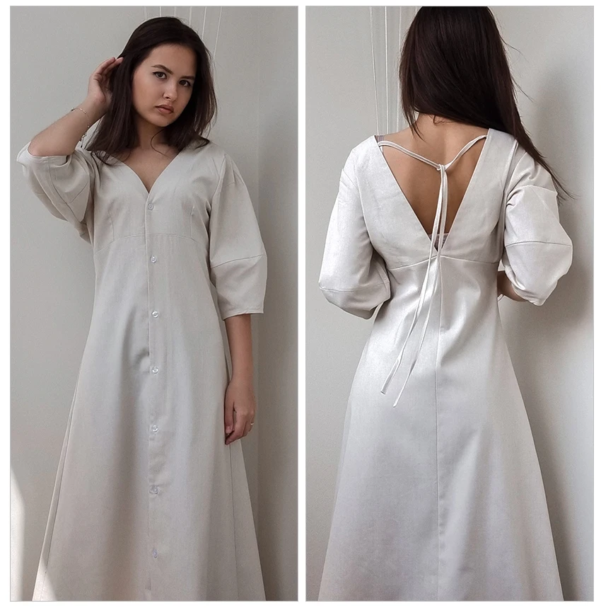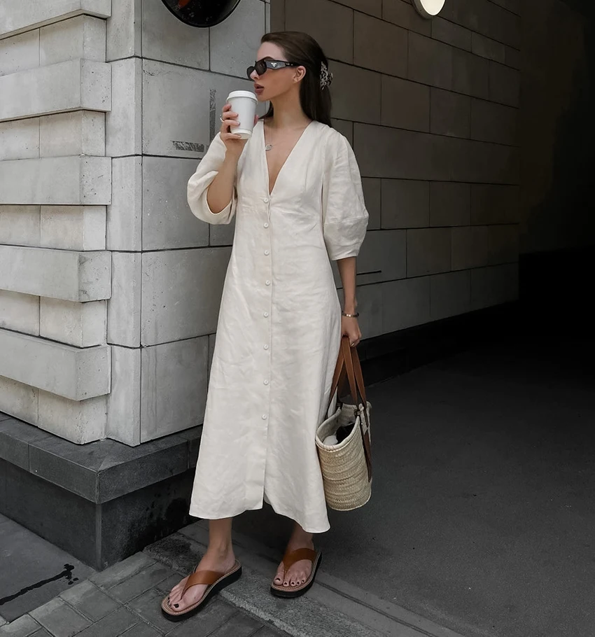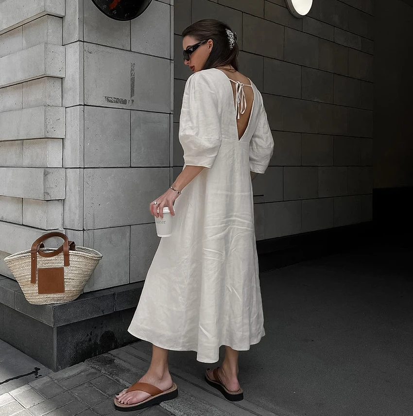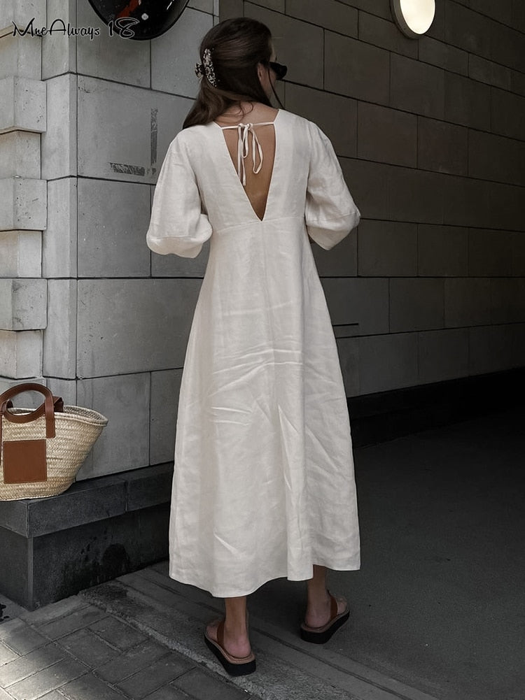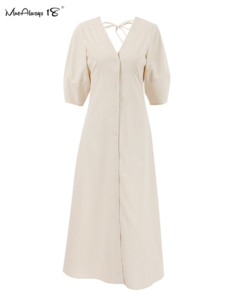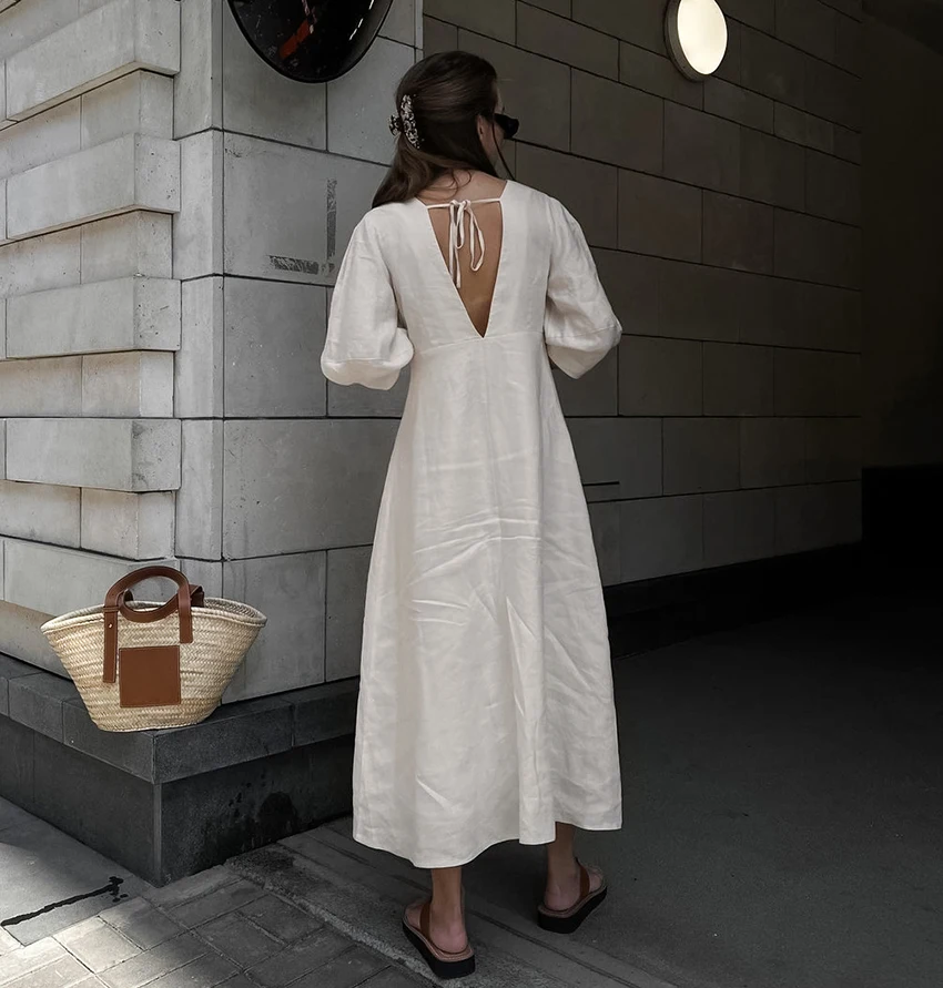Yipinpay Elegant Beige Women Linen Dress Puff Sleeve Long Backless Button Dress Ladies V-Neck Cotton Dresses Soft Summer 2023