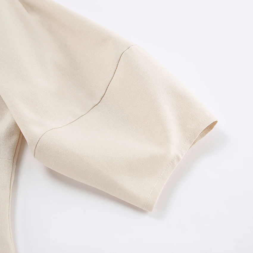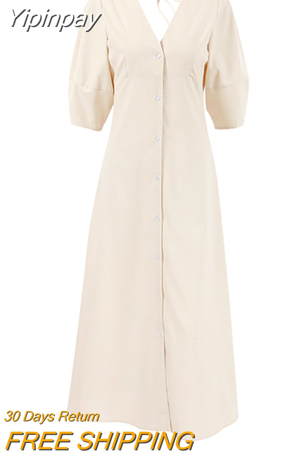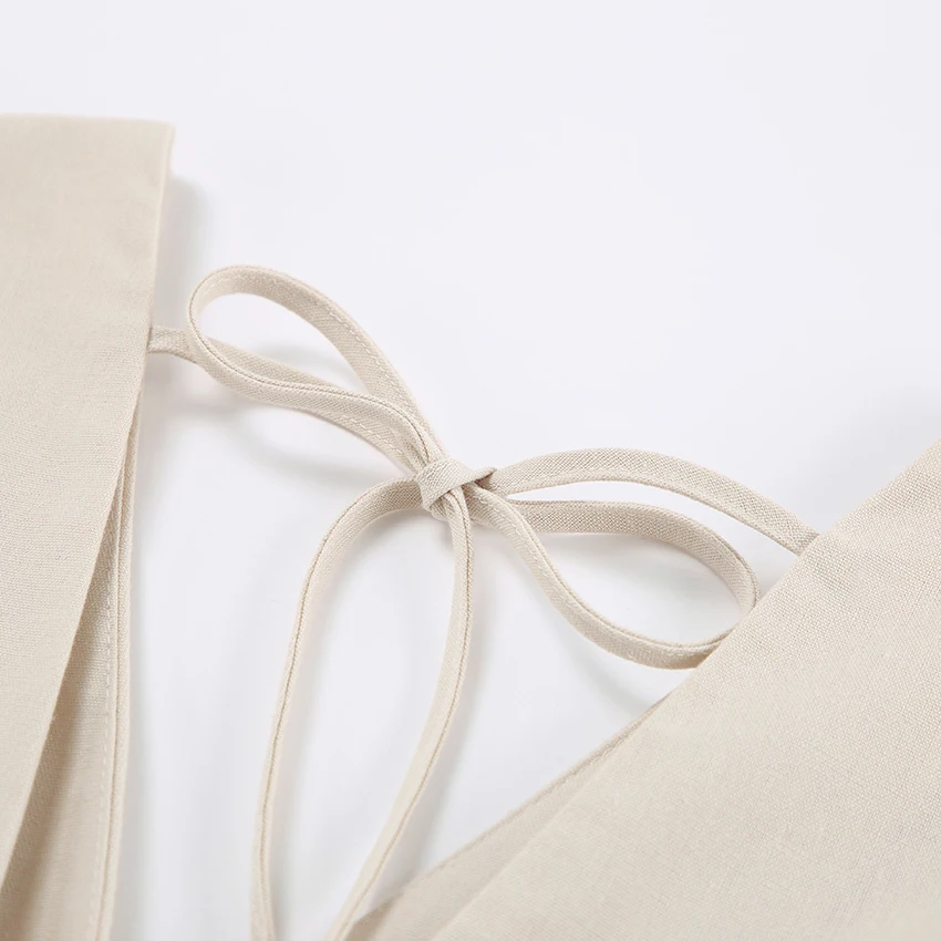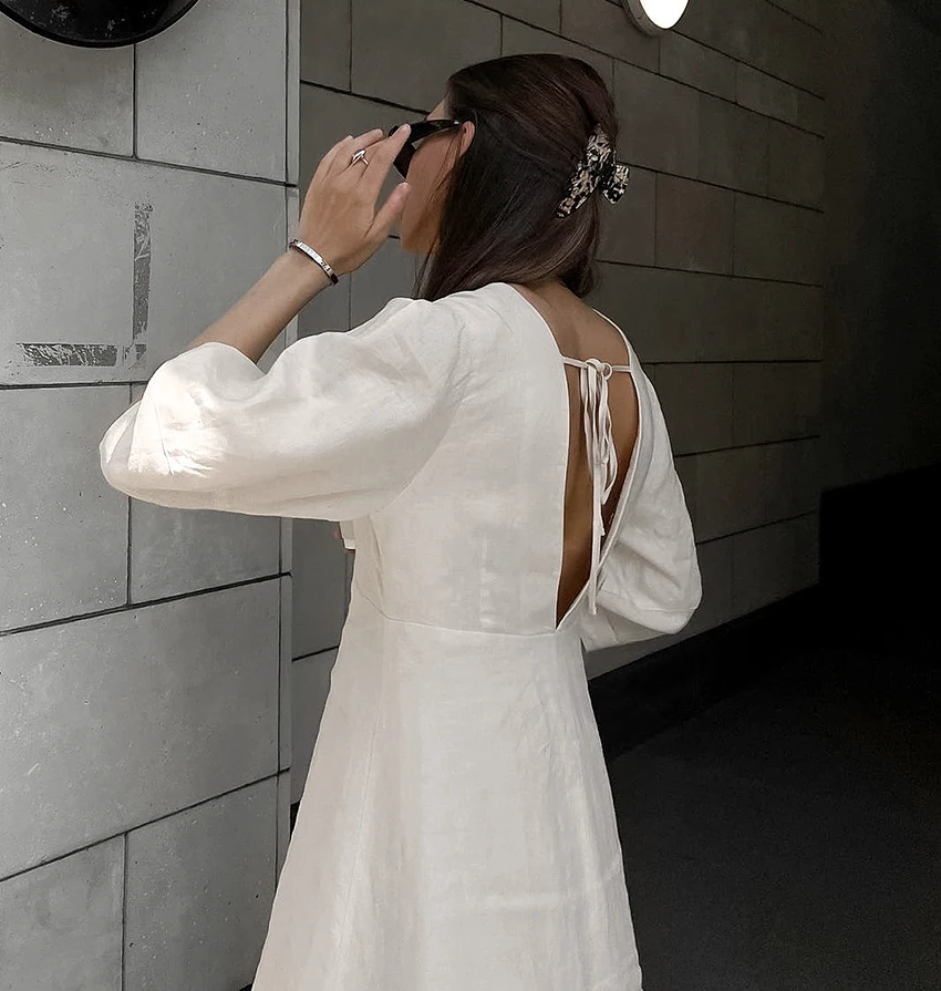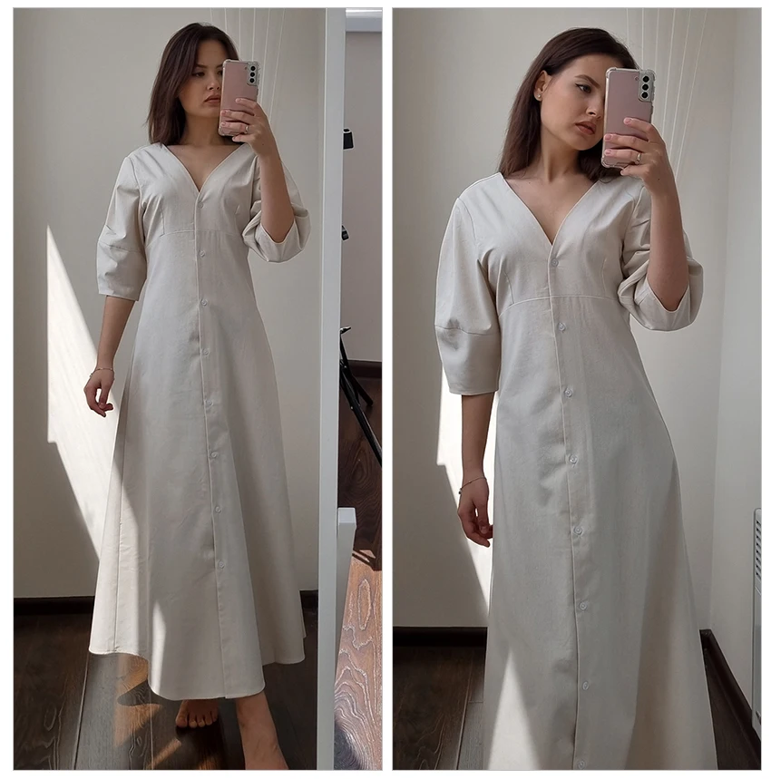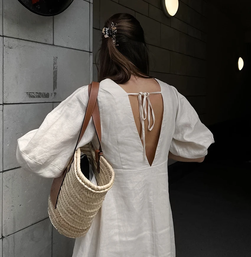 Yipinpay Elegant Beige Women Linen Dress Puff Sleeve Long Backless Button Dress Ladies V-Neck Cotton Dresses Soft Summer 2023
