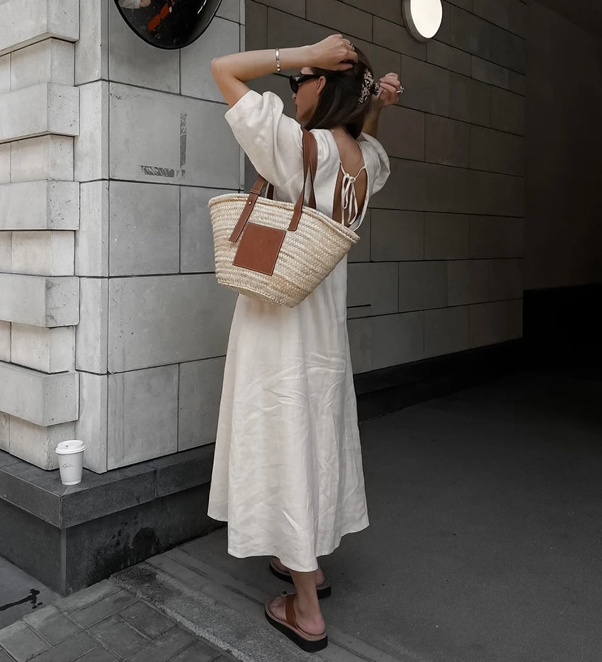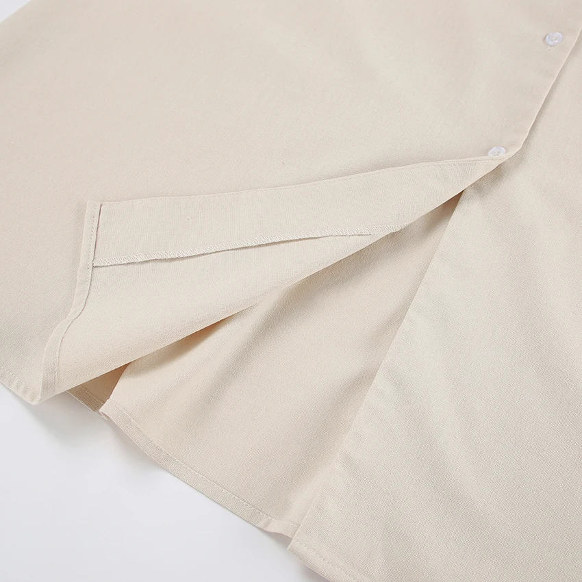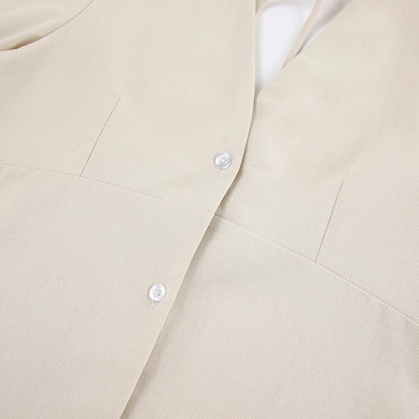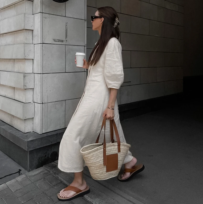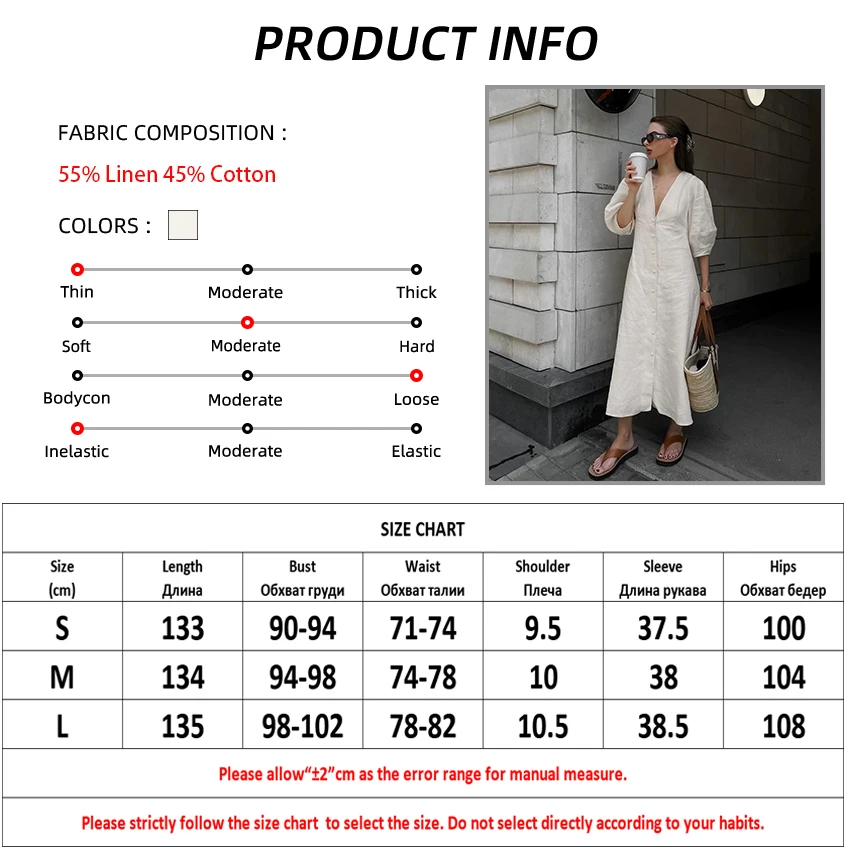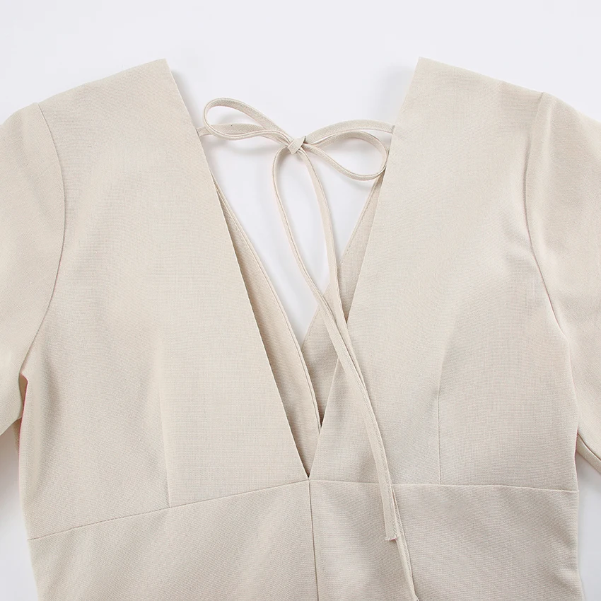 Yipinpay Elegant Beige Women Linen Dress Puff Sleeve Long Backless Button Dress Ladies V-Neck Cotton Dresses Soft Summer 2023