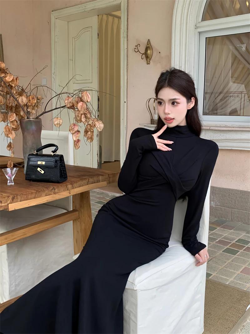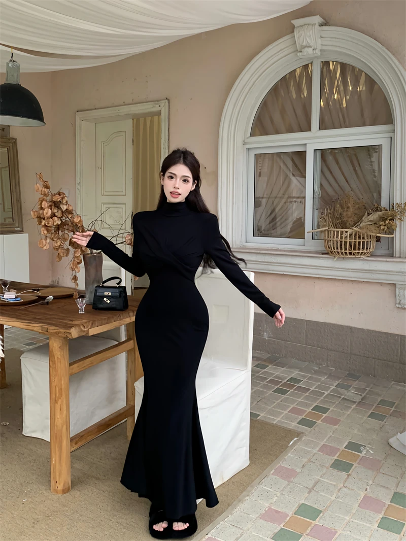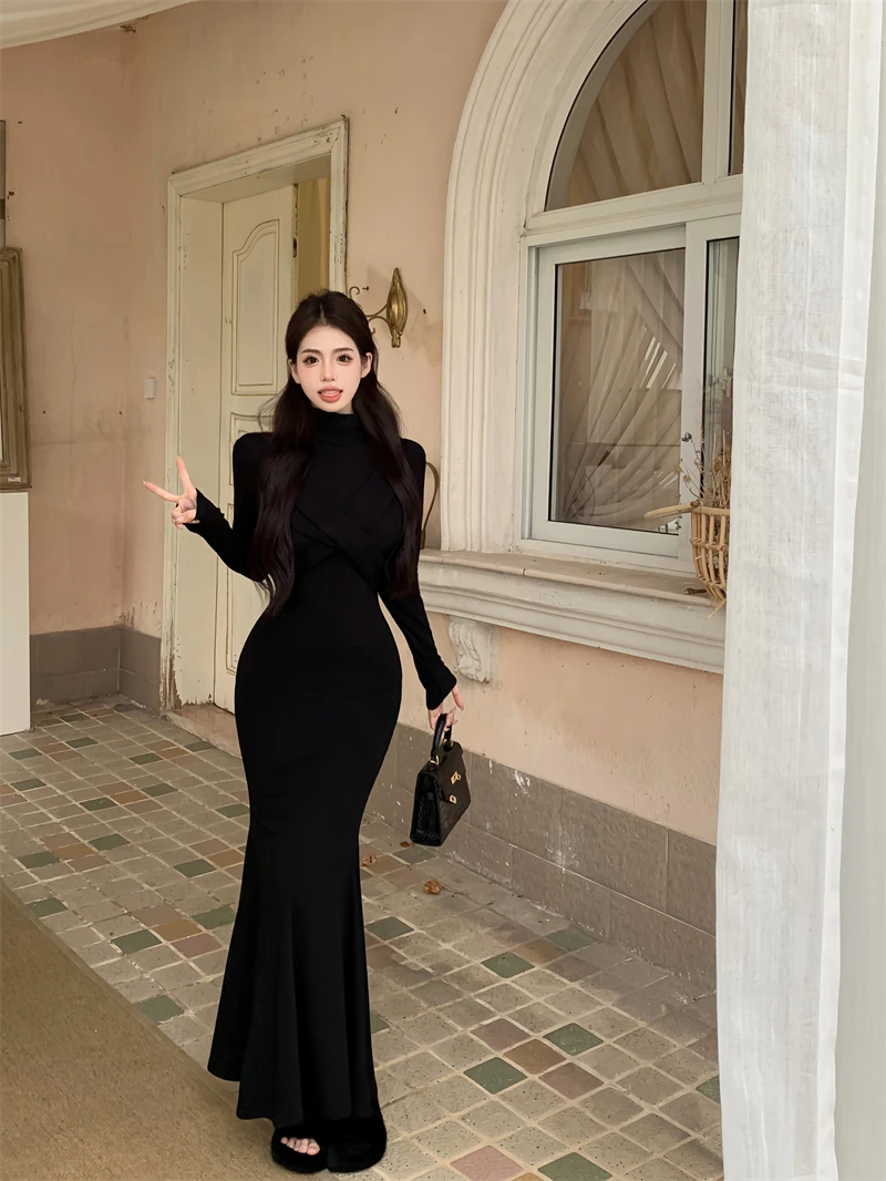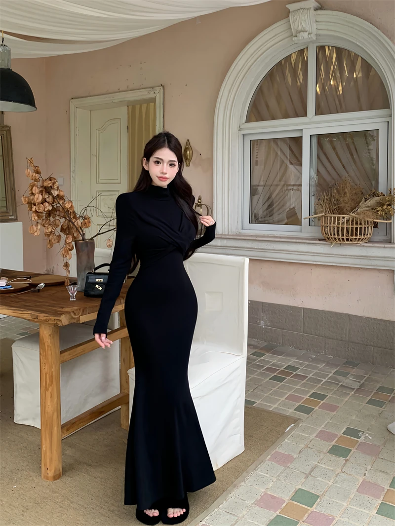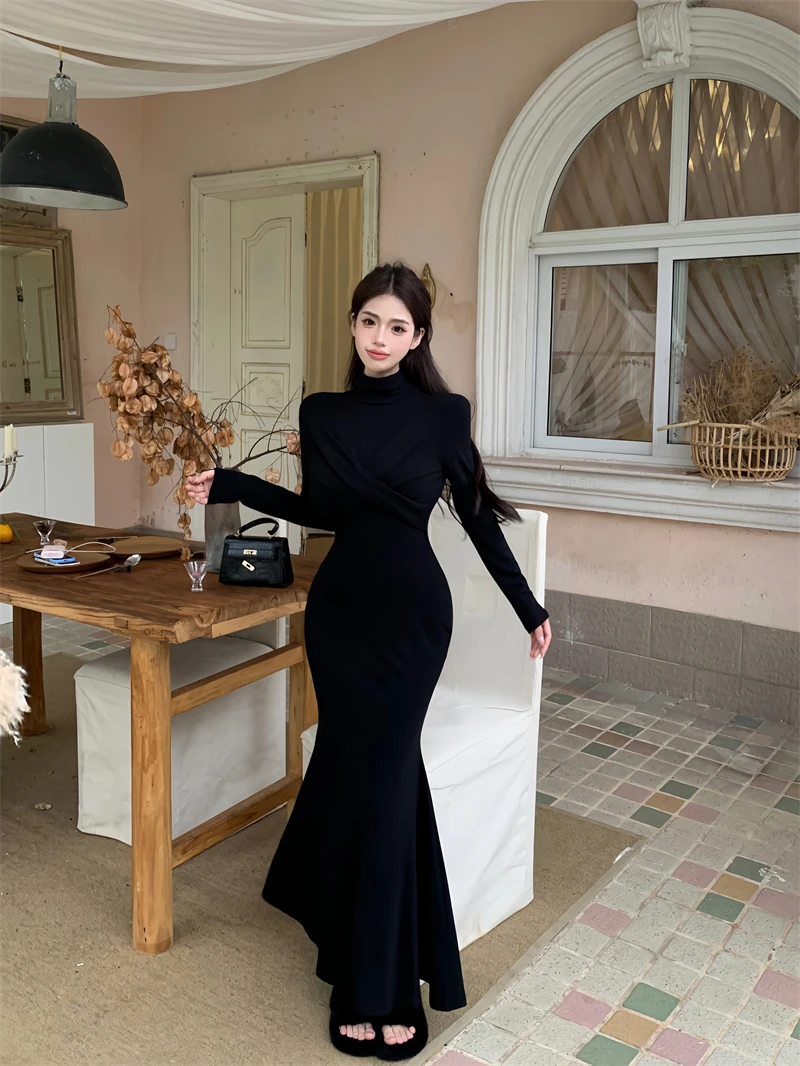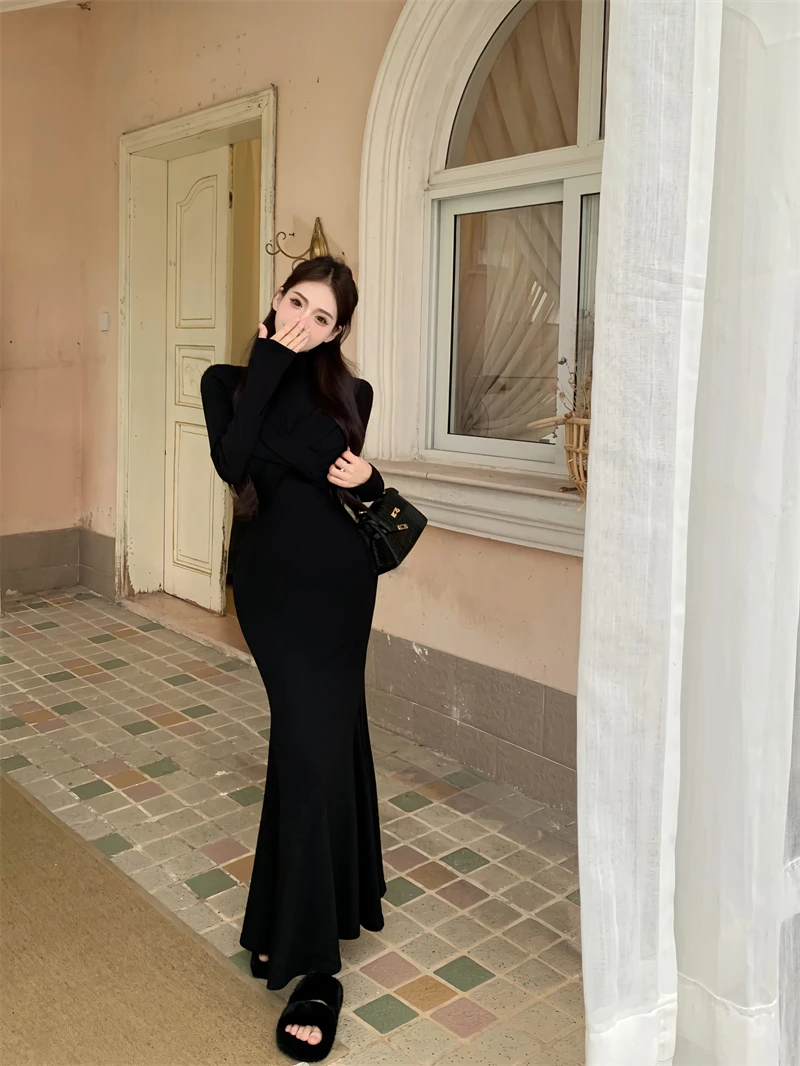 Yipinpay Elegant Black Mermaid Dress Women Casual Chic Long Sleeve Sexy Evening Party Dress French Vintage Pretty Long Dress 2023