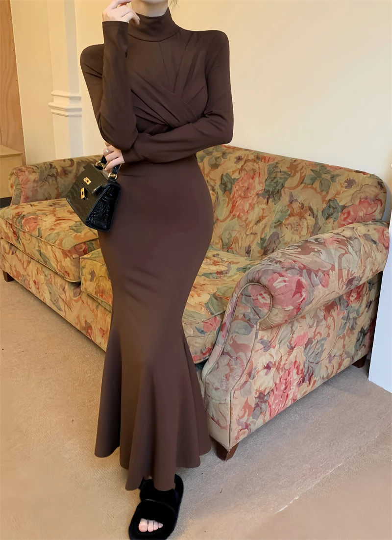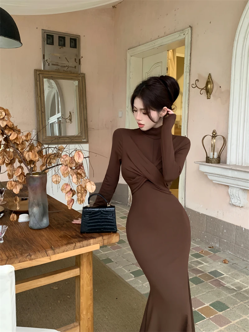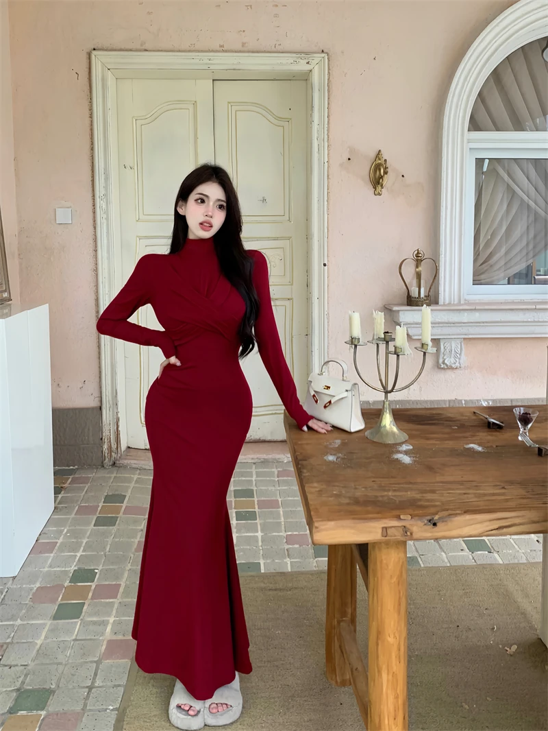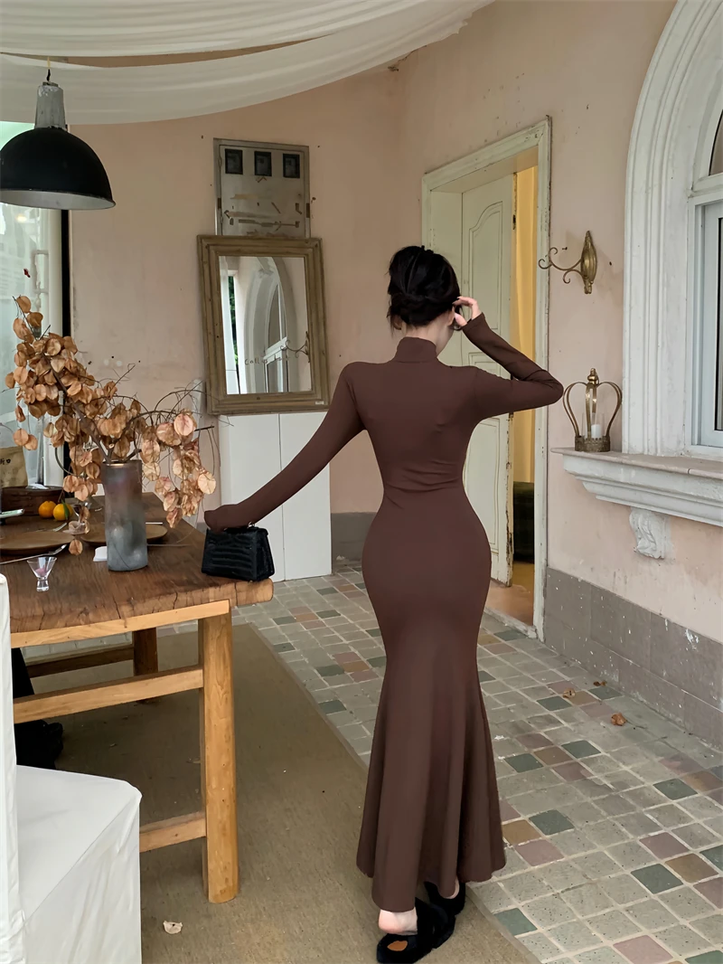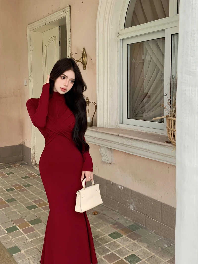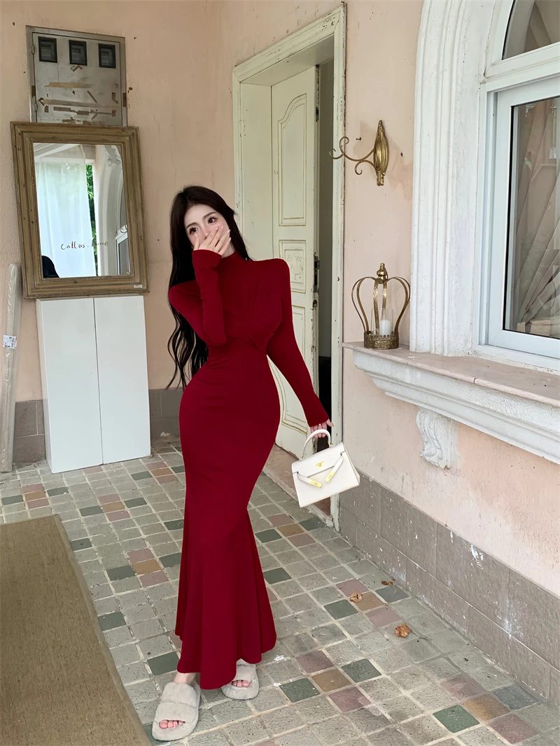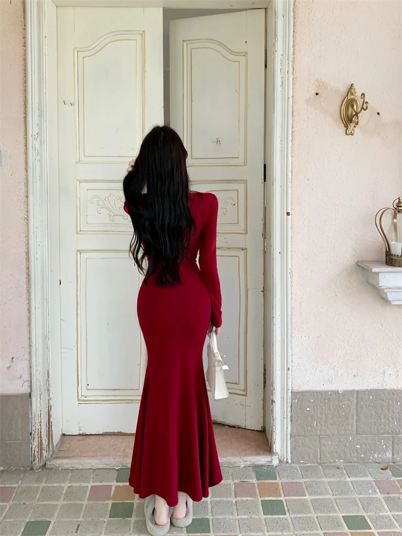 Yipinpay Elegant Black Mermaid Dress Women Casual Chic Long Sleeve Sexy Evening Party Dress French Vintage Pretty Long Dress 2023