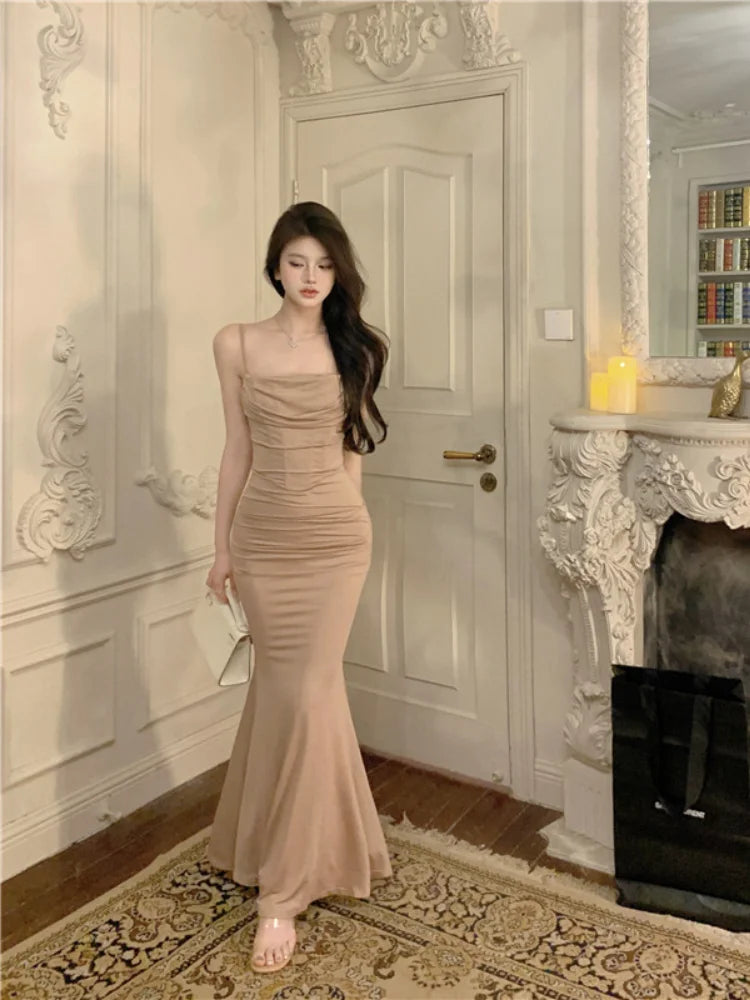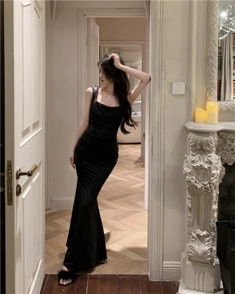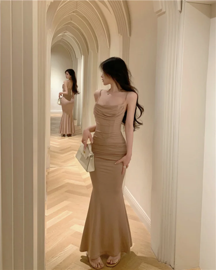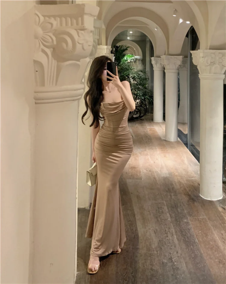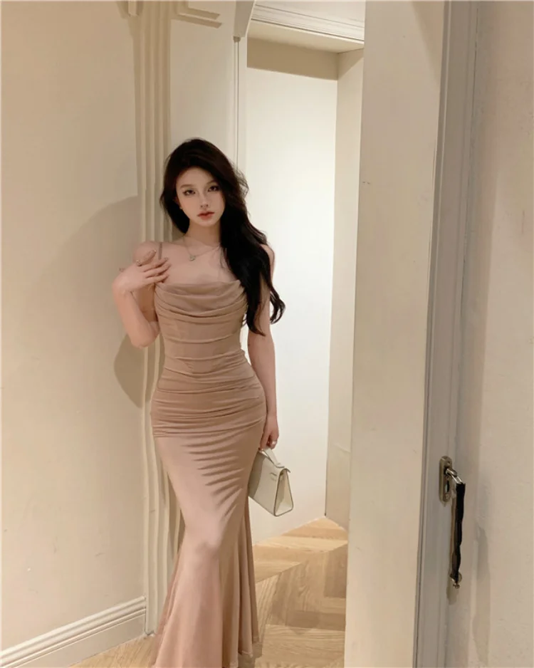 Yipinpay Elegant Dresses Women Party Sleeveless Slash Neck French Style Chic Mermaid Dress Ladies Solid Stretch Sexy Temperament