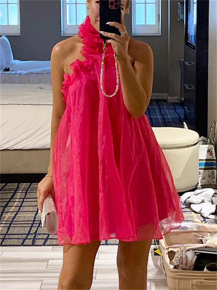 Yipinpay Elegant Frilly Halter Neck Mini Dress Women Off-Shoulder Sleeveless Backless A-Line Short Dress for Party Club Beach
