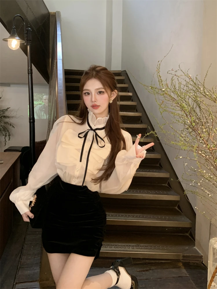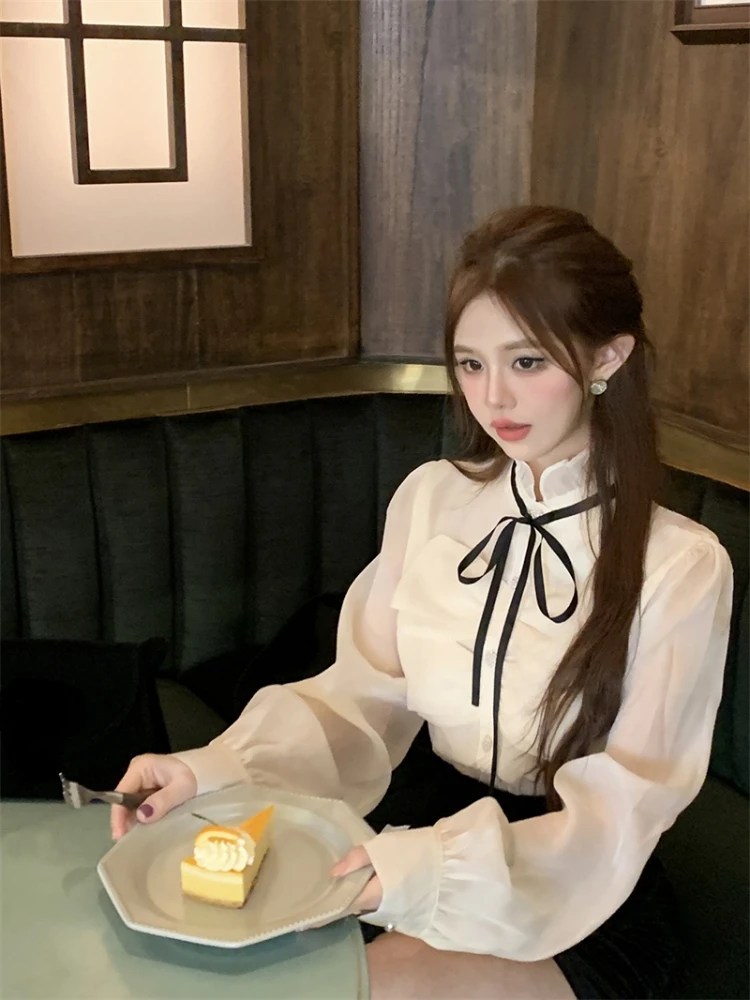 Yipinpay Elegant Shirts Women French Style Bow Stand Collar Long Sleeve Ruffles Spring Summer Office Lady Blouse Fashion Tops