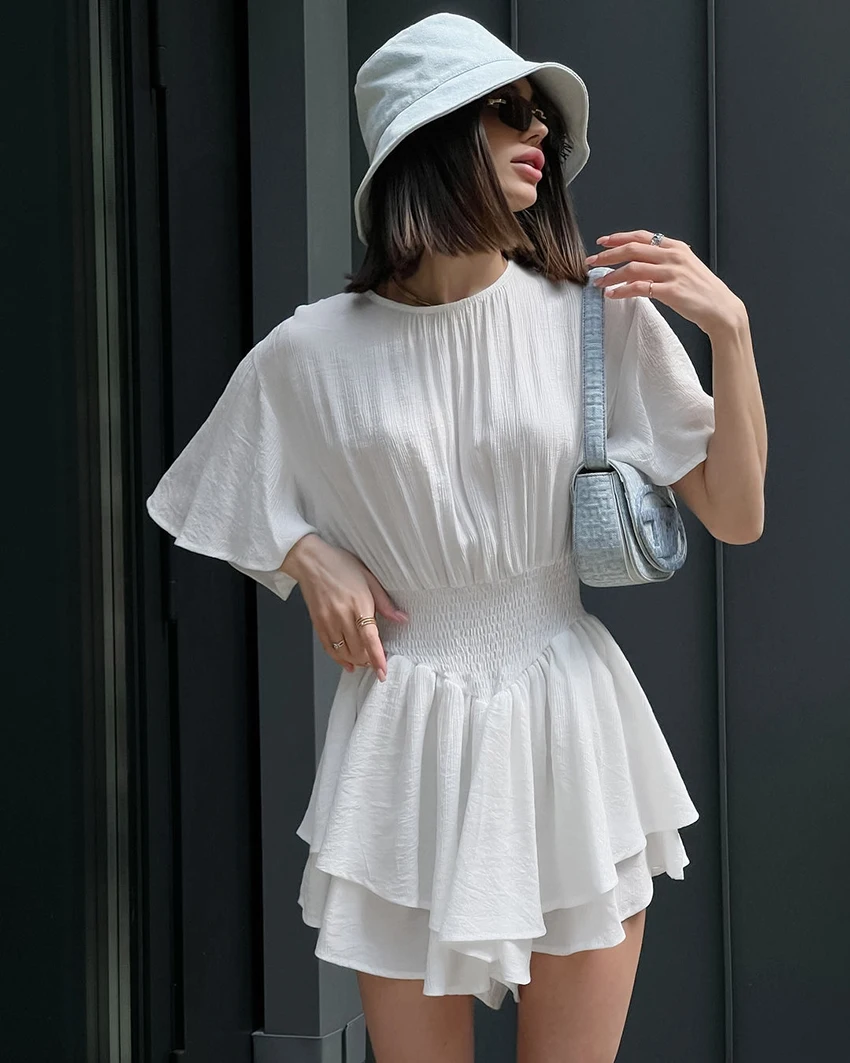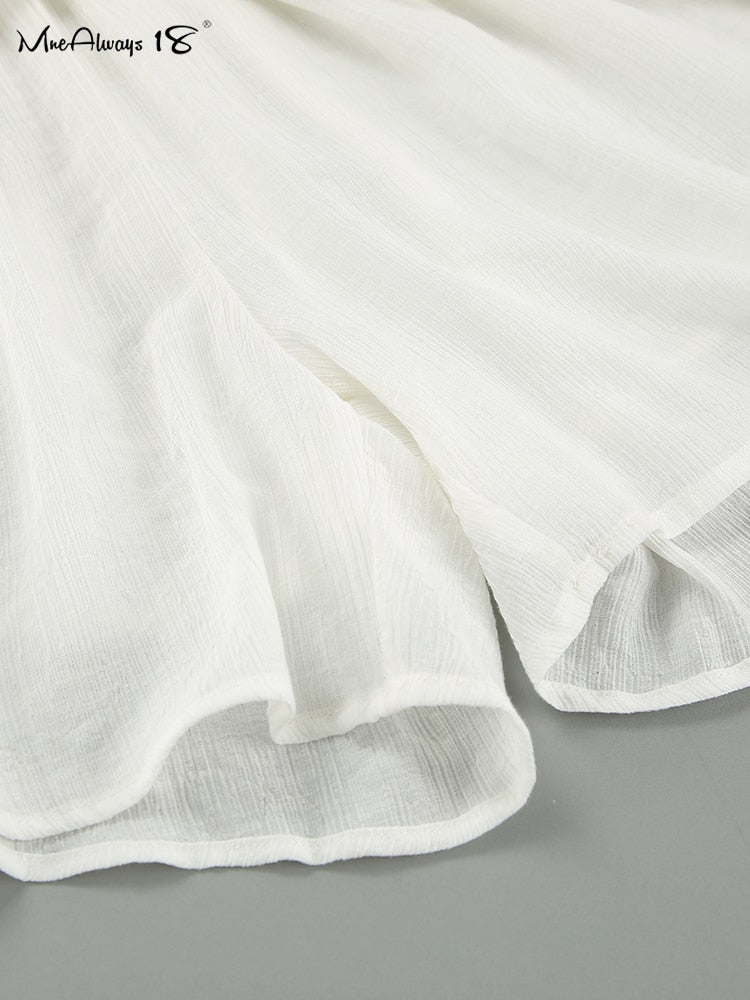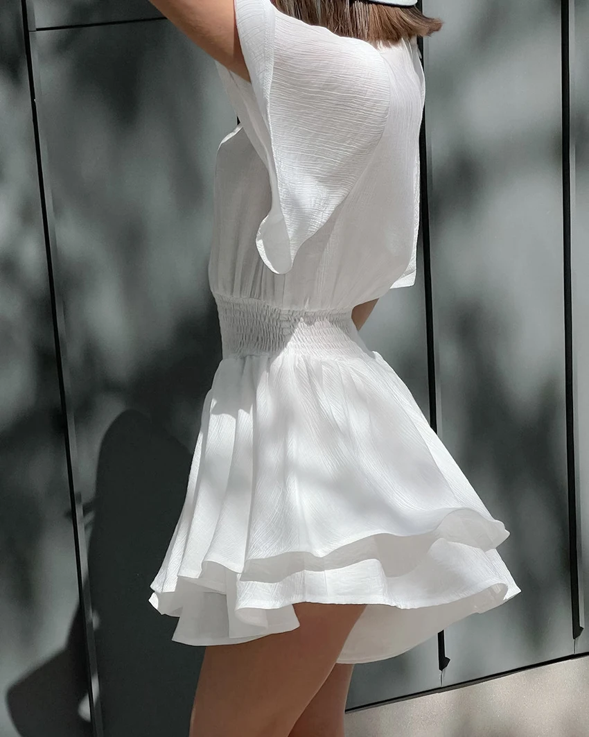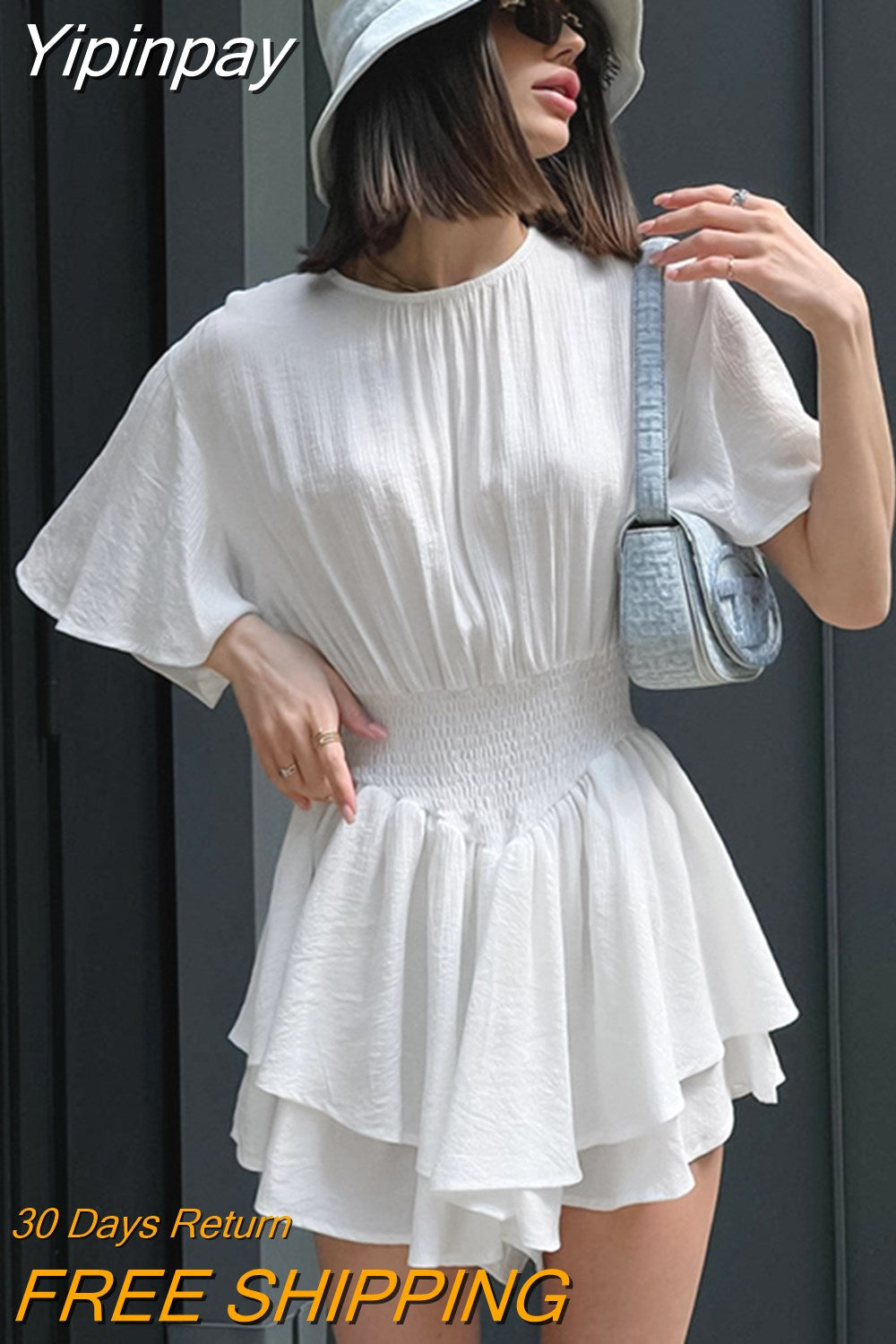 Yipinpay Elegant White Culottes Women Dress Flare Sleeve Soft Ruffled Shorts Dress Office Ladies Slim Crepe Mini Dress 2023