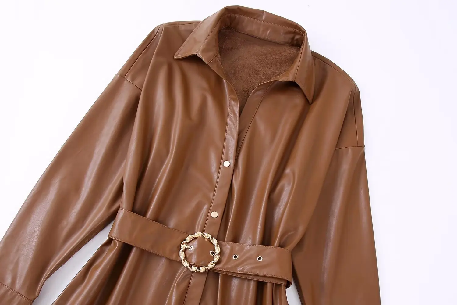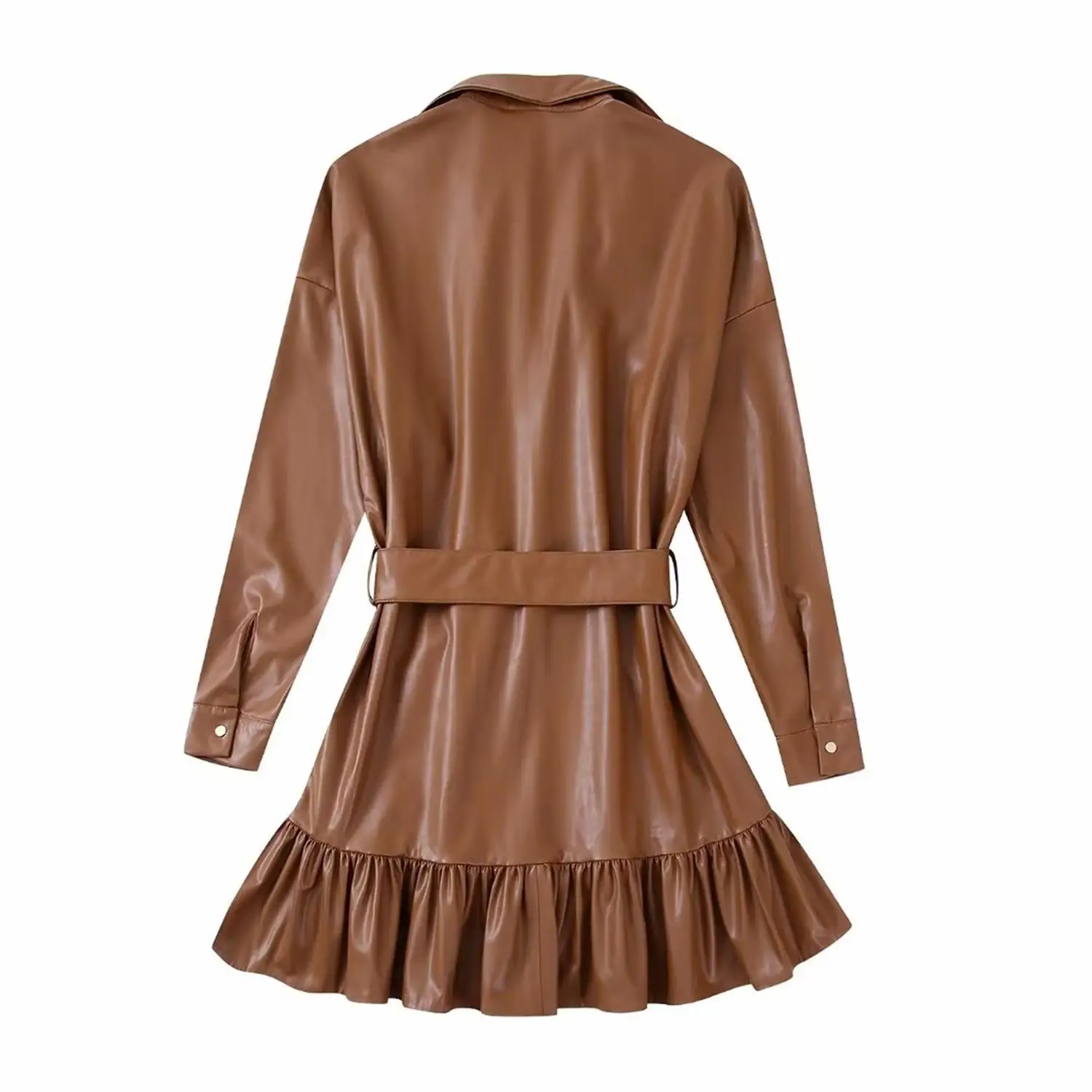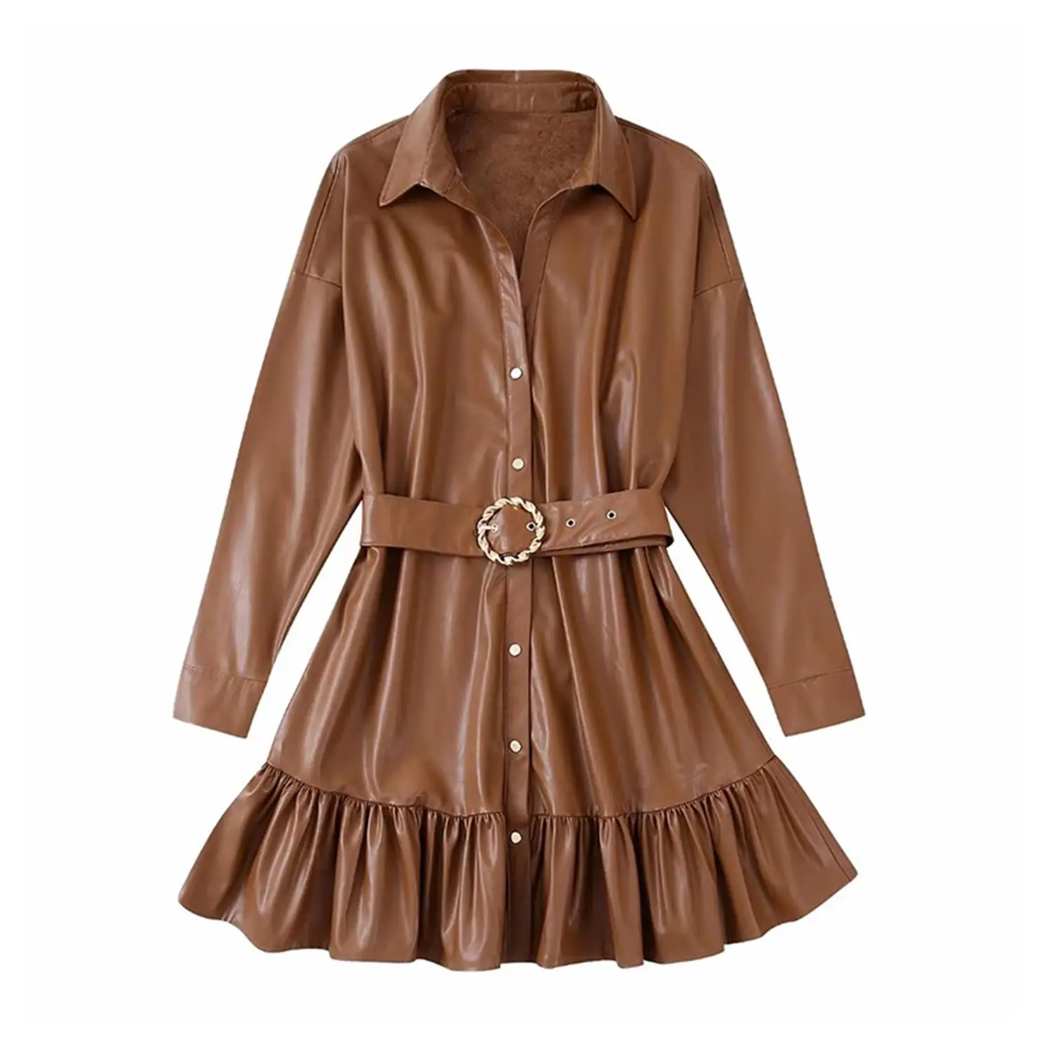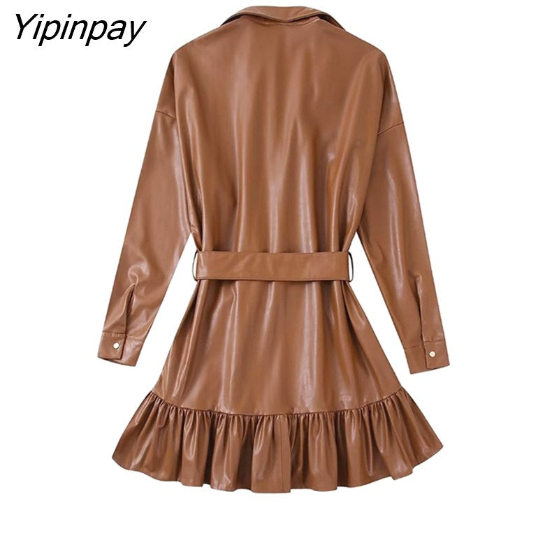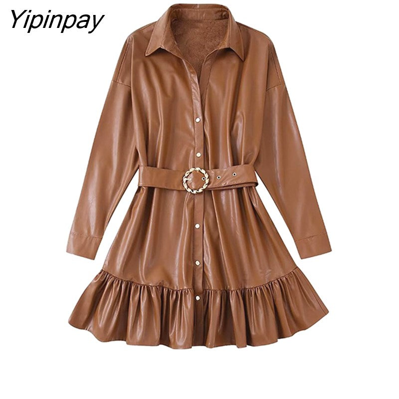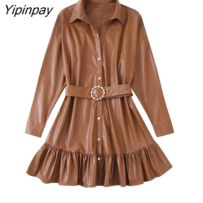Yipinpay Elegant Women Faux Leather Mini Dresses With Belt Solid Turn Down Collar Dresses Fashion Vintage Long Sleeve Vestidos