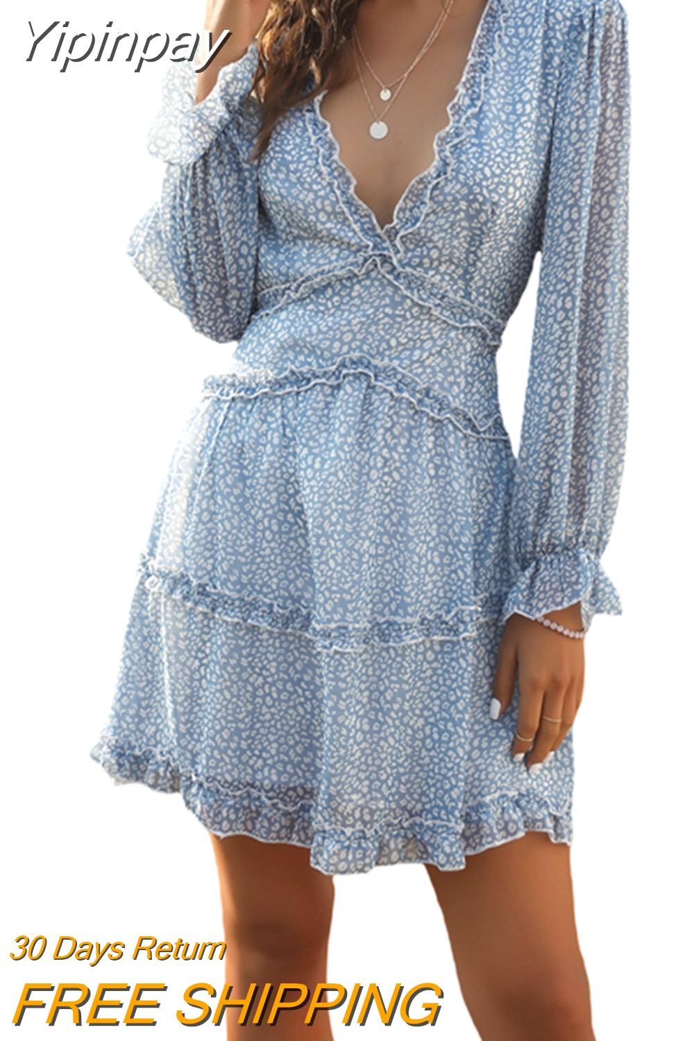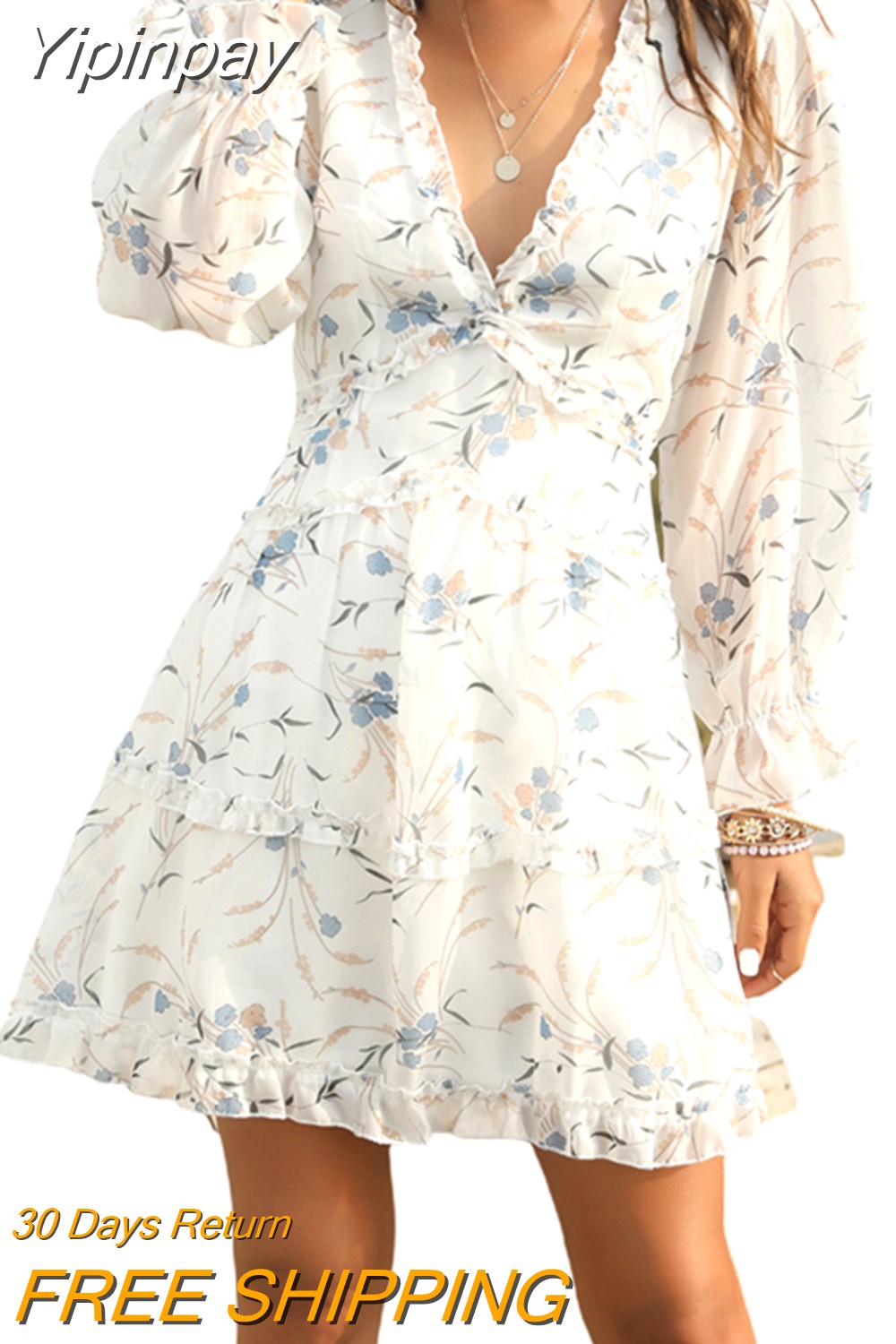 Yipinpay Elegant Women Flowers Chffion Dress Autumn Spring Office Lady Long Sleeve Deep V-neck Layers A-line Dress Backless