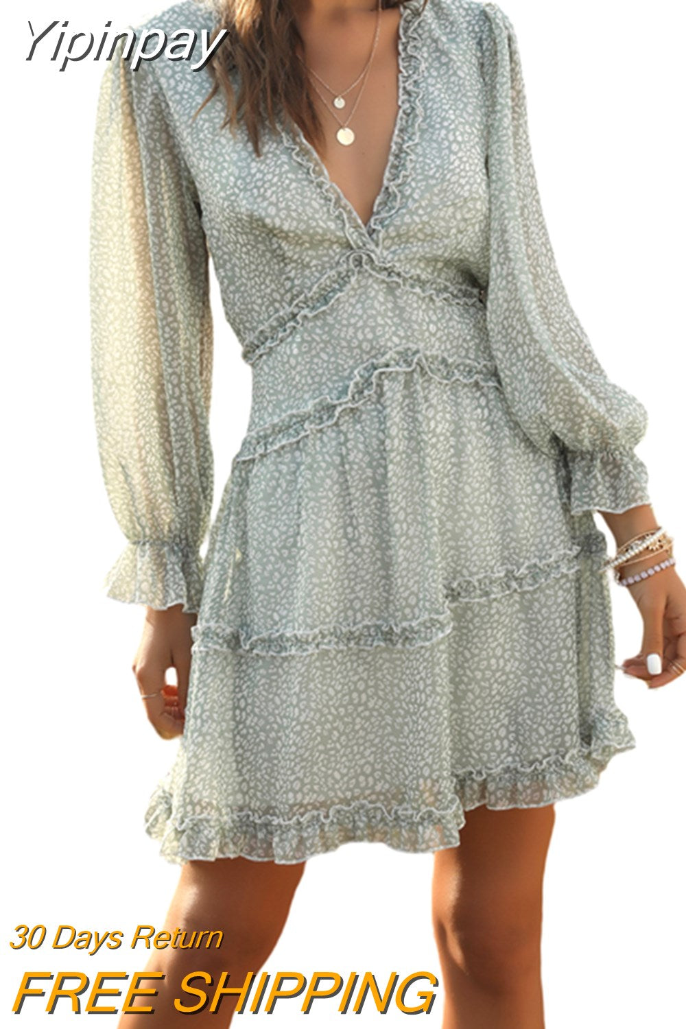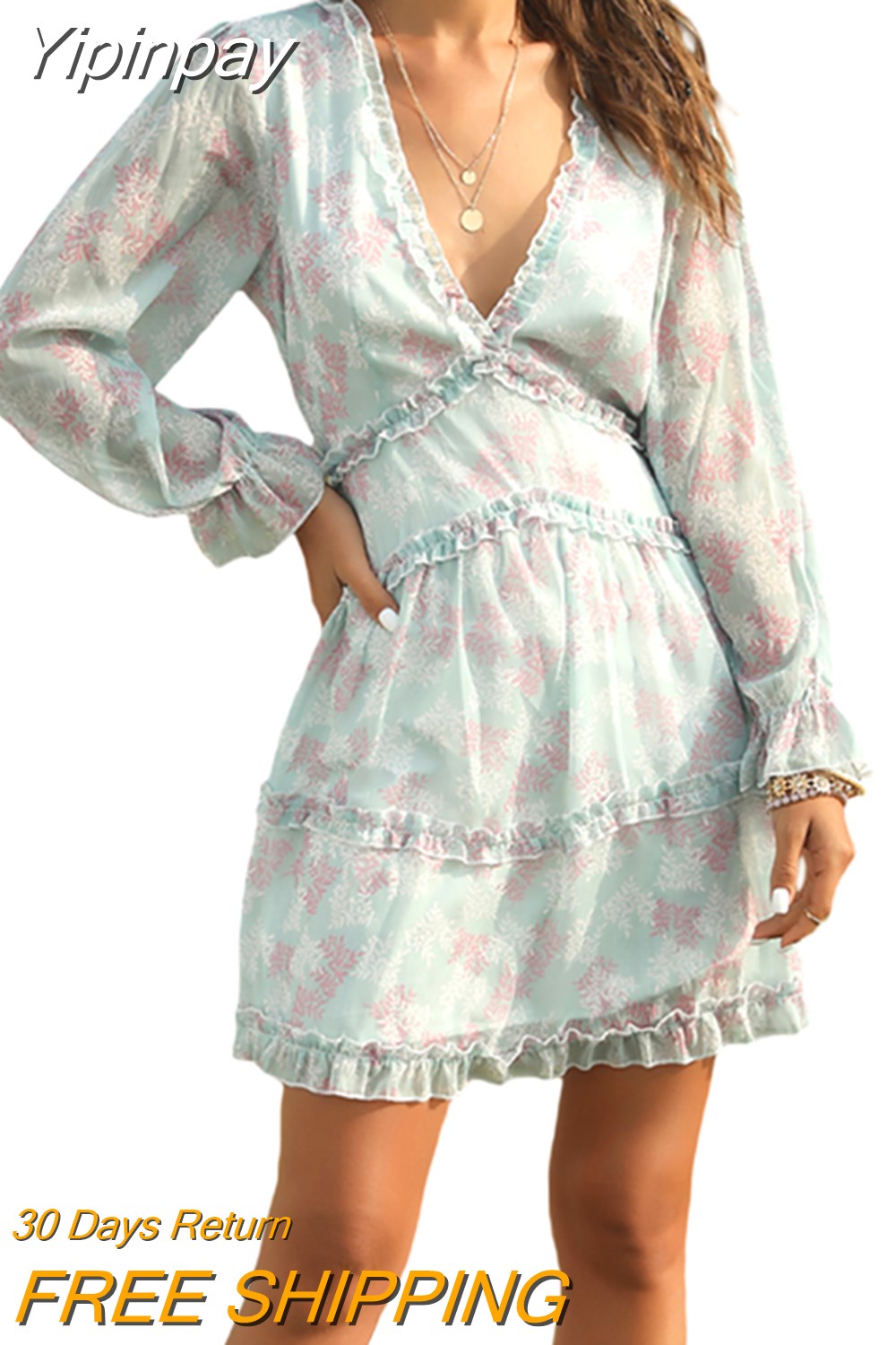 Yipinpay Elegant Women Flowers Chffion Dress Autumn Spring Office Lady Long Sleeve Deep V-neck Layers A-line Dress Backless