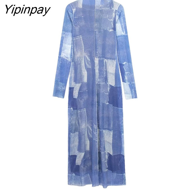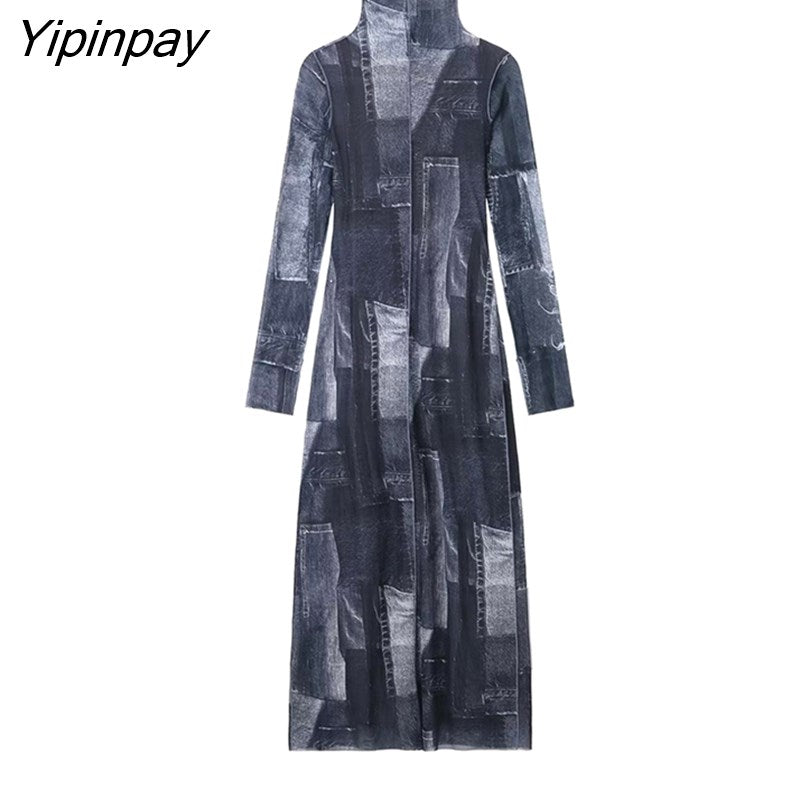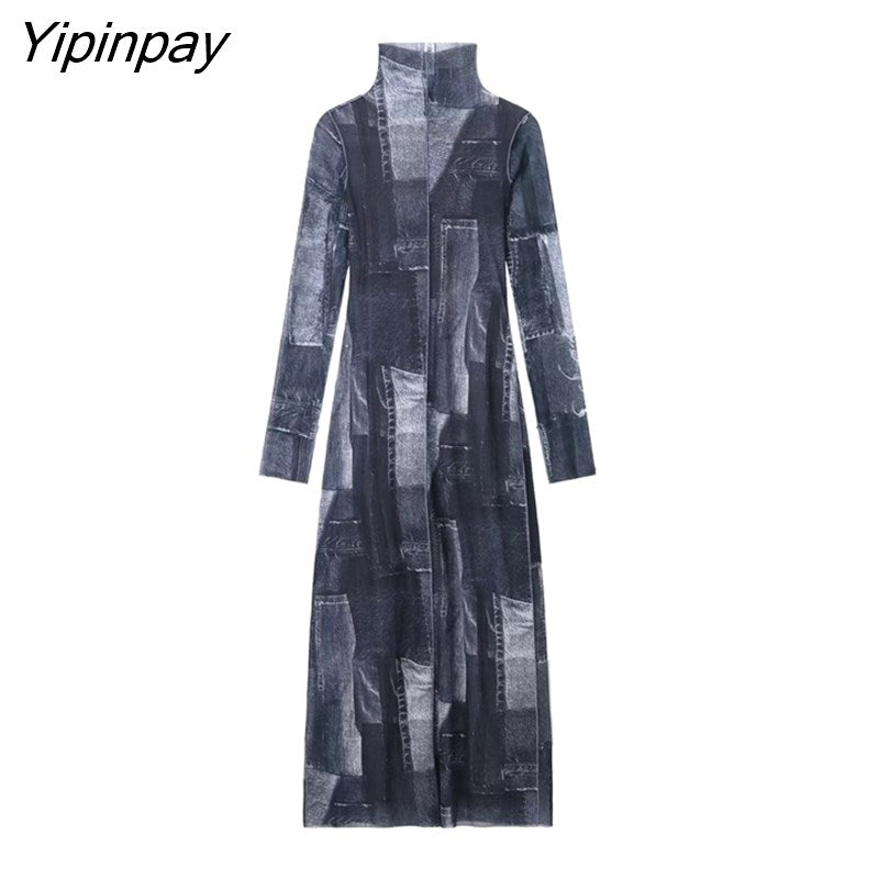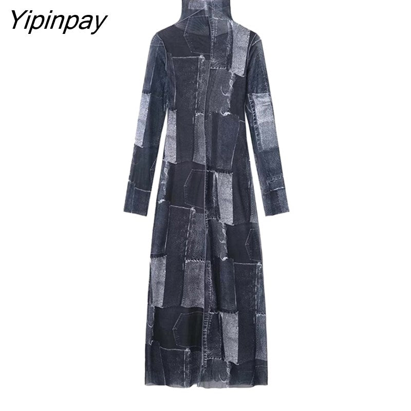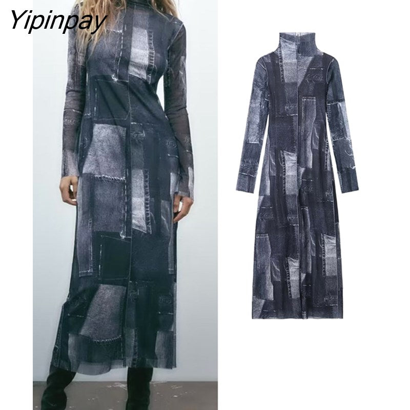 Yipinpay Elegant Women Patchwork Tulle Dresses Vintage Party Sheath Mid-Calf Dress Long Sleeve Turtleneck Vestidos Spring Autumn
