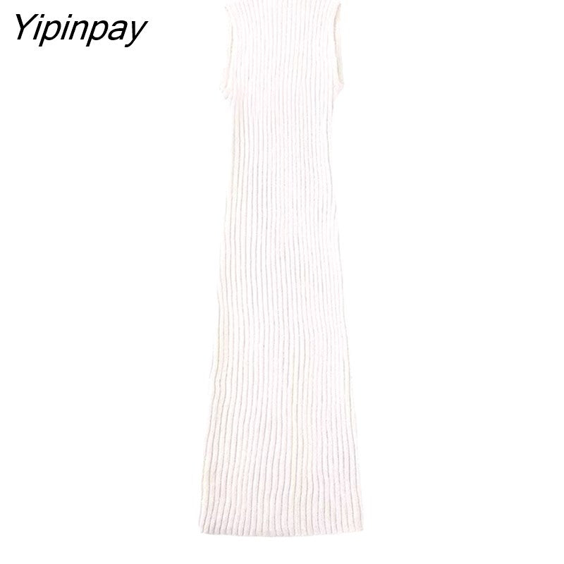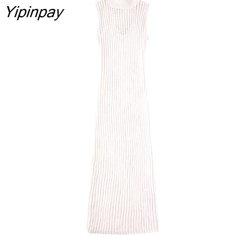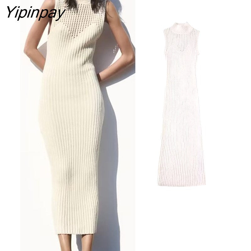 Yipinpay Elegant Women Solid Hollow Out Dresses 2023 Summer O-neck Sexy Mid-Calf Dress Fashion Causal Sleeveless Vestidos