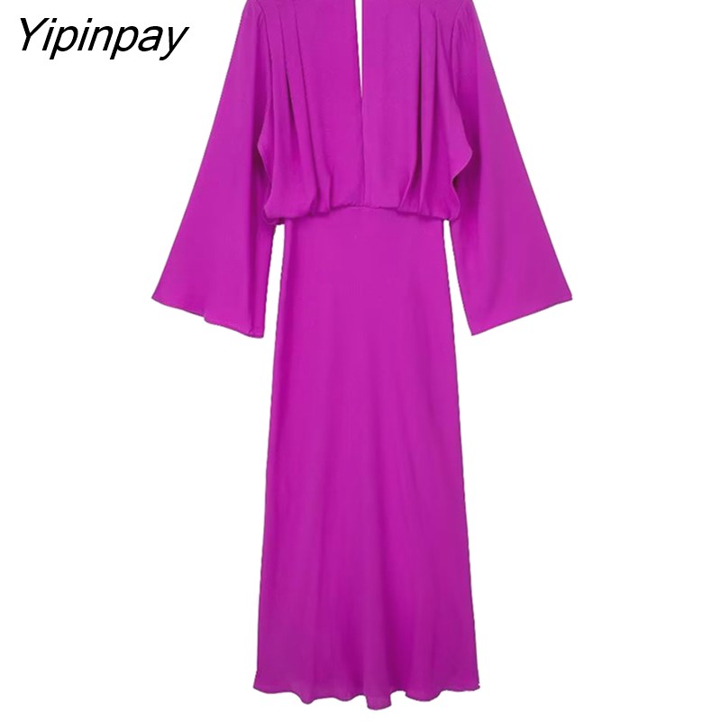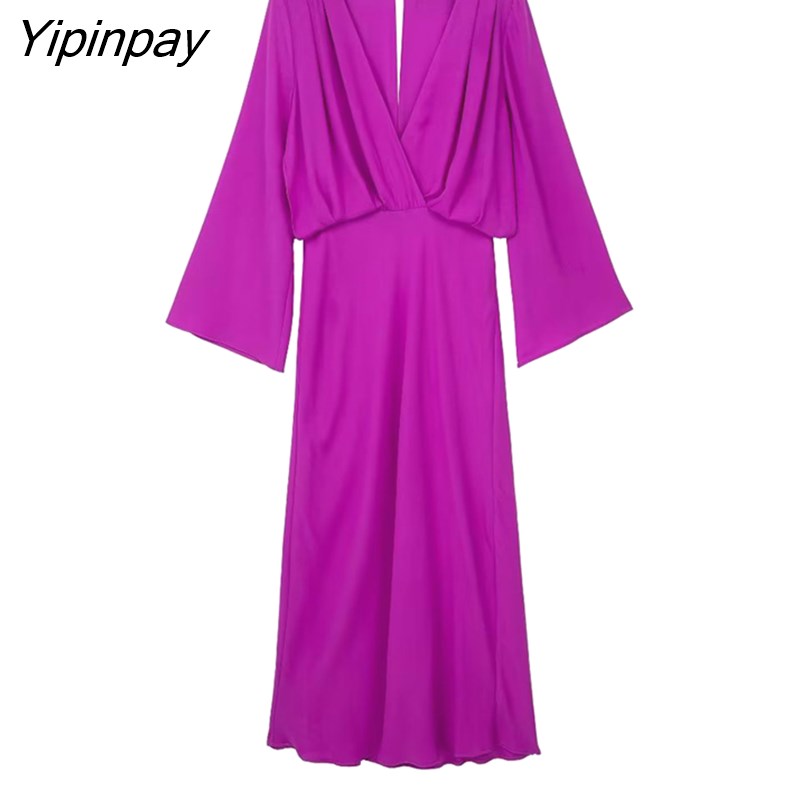 Yipinpay Elegant Women Solid Mid-Calf Dresses 2023 New Summer Fashion Deep V-neck A-line Long Sleeve Vestidos