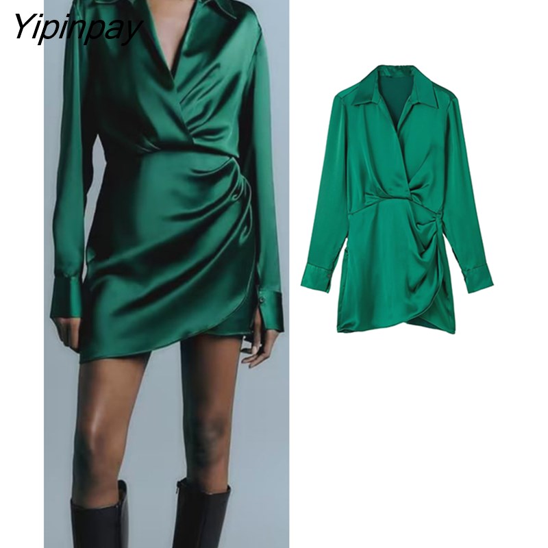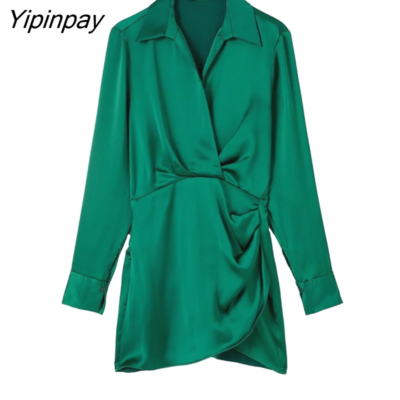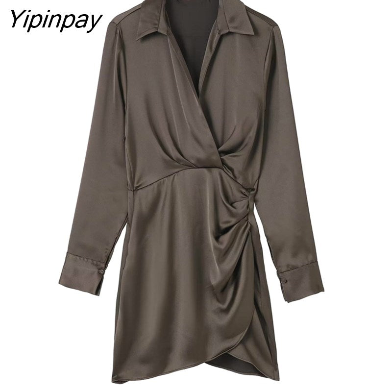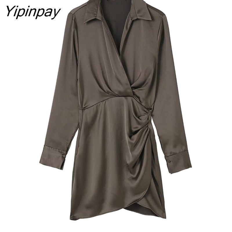 Yipinpay Elegant Women Solid Mini Dresses 2023 Spring Autumn Fashion Turn Down Collar Causal Dress A-line Long Sleeve Vestidos