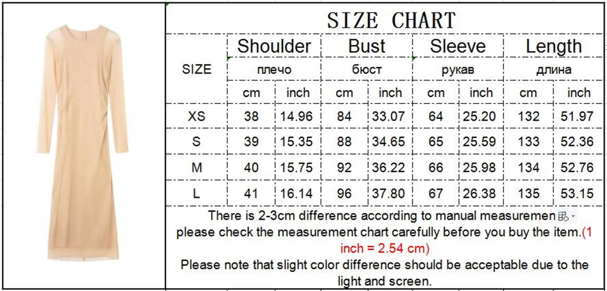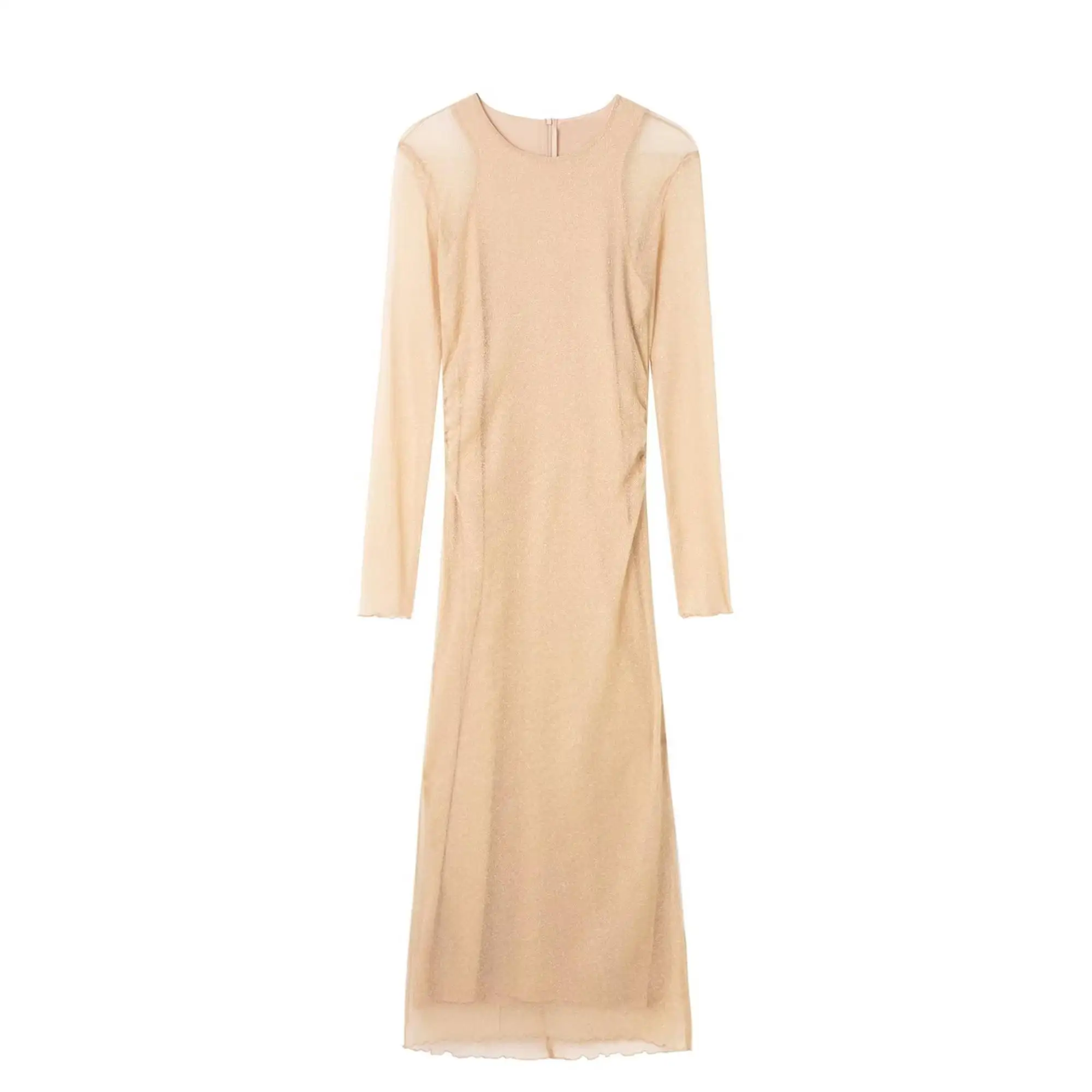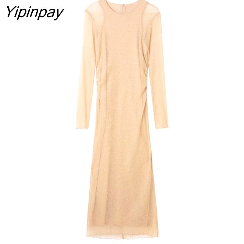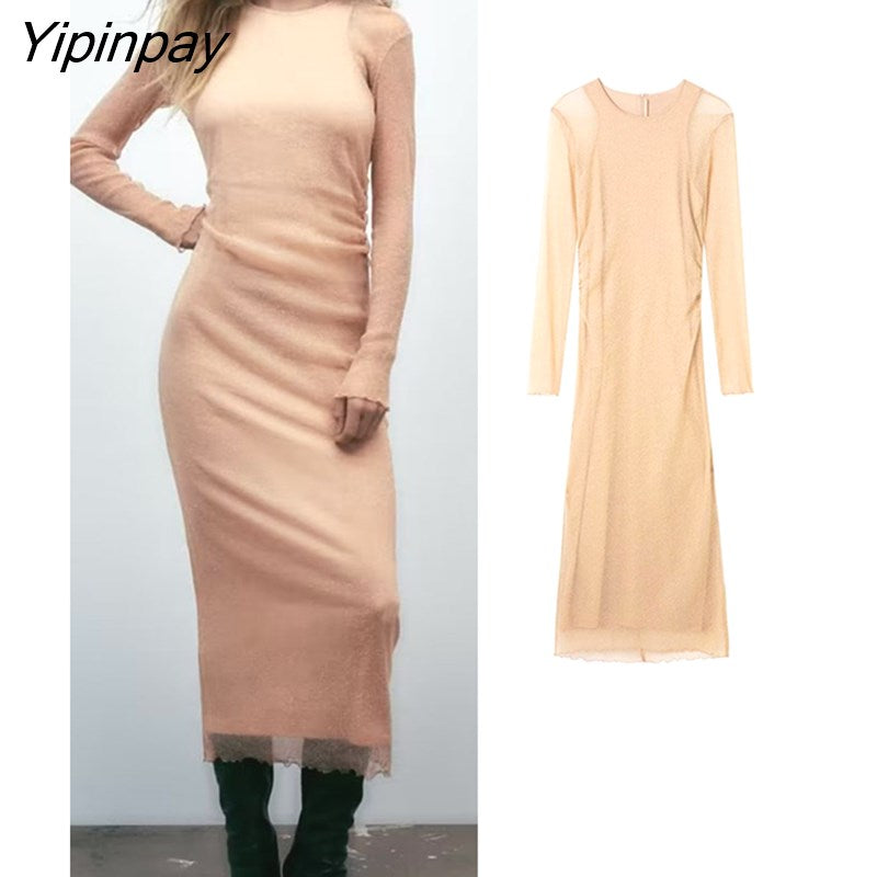 Yipinpay Elegant Women Solid Tulle Dresses Vintage Party Sheath Mid-Calf Dress Long Sleeve Vestidos 2023 Spring Autumn