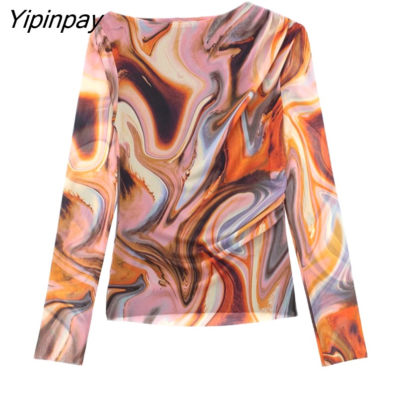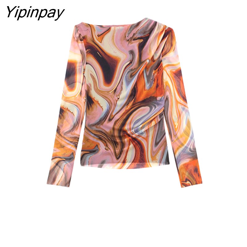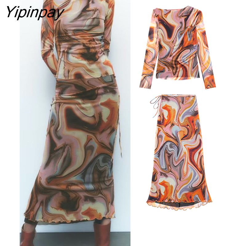 Yipinpay Elegant Women Tulle Printed Skirts Suits Folds Tops Bow Mid-Calf Skirts Sets Long Sleeve Shirt Blouse 2023 Spring Autumn