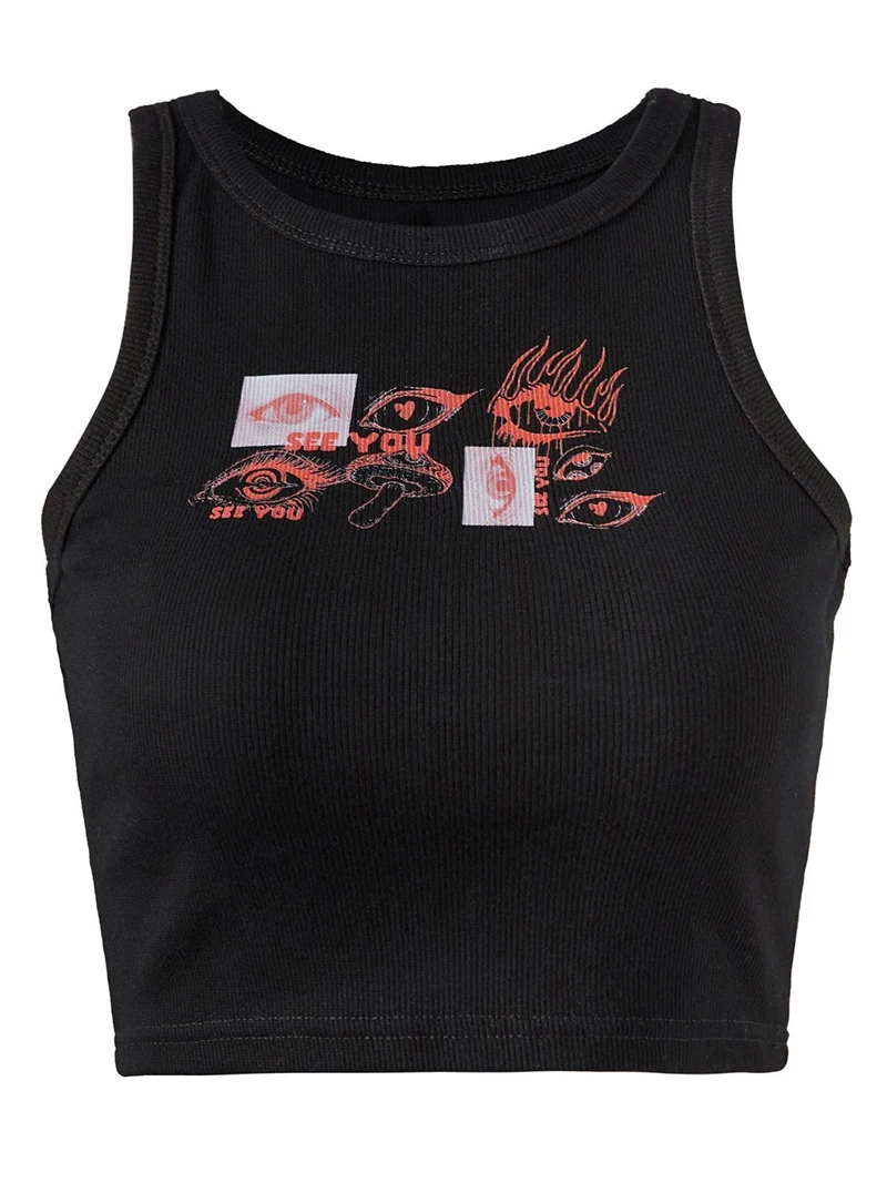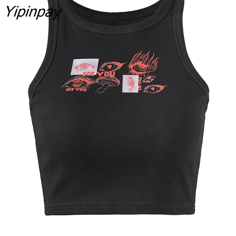 Yipinpay Eye Portrait Print T-shirt Aesthetic Y2K Crop Tops Short Sleevle Vest Tees Harajuku Streetwear Suspenders Women Clothes