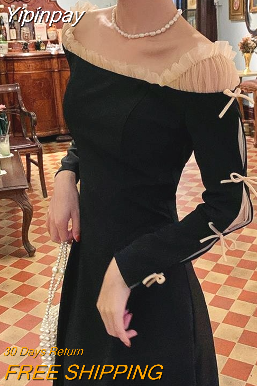 Yipinpay Fahsion Evening Party Dress Women Off Shoulder Bow Vintage Midi Dress Lady Elegant Long Sleeve Black Dress 2023 Winter