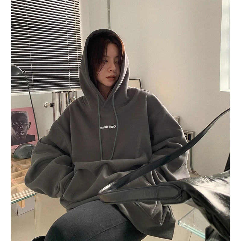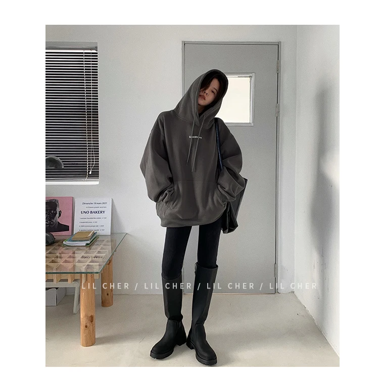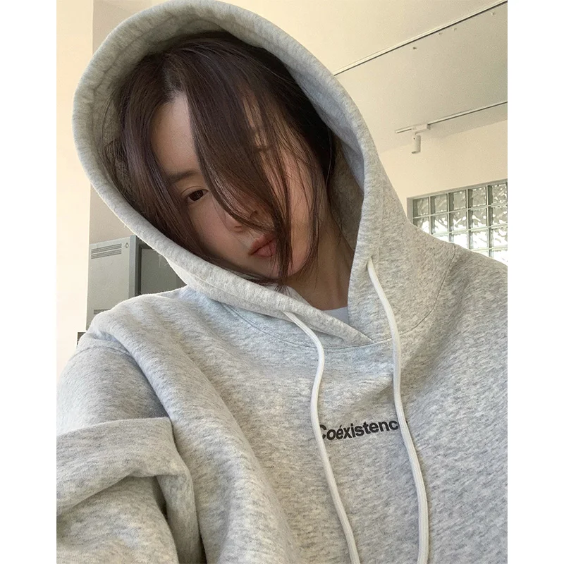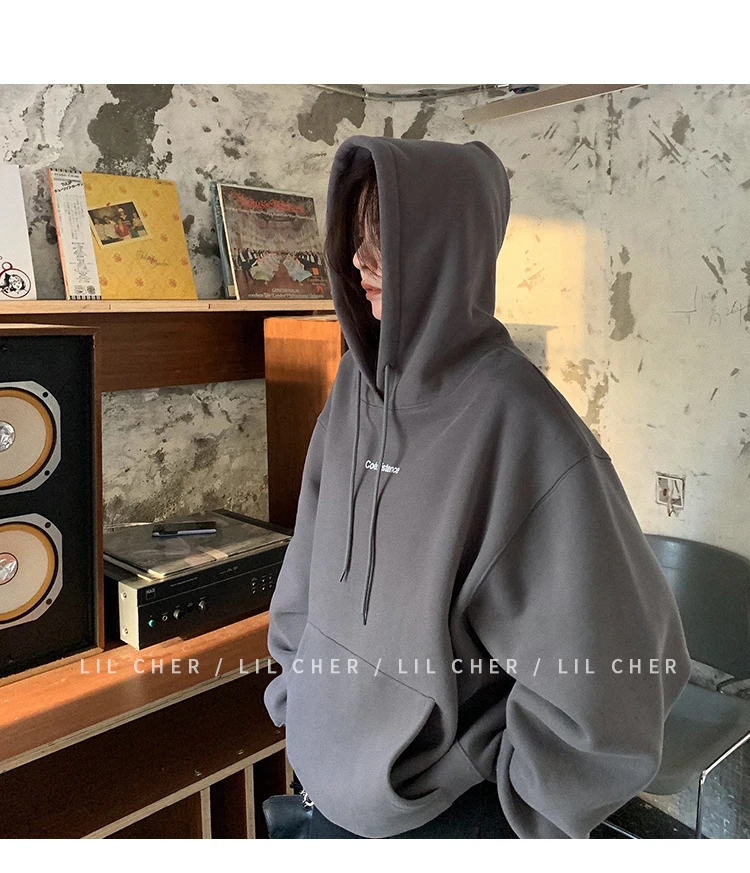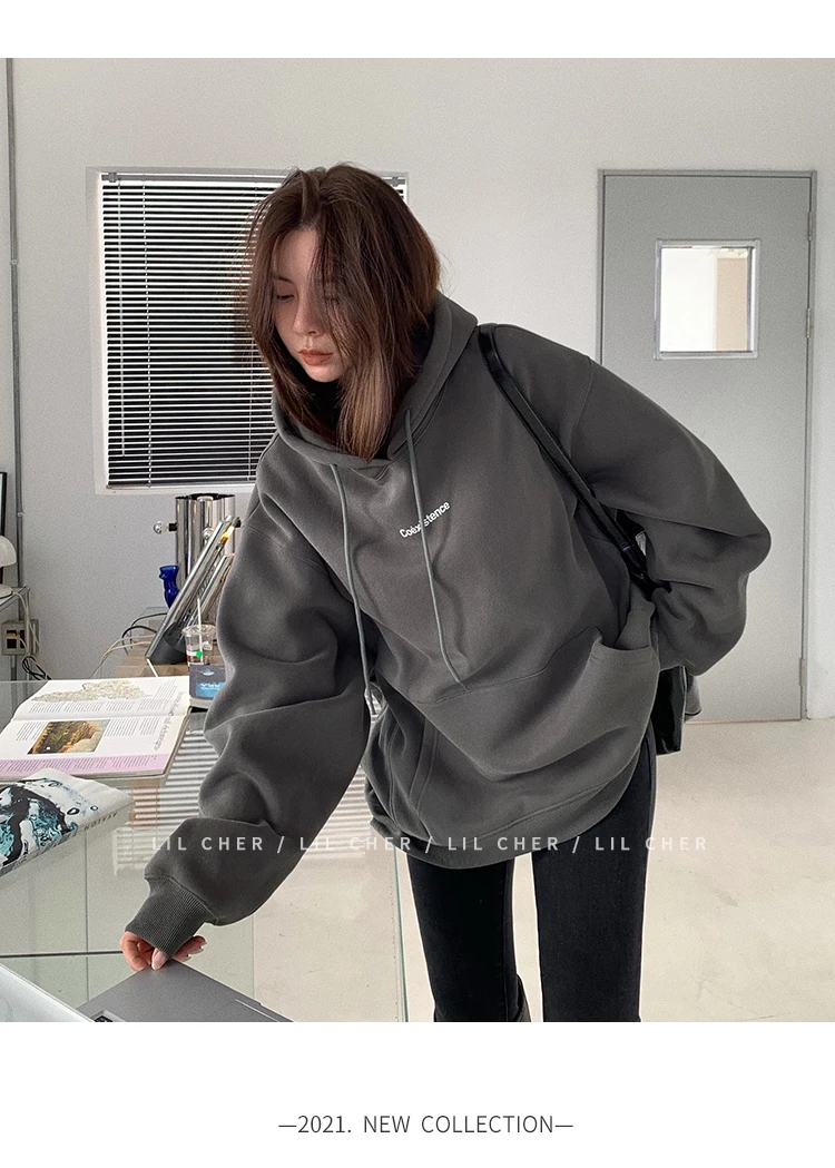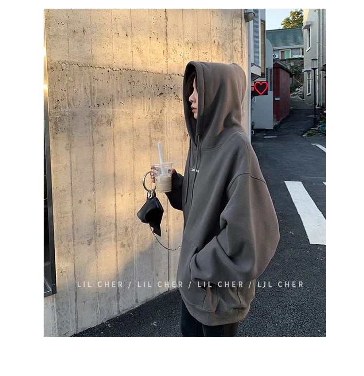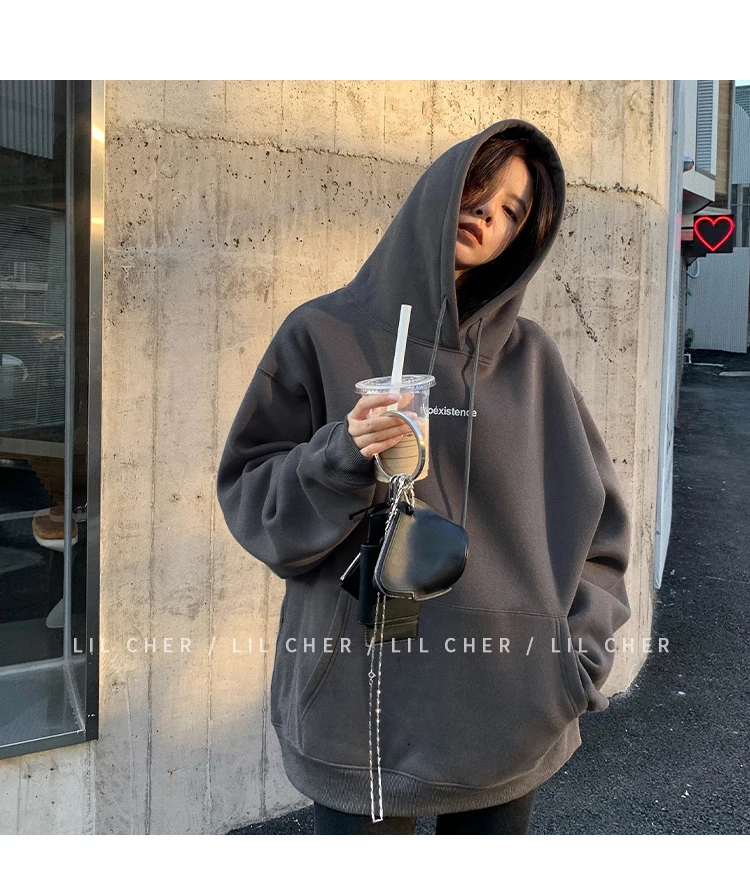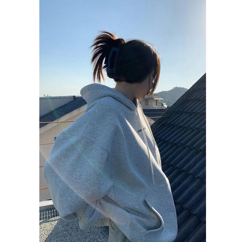 yipinpay Fashion Grey Fleece Thicken Baggy Pullover Pocket Letter Printing Sweatshirt Lazy Casual Raglan Sleeves Hoodie Autumn