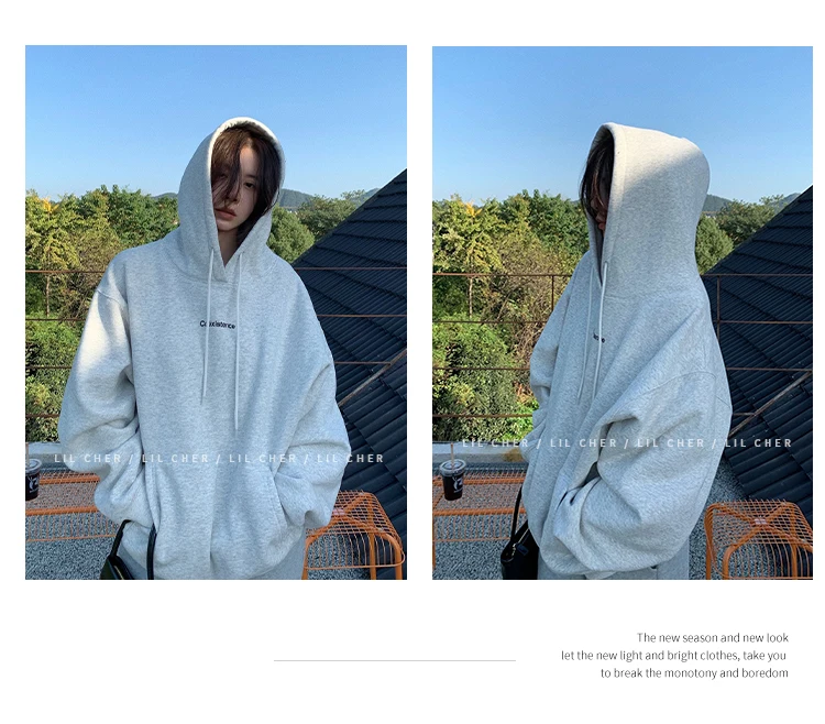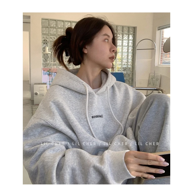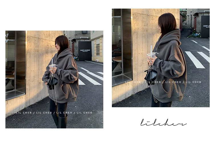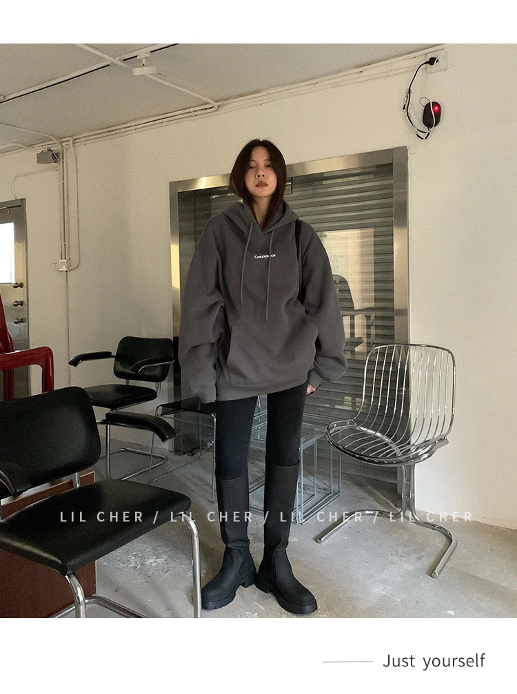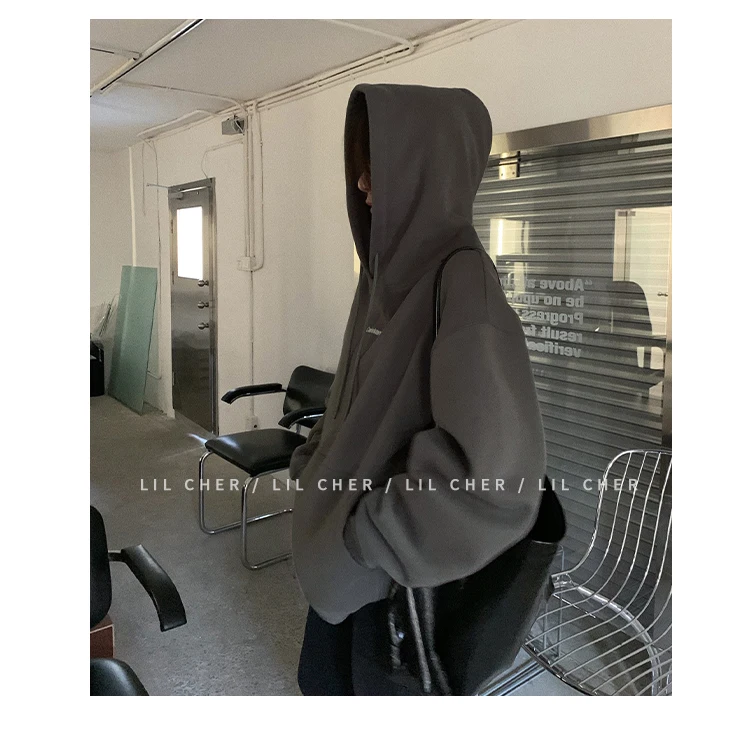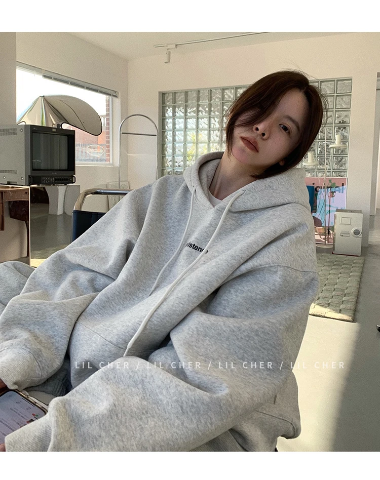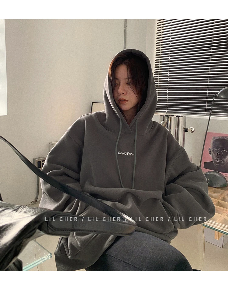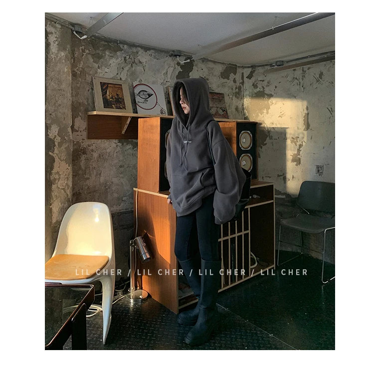 yipinpay Fashion Grey Fleece Thicken Baggy Pullover Pocket Letter Printing Sweatshirt Lazy Casual Raglan Sleeves Hoodie Autumn