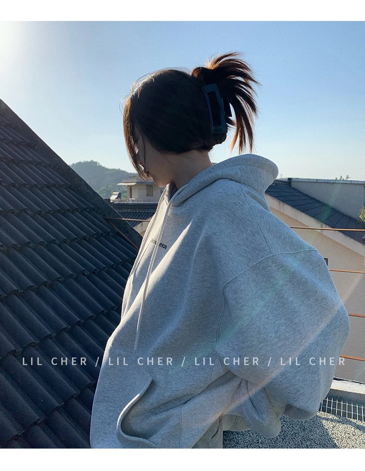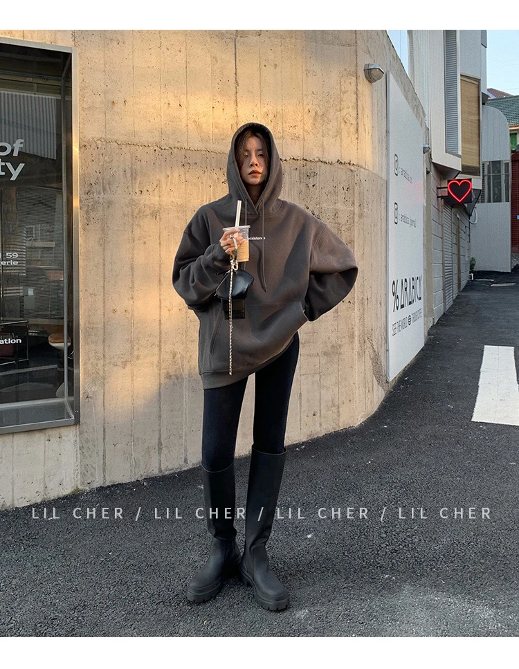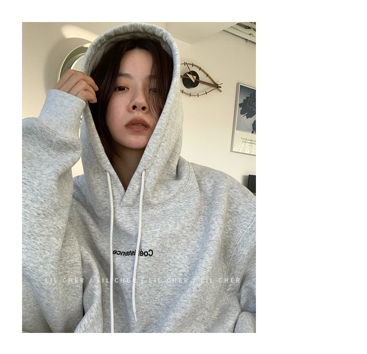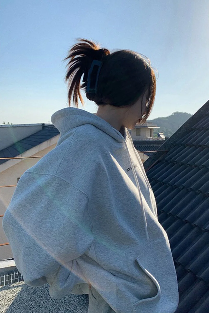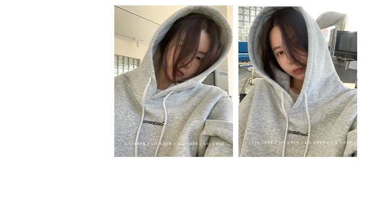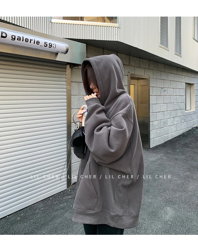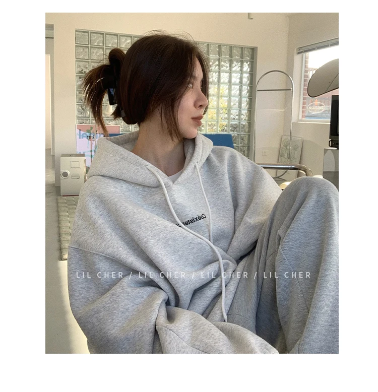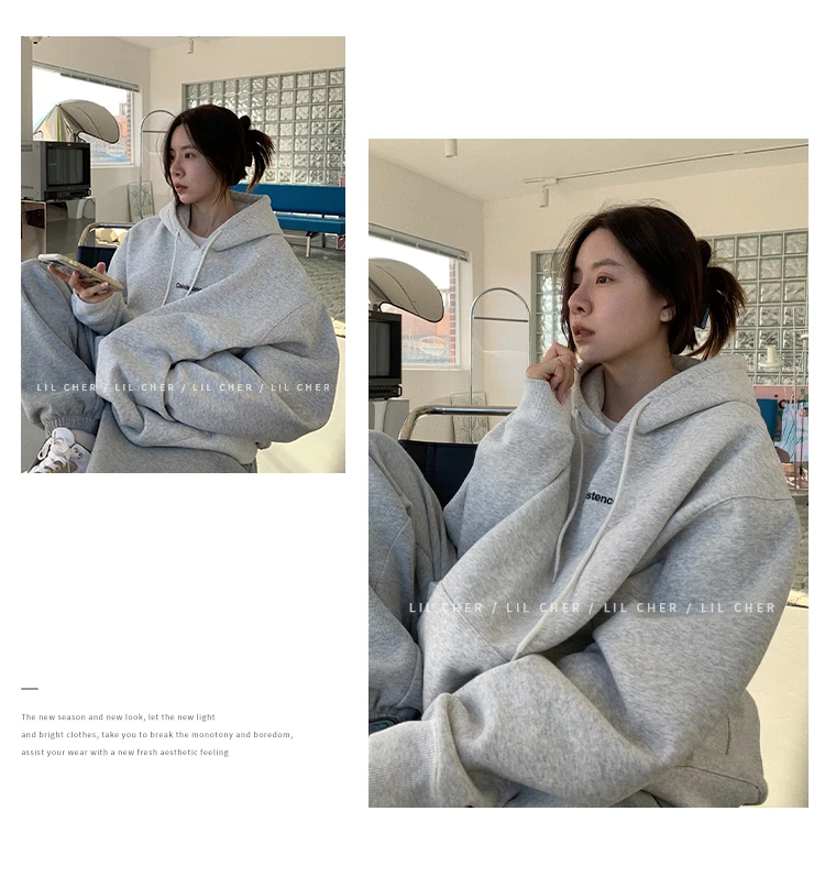 yipinpay Fashion Grey Fleece Thicken Baggy Pullover Pocket Letter Printing Sweatshirt Lazy Casual Raglan Sleeves Hoodie Autumn