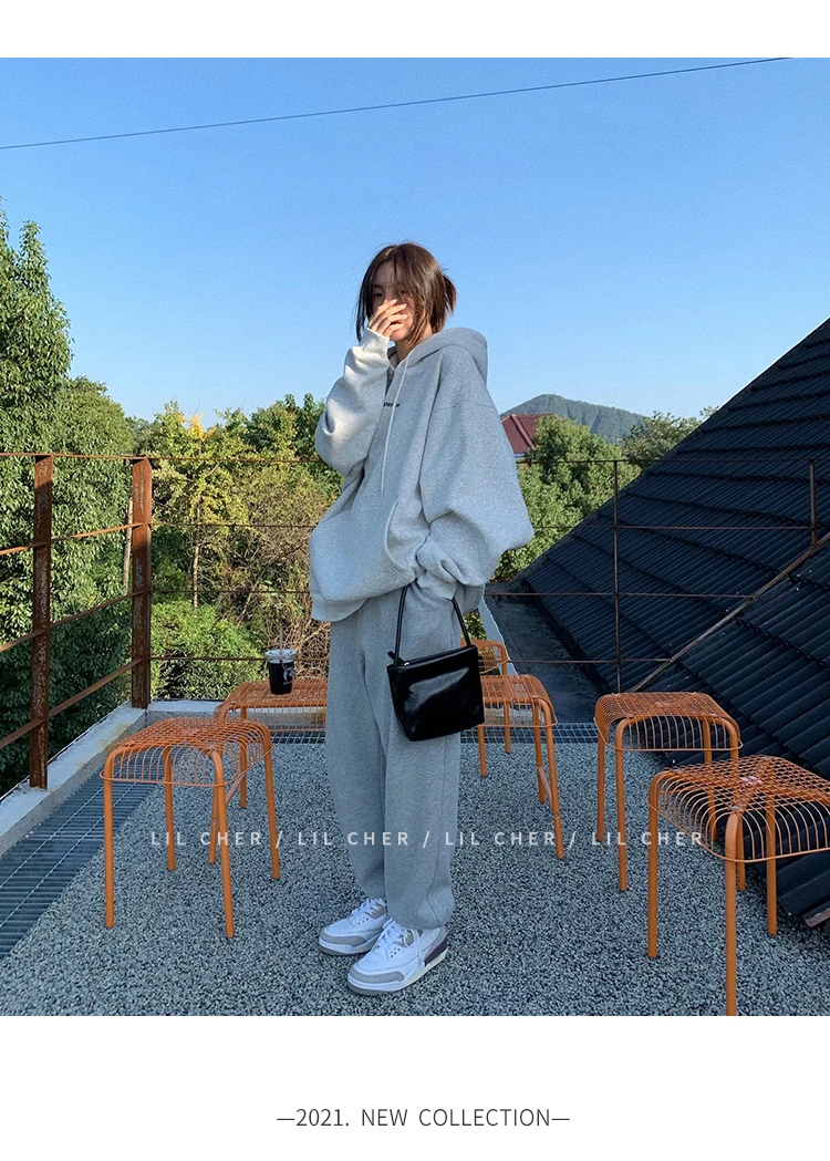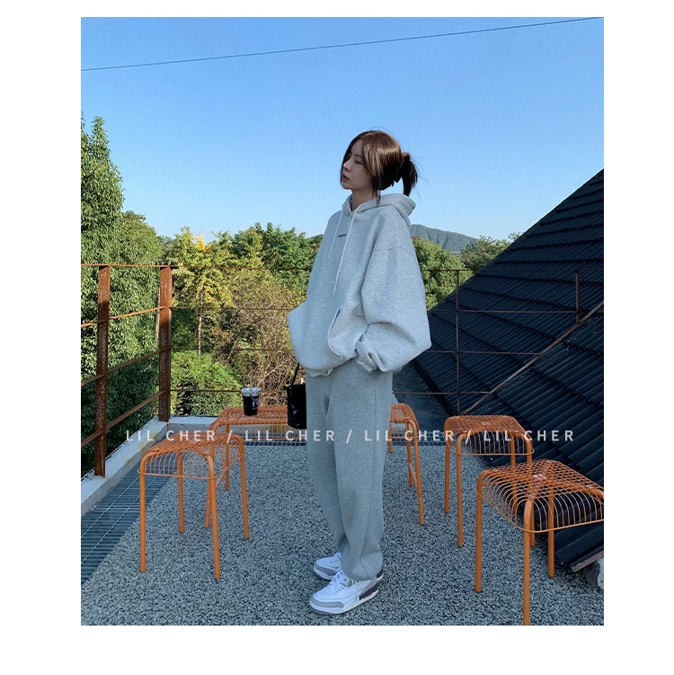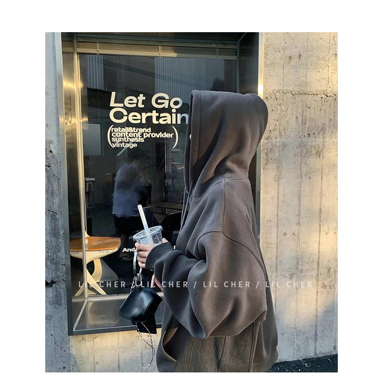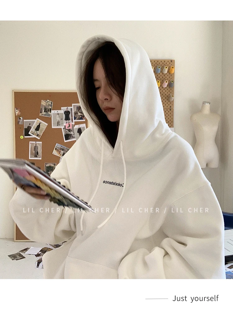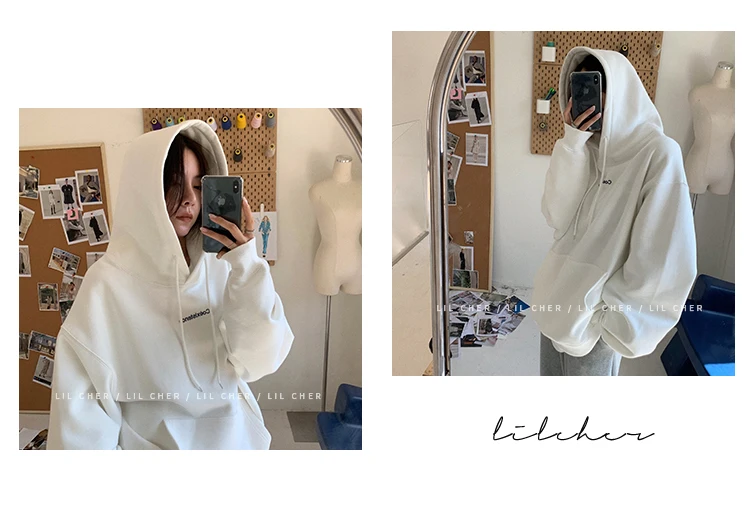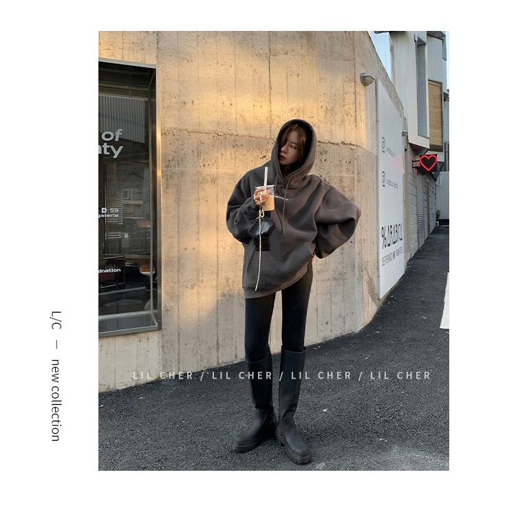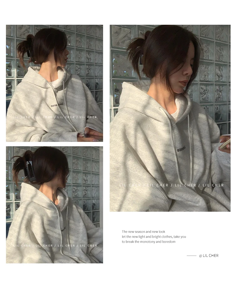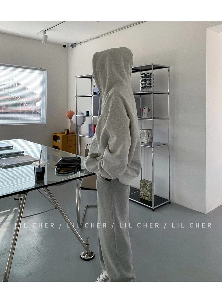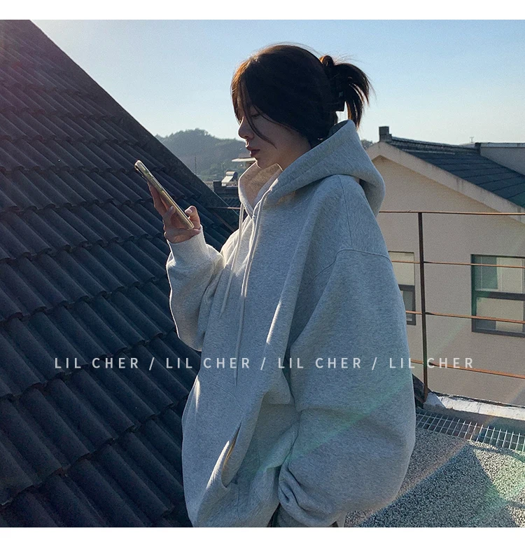 yipinpay Fashion Grey Fleece Thicken Baggy Pullover Pocket Letter Printing Sweatshirt Lazy Casual Raglan Sleeves Hoodie Autumn