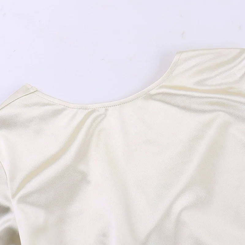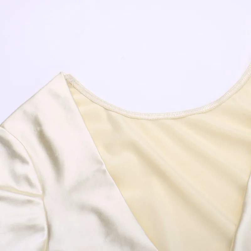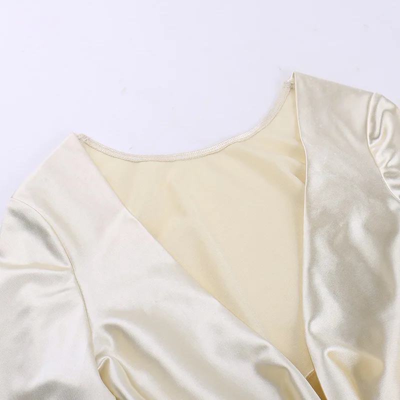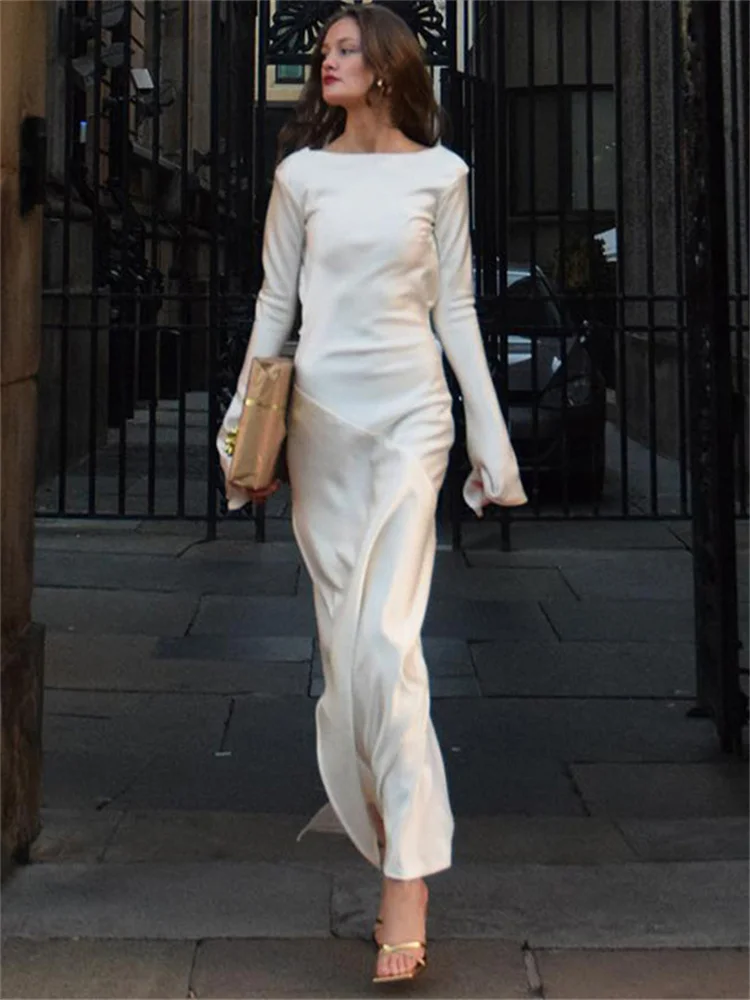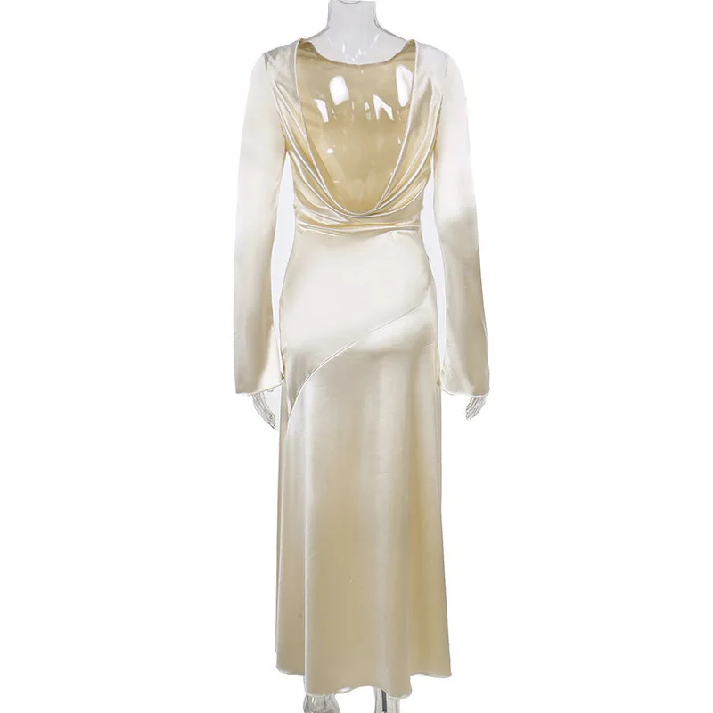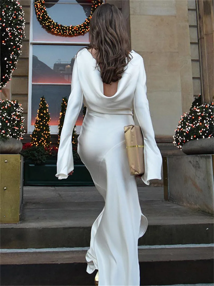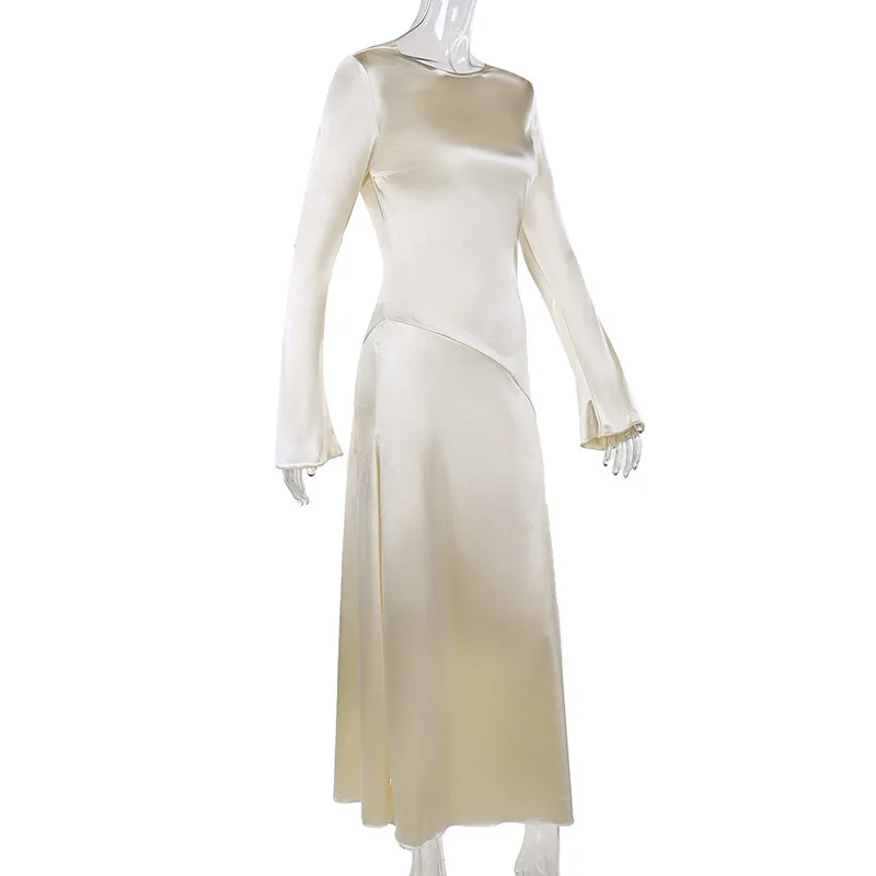 Yipinpay Fashion Satin Backless Long Dress For Women Slim Solid Patchwork High Waist Split Long Sleeve Elegant Dress Party Looks