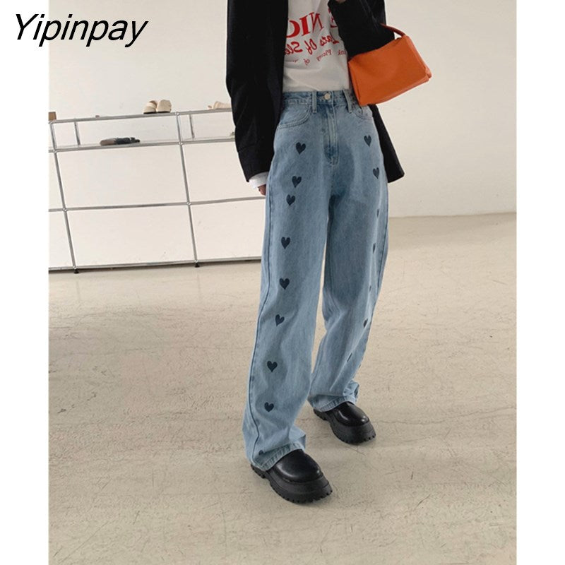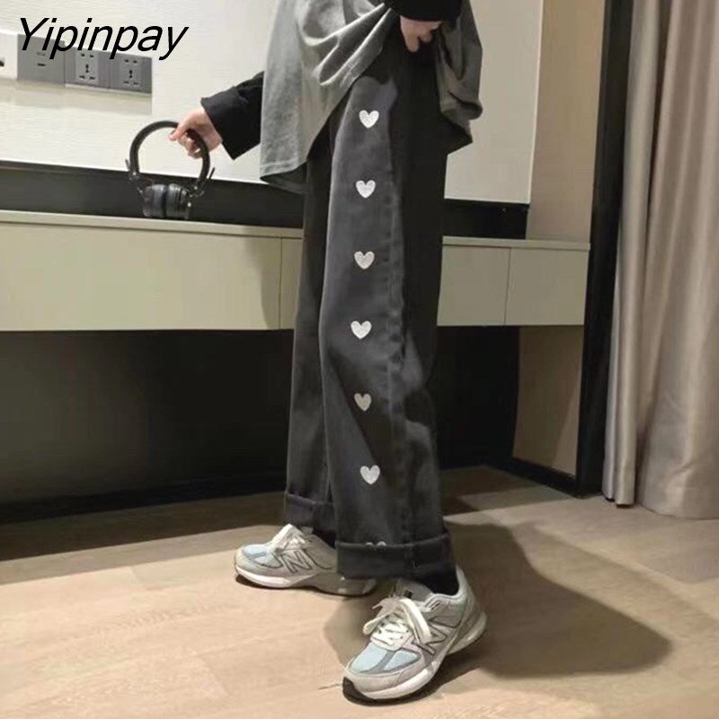 Yipinpay Fashion style Women jeans Vintage Straight Wide leg pants High waist Oversize Loose Long jeans Heart print Casual jean