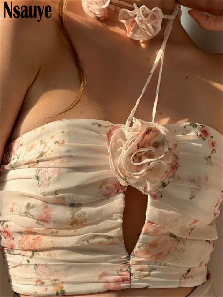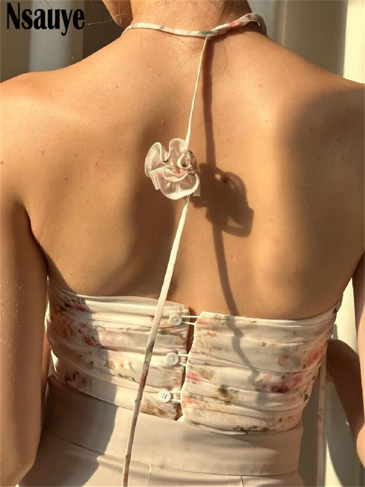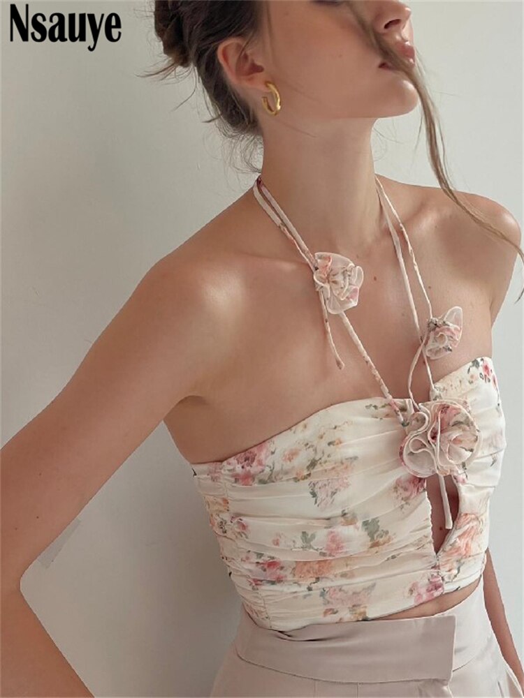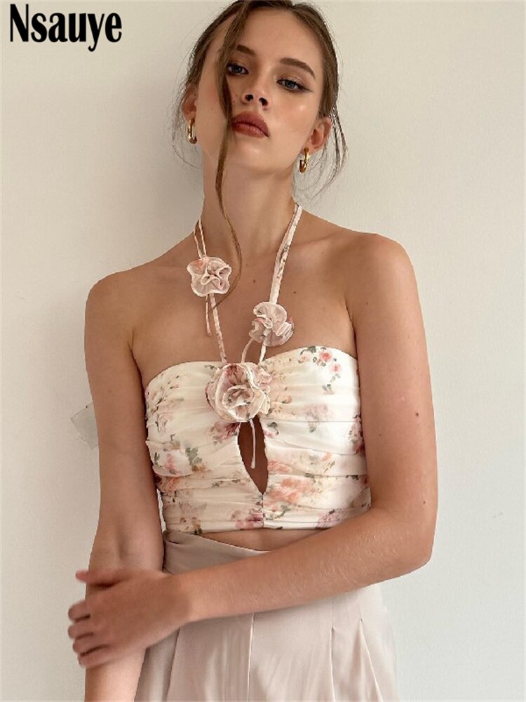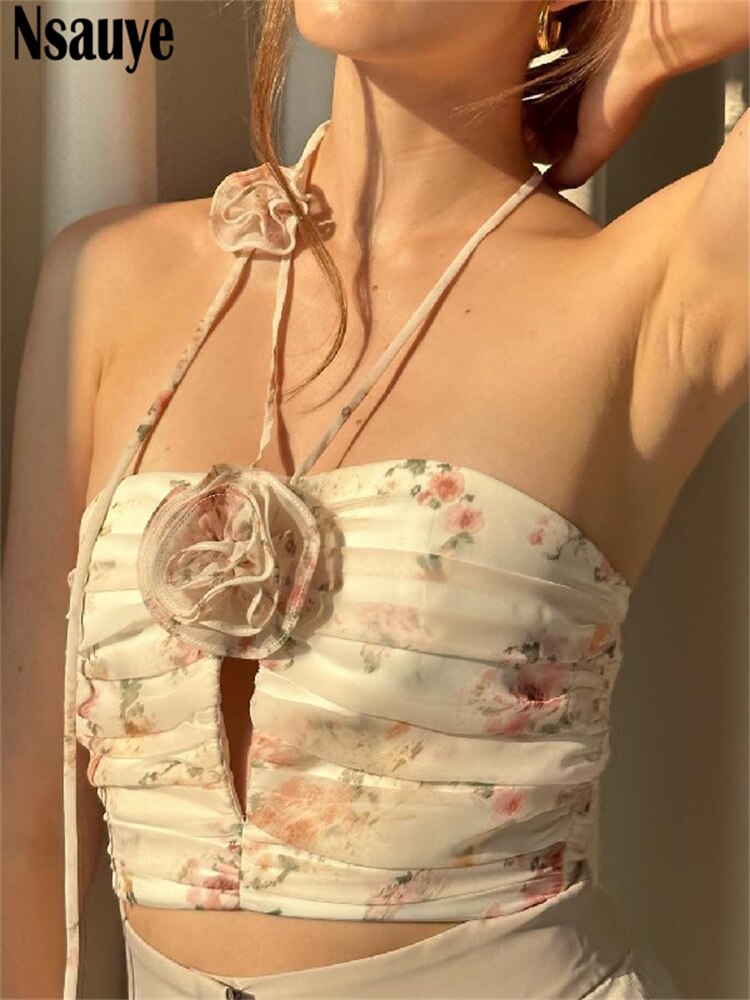 yipinpay Fashion Women Sexy Hollow Out Flower Print Vintage Sleeveless Mini Halter Club Crop Tops Y2K 2023 Summer Party Tank Tops