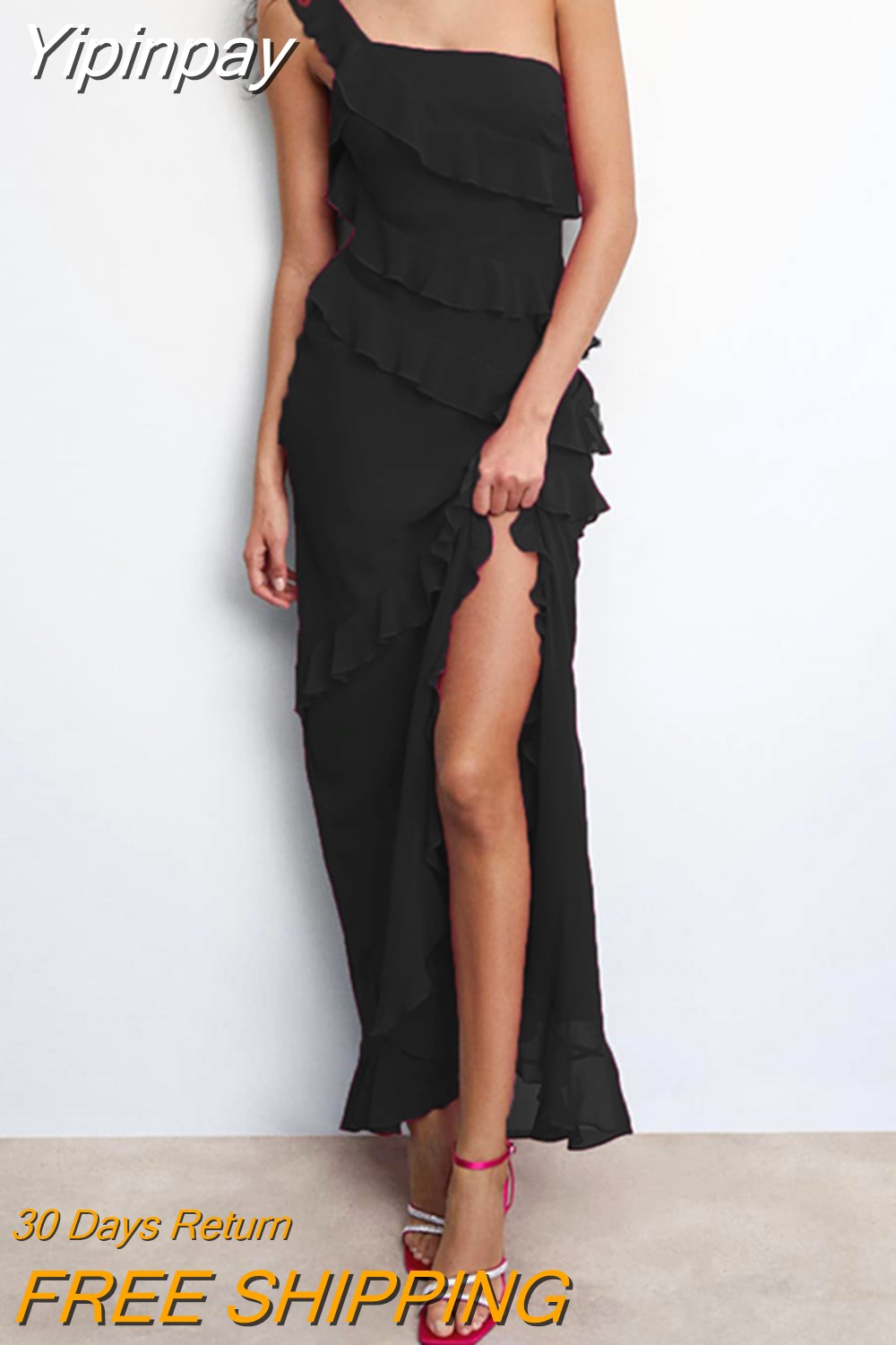 Yipinpay Fashion Women Slip Dress Sleeveless One-Shoulder Ruffled Slip Dress Summer Long Slit Dress For Cocktail Party Street Style