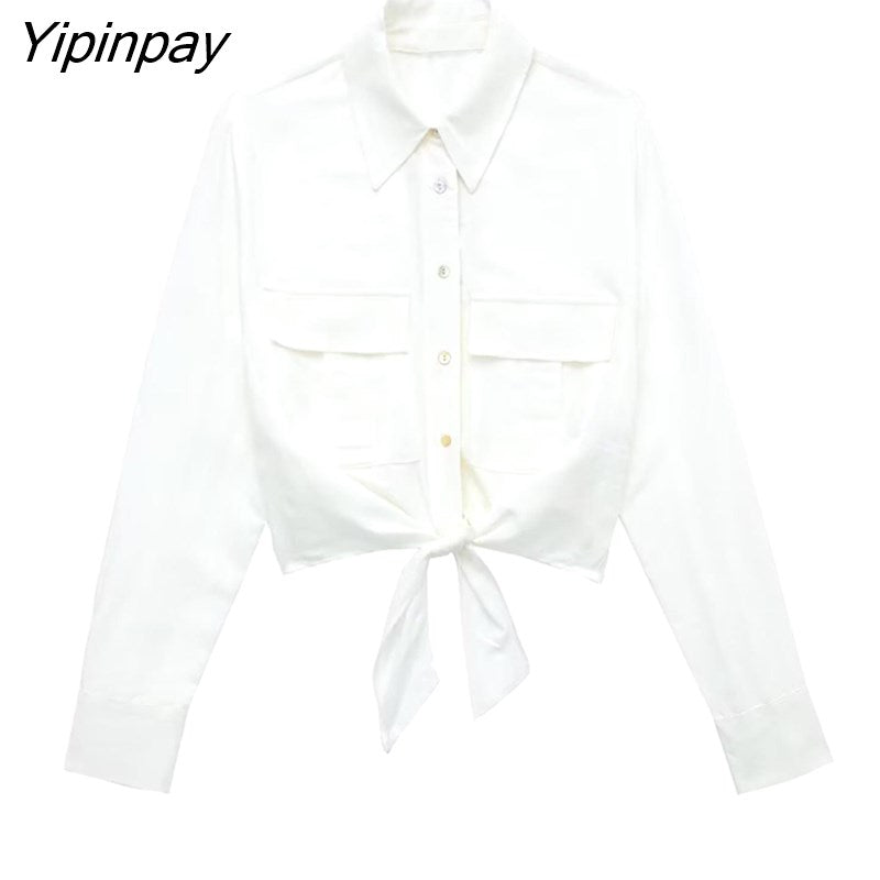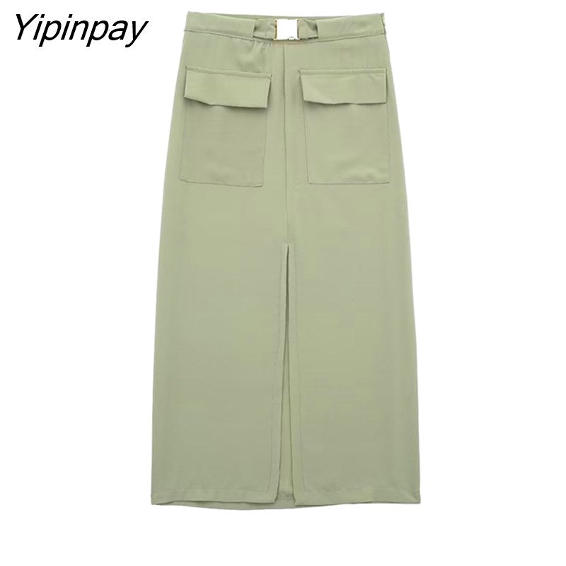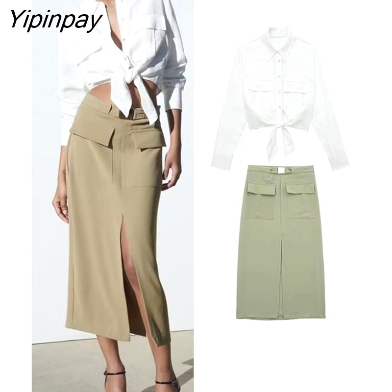 Yipinpay Fashion Women Solid Skirts Sets 2023 Summer Female Elegant Single Breasted Bow Shirts Mid-Calf A-Line Skirts With Belt Sets