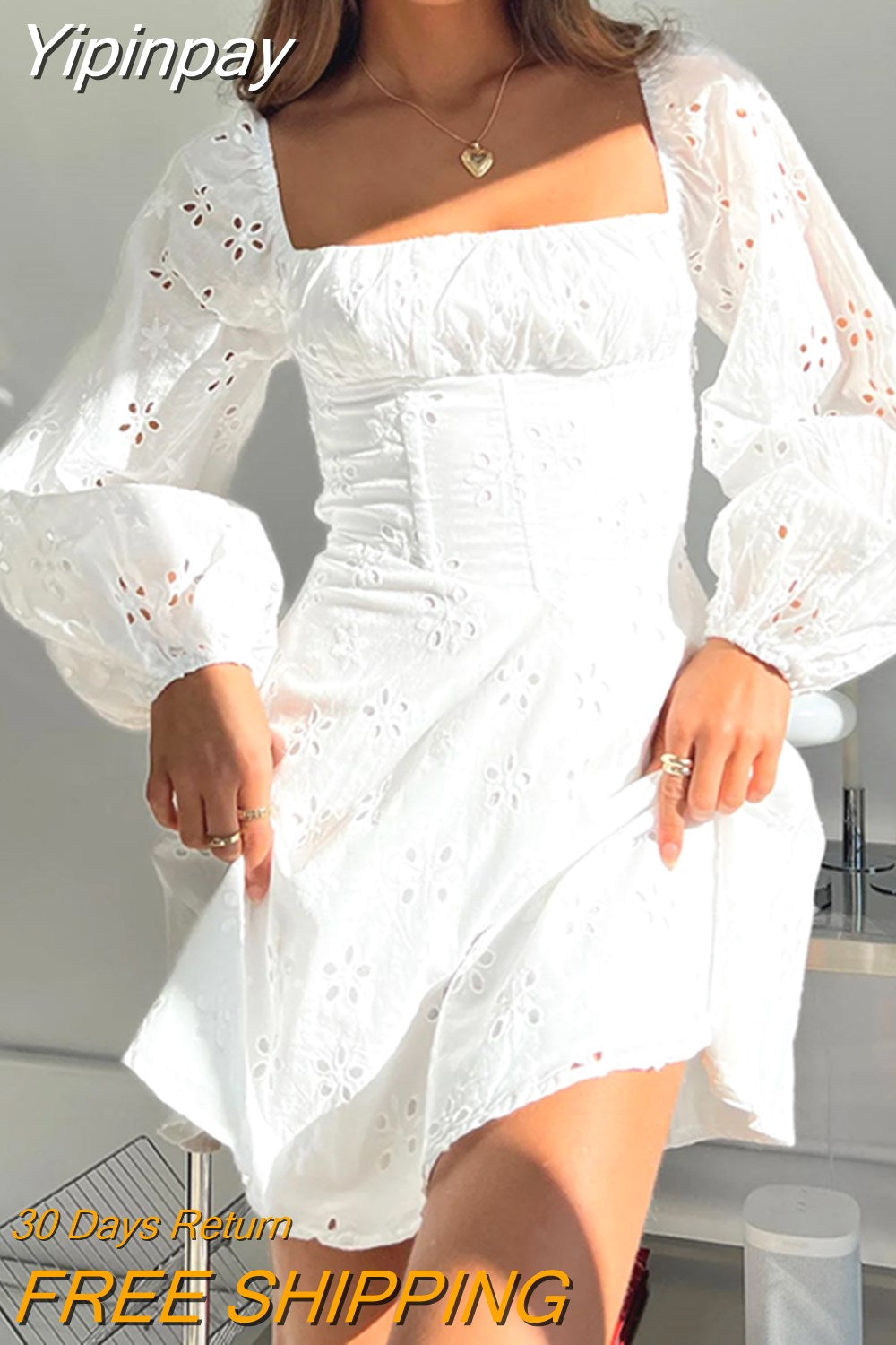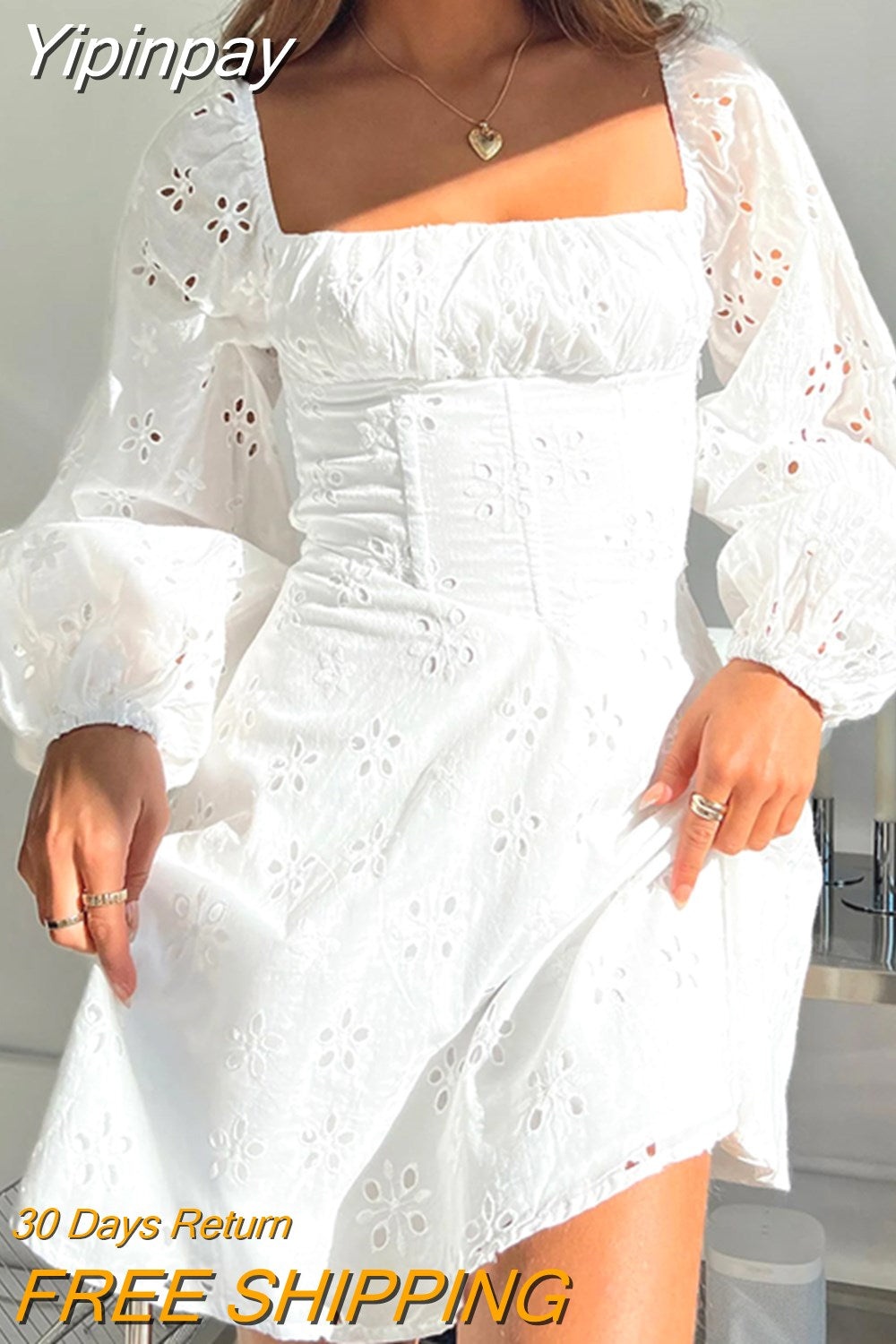 Yipinpay Fashion Womens Mini A-Line Dress Casual Long Puff Sleeve Ruched Bust Solid Color Dress Eyelet Embroidery Dress Hot Sale