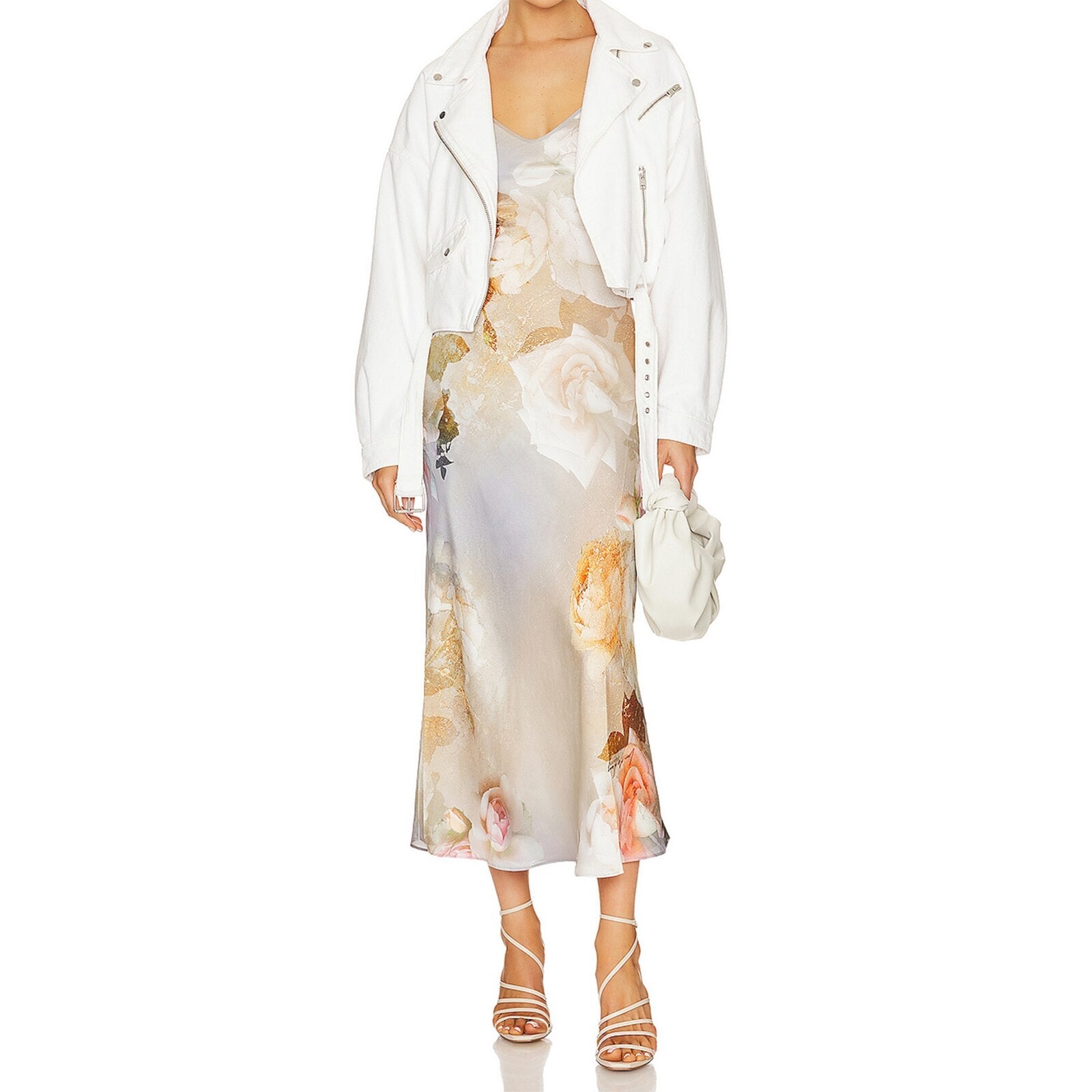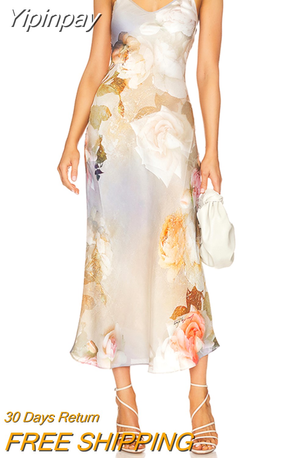 Yipinpay Fashion Womens Satin Long Dress Sleeveless Spaghetti Strap V Neck Floral Print Cocktail Party Dress Evening Gown Hot Sale