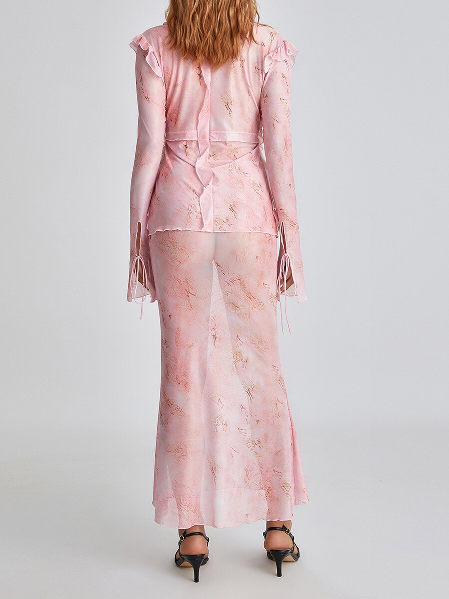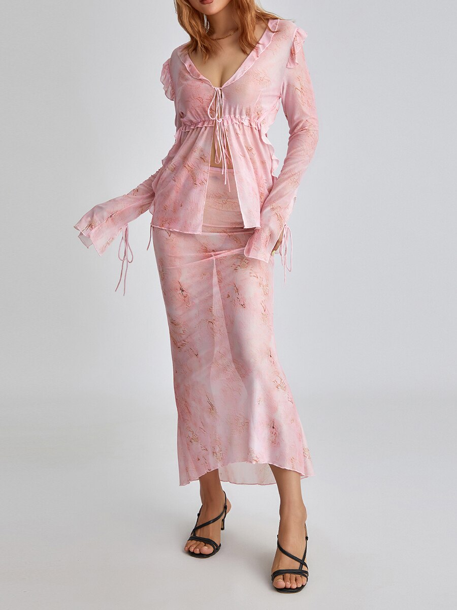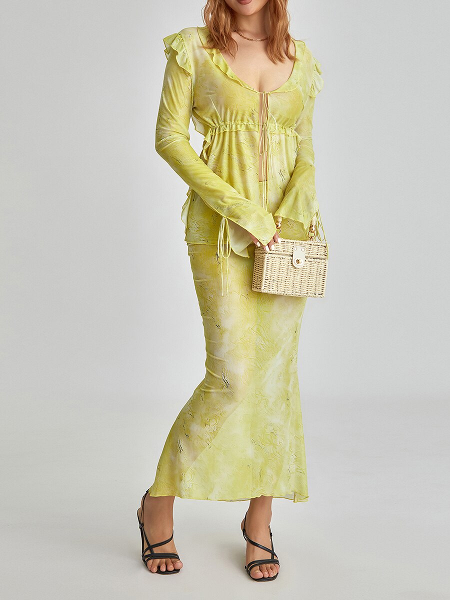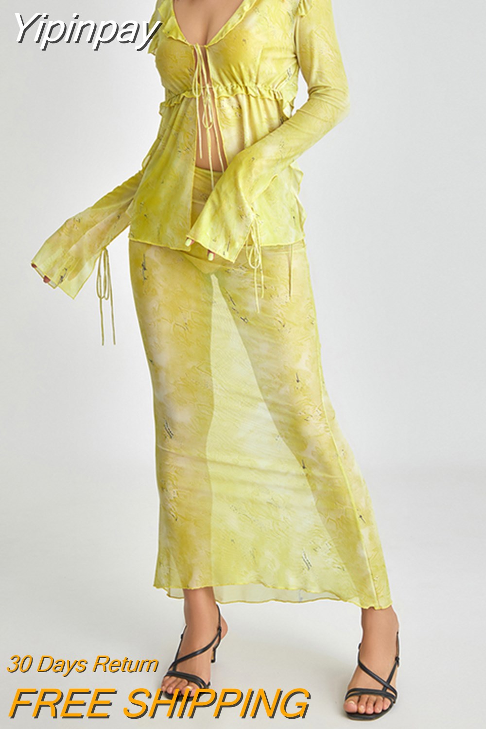 Yipinpay Fashion Womens Two Piece Summer Outfits Tie-Up Front Sheer Mesh Tops And Long Skirt Set Club Party Street Style S-XL