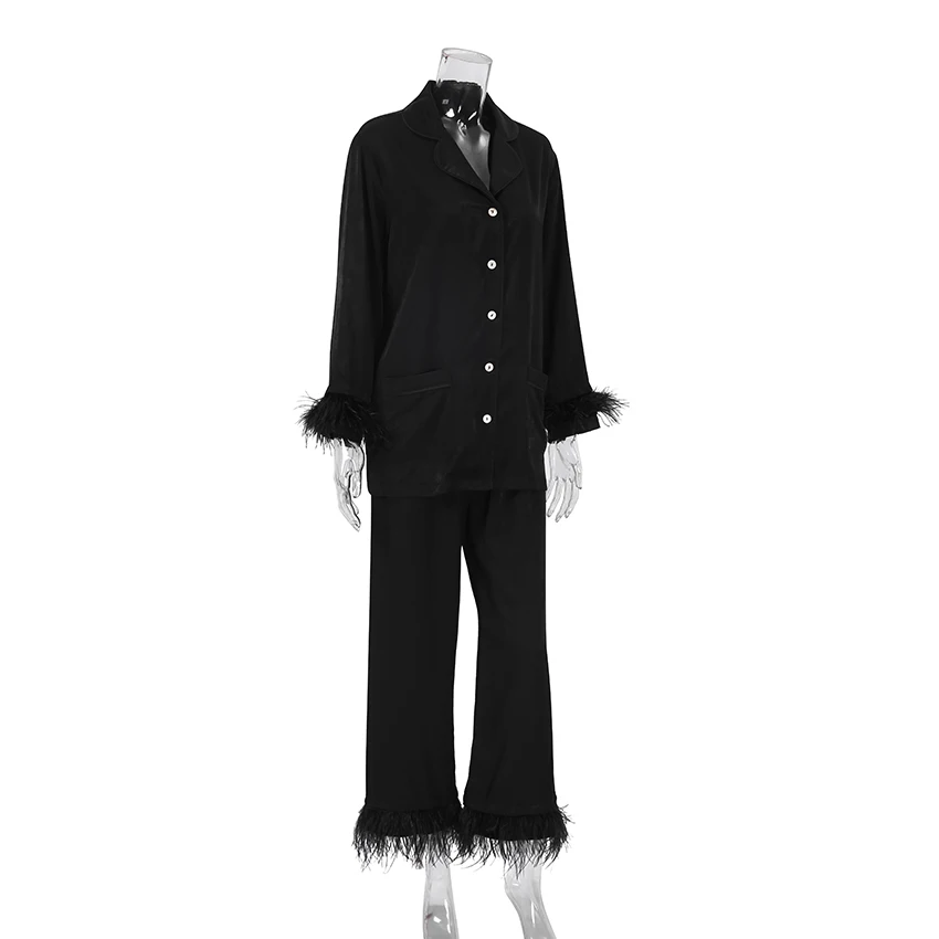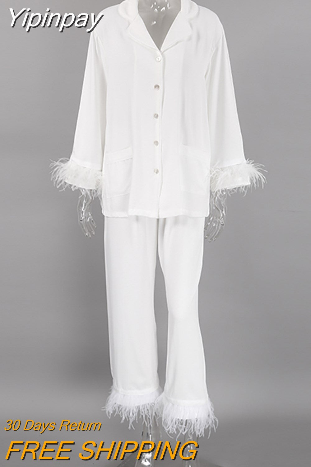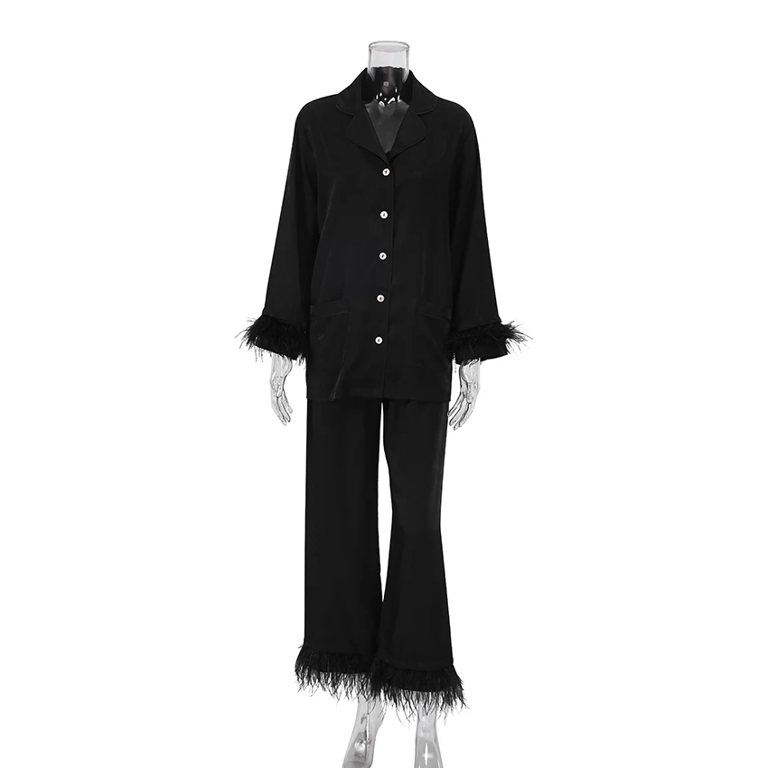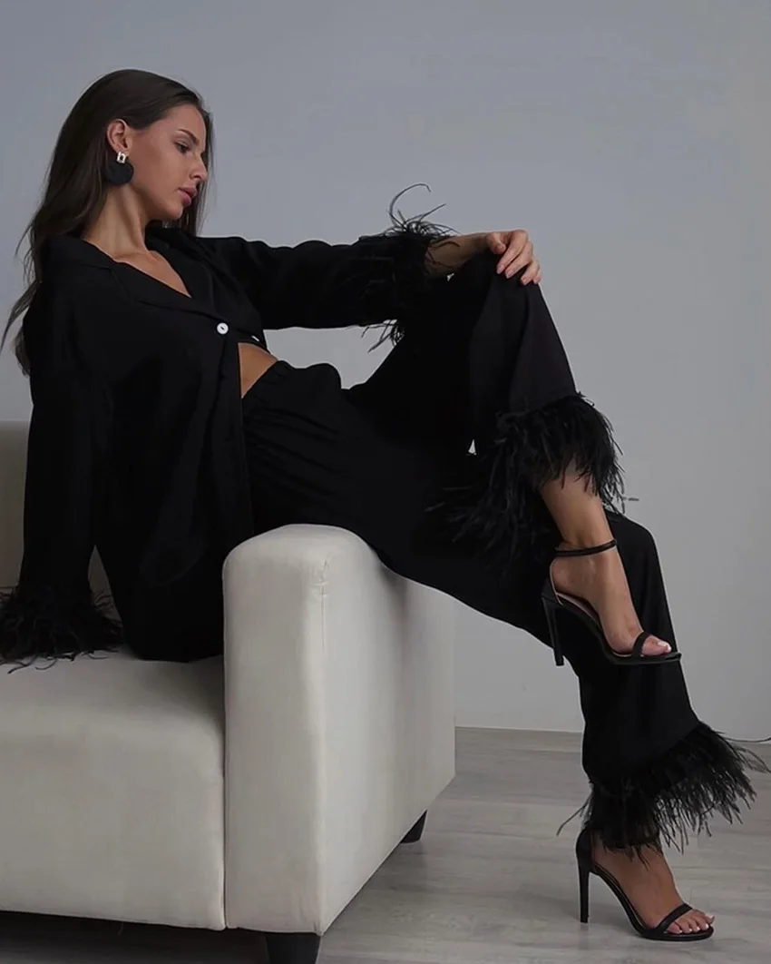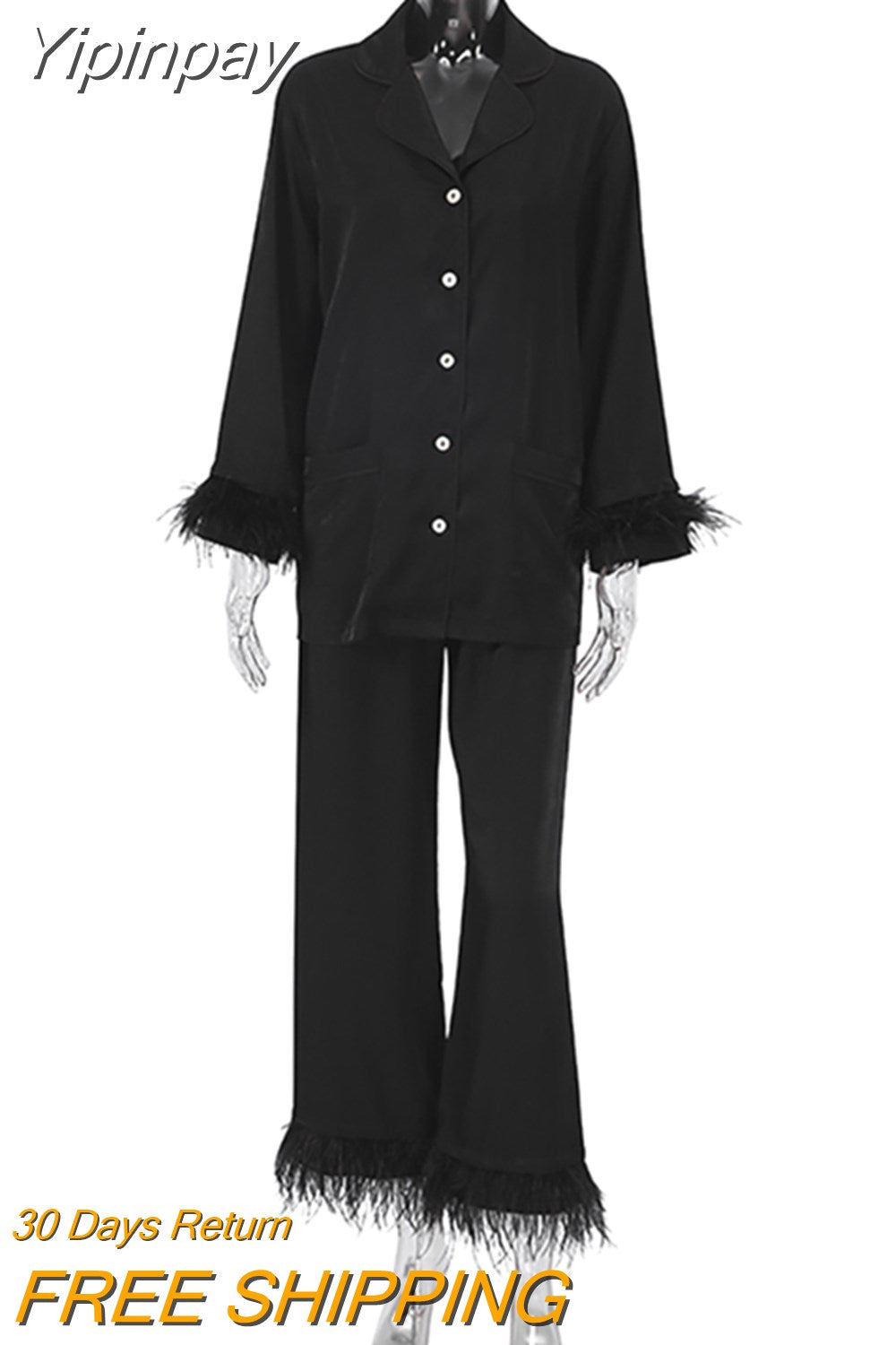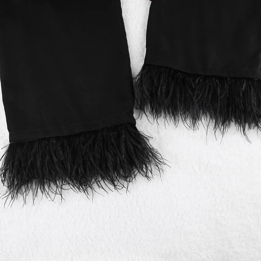 Yipinpay Feather Cuffs Pants Sets Of Two Fashion Pieces For Women Sleepwear Notched Shirts And Wide Leg Pant Homewear Outfits