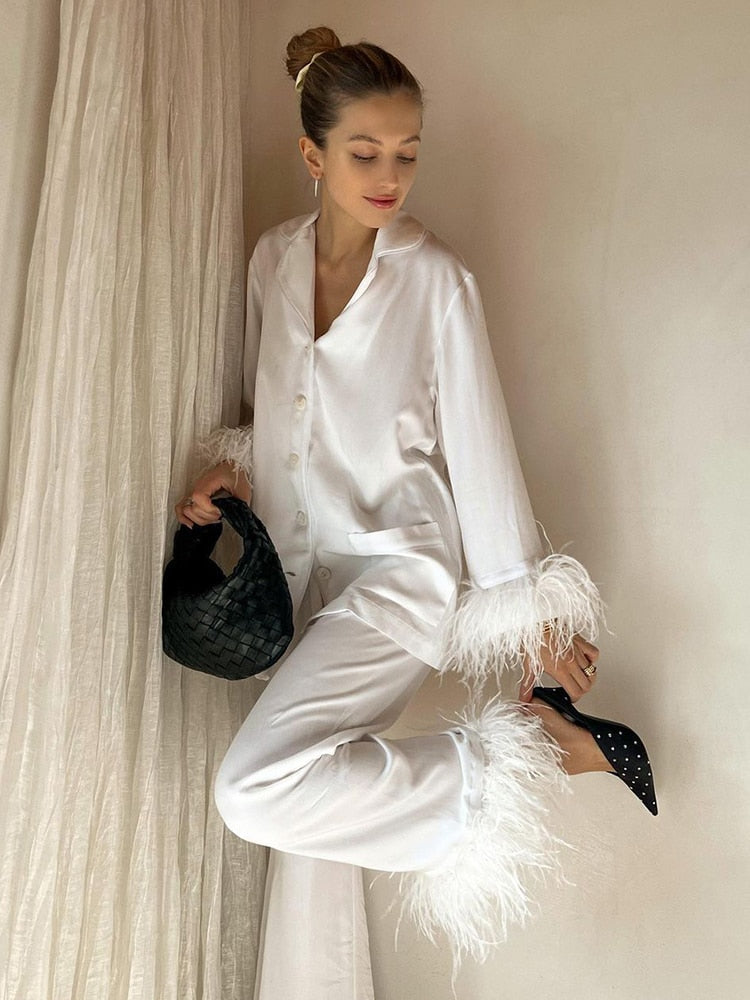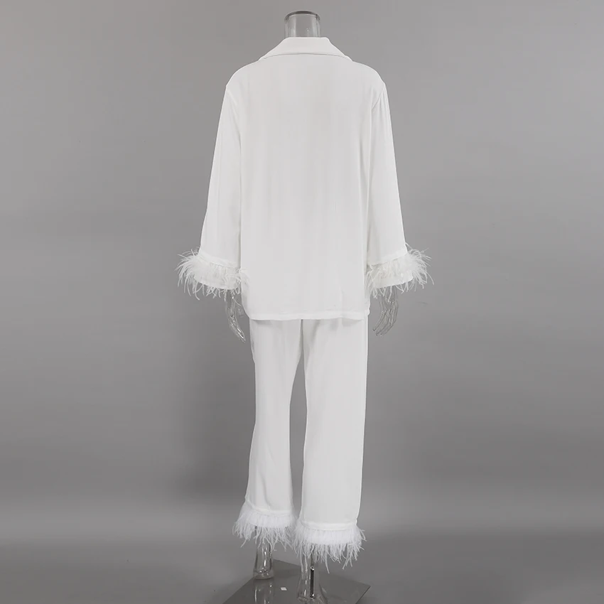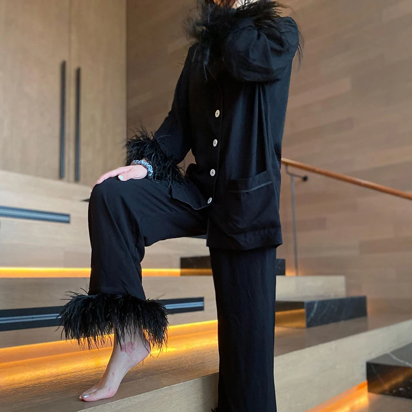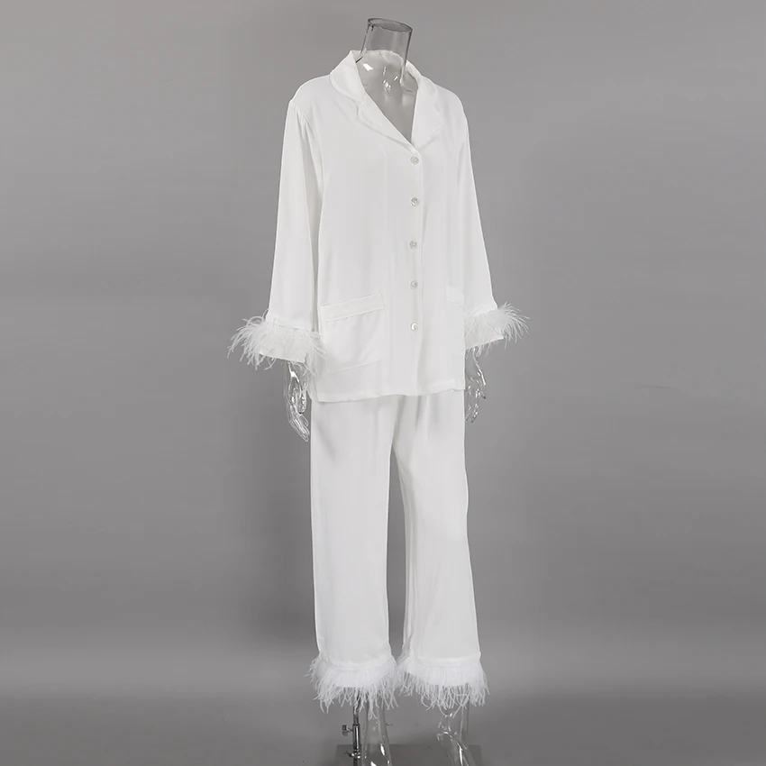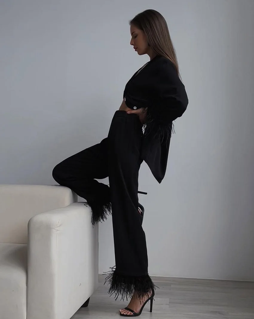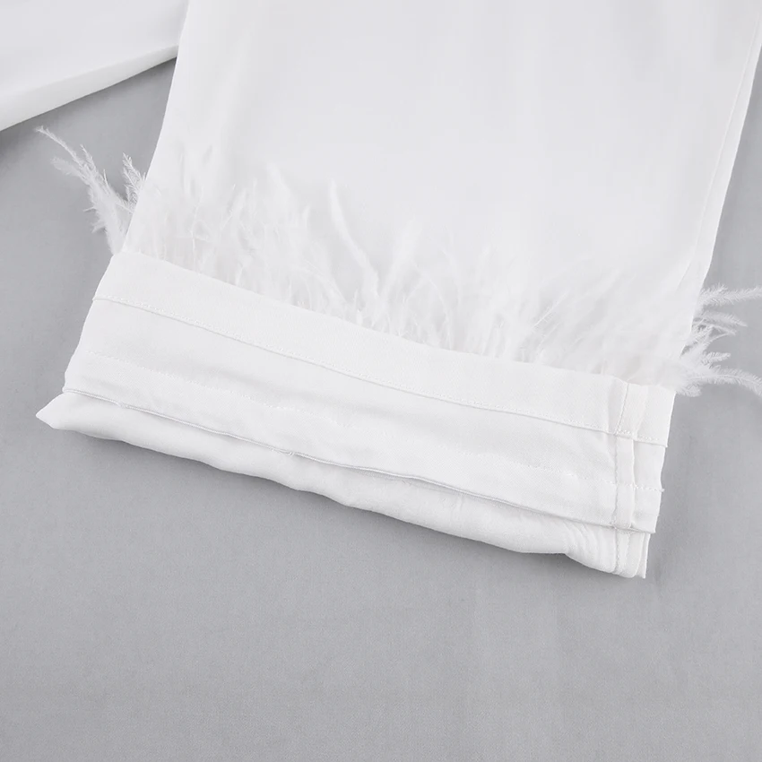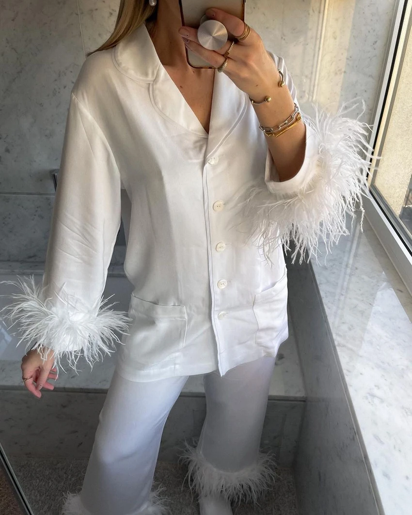 Yipinpay Feather Cuffs Pants Sets Of Two Fashion Pieces For Women Sleepwear Notched Shirts And Wide Leg Pant Homewear Outfits