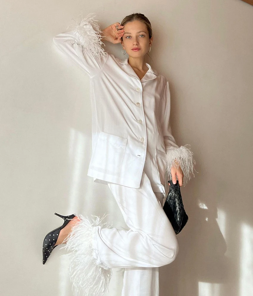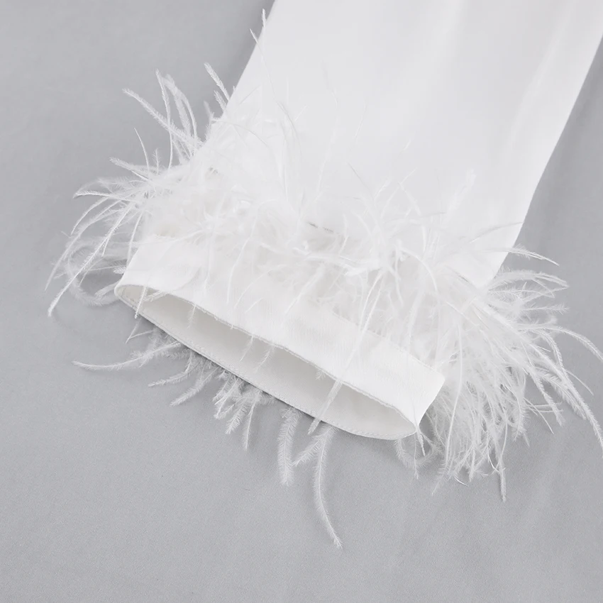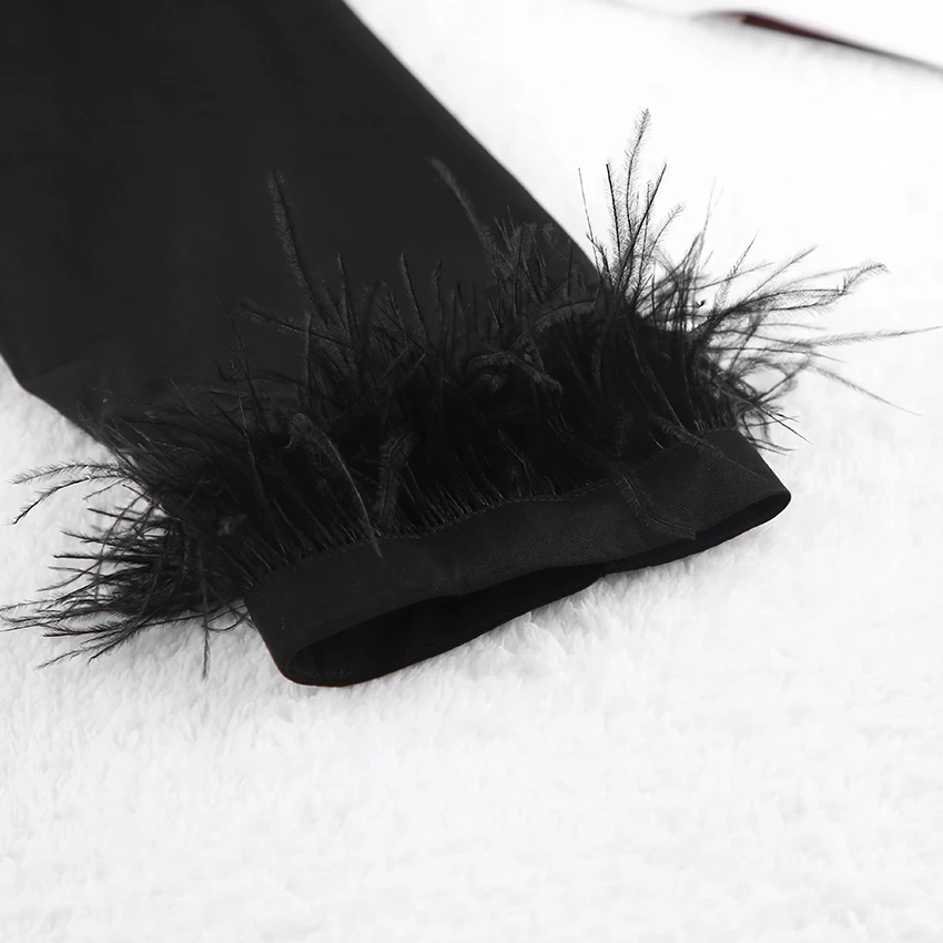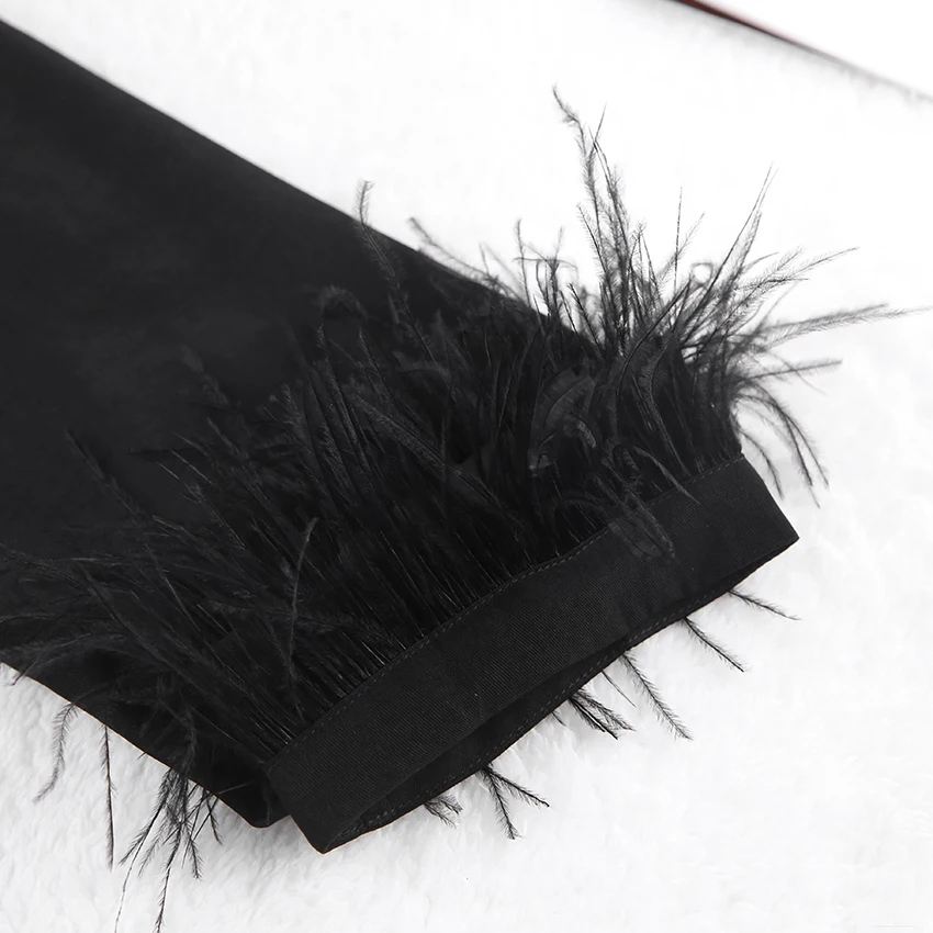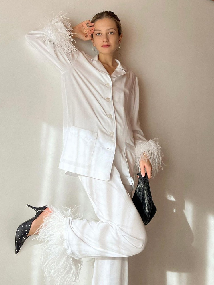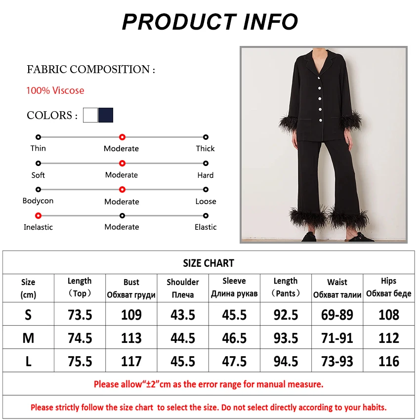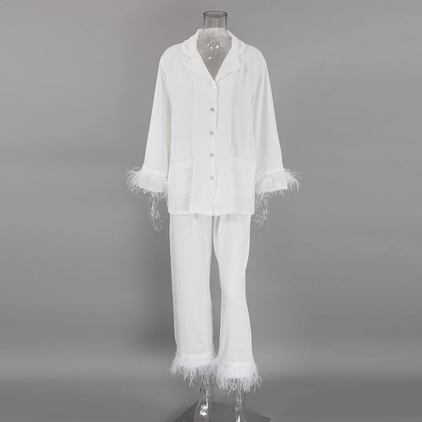 Yipinpay Feather Cuffs Pants Sets Of Two Fashion Pieces For Women Sleepwear Notched Shirts And Wide Leg Pant Homewear Outfits