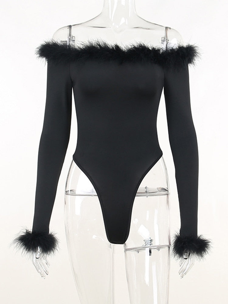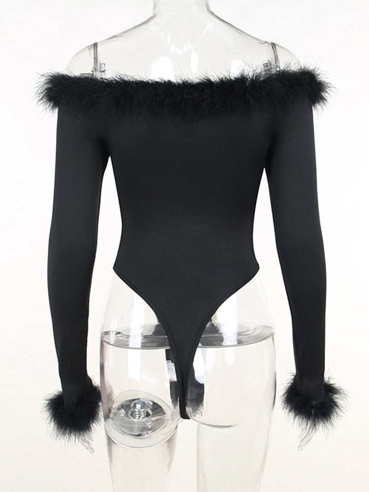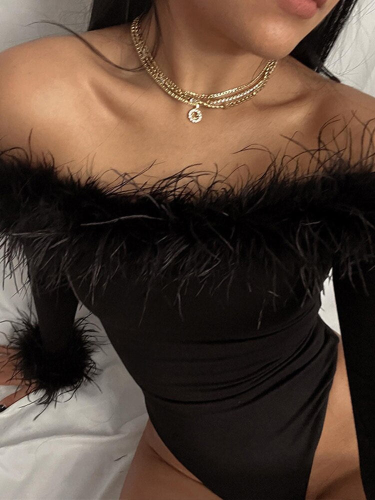 yipinpay Feather Top Long Sleeve T Shirt Women Off Shoulder Body Spring Fall Outfits Bodycon Solid Streetwear Black Bodysuits